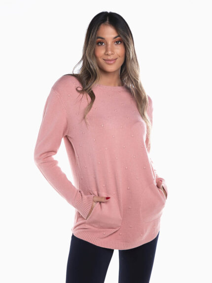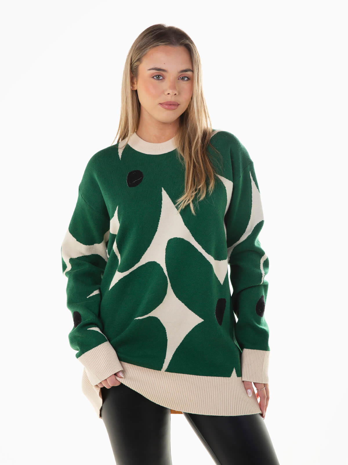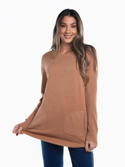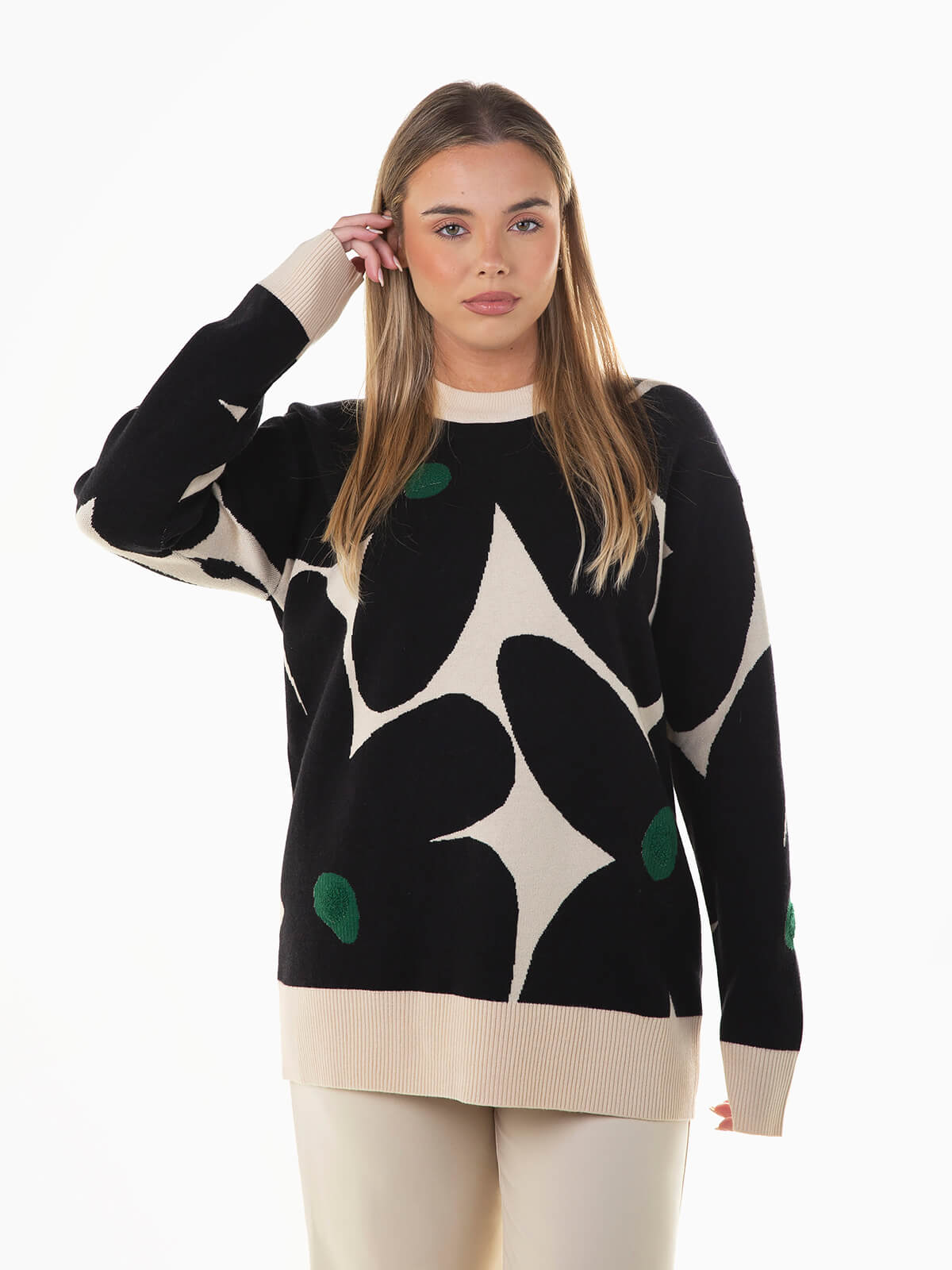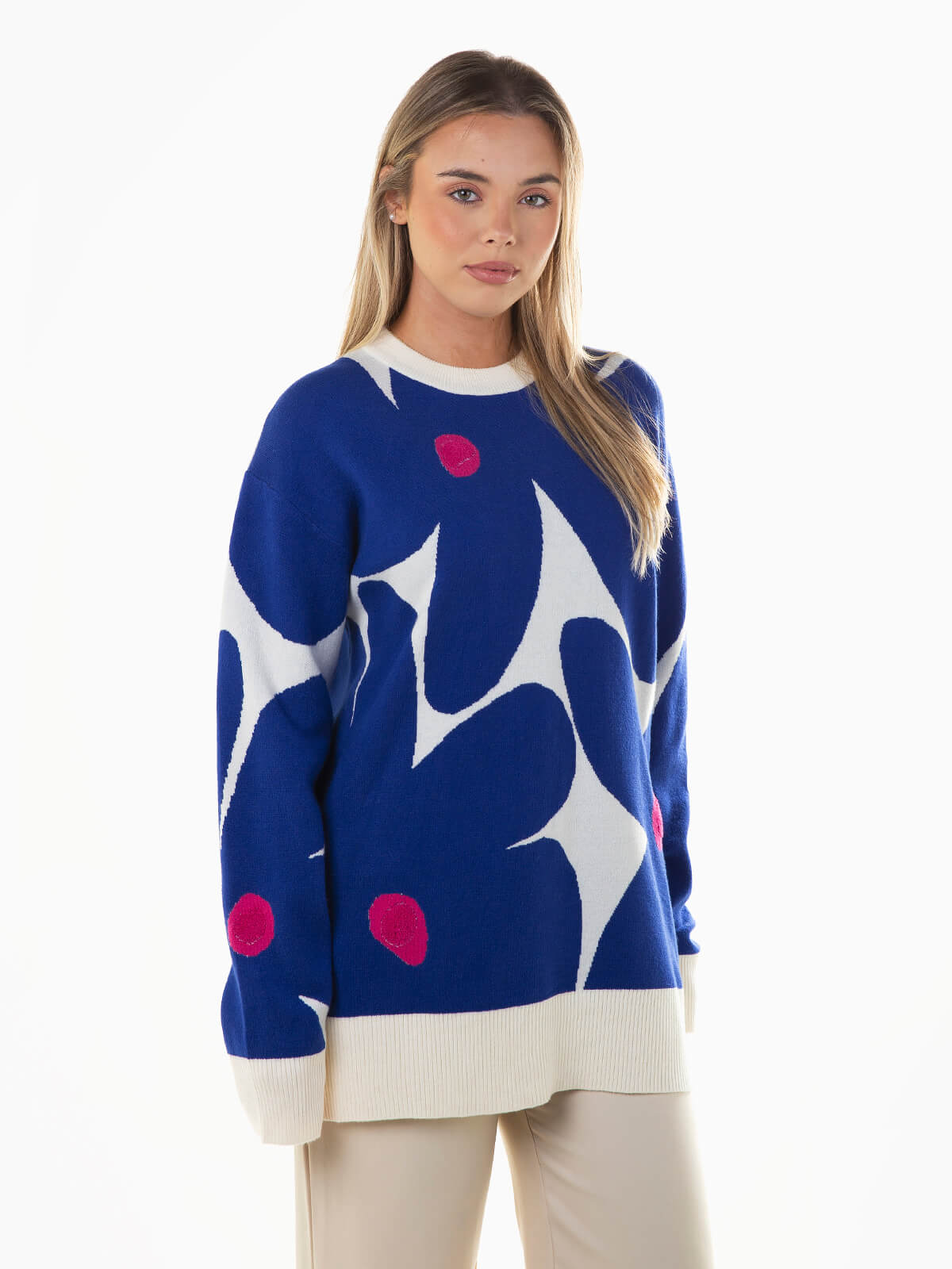 Camisola de malha com mistura viscose para maior conforto. Camisola oversize manga comprida com flores. Decote redondo e acabamentos canelados.