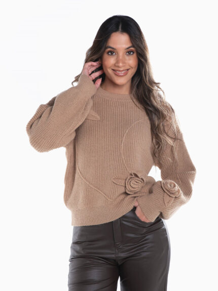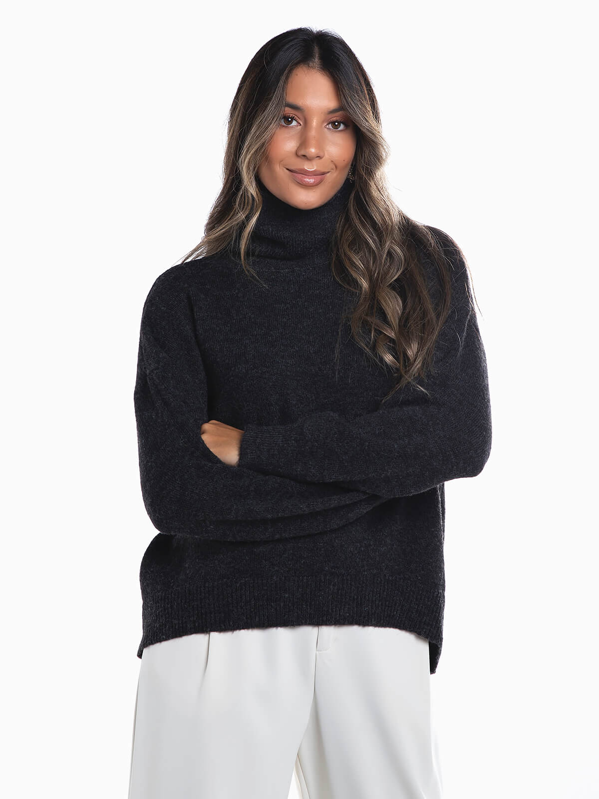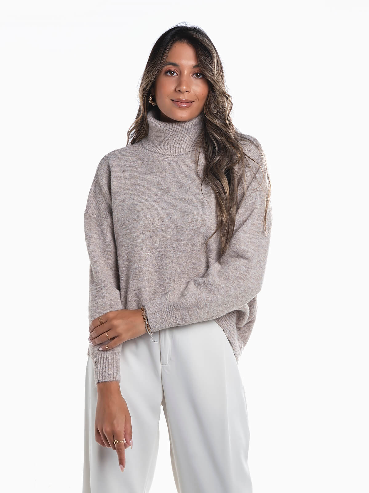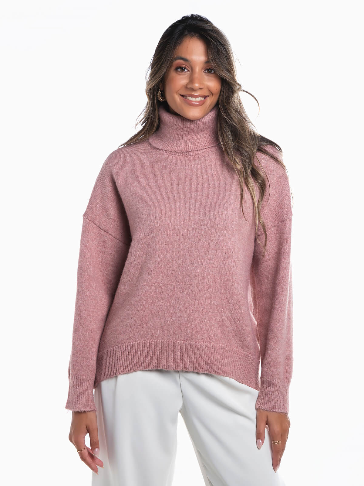 Camisola oversize em malha com mistura de lã. Camisola manga comprida com gola alta dobrada. Acabamentos canelados.