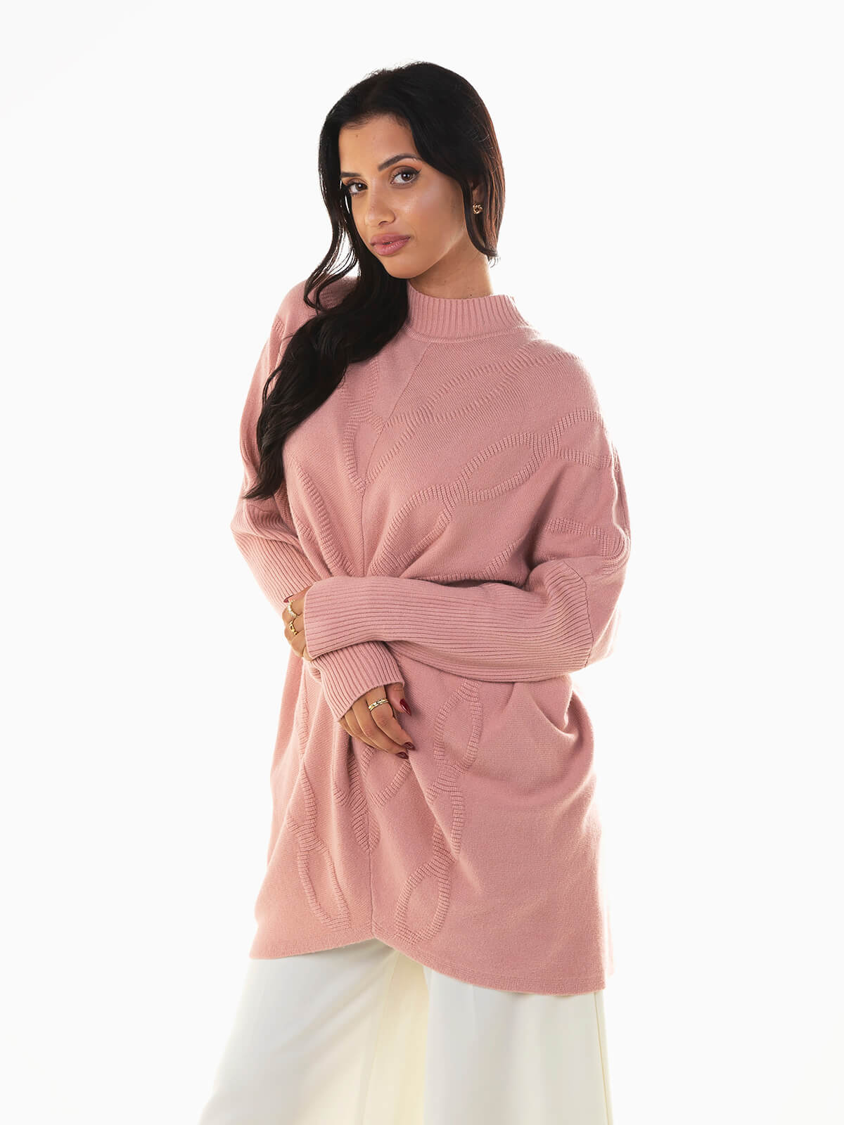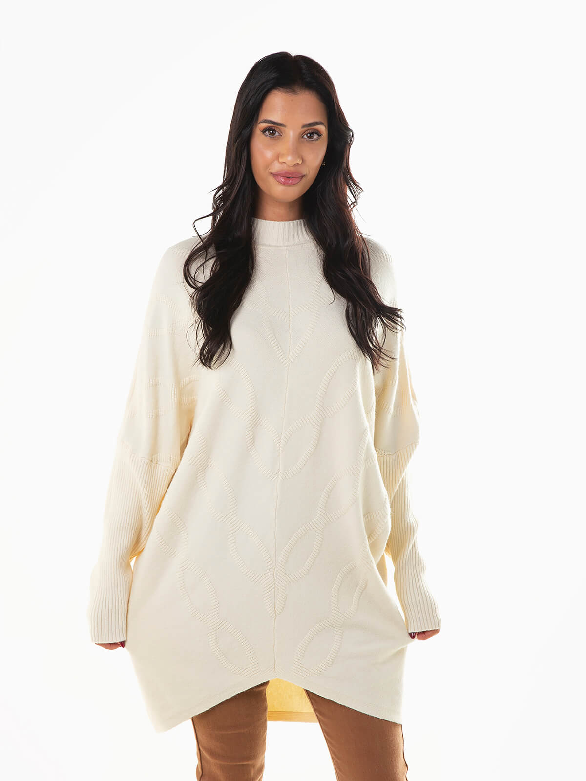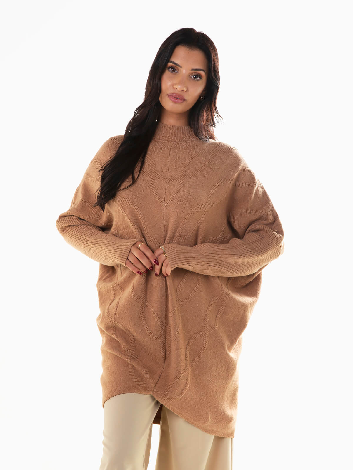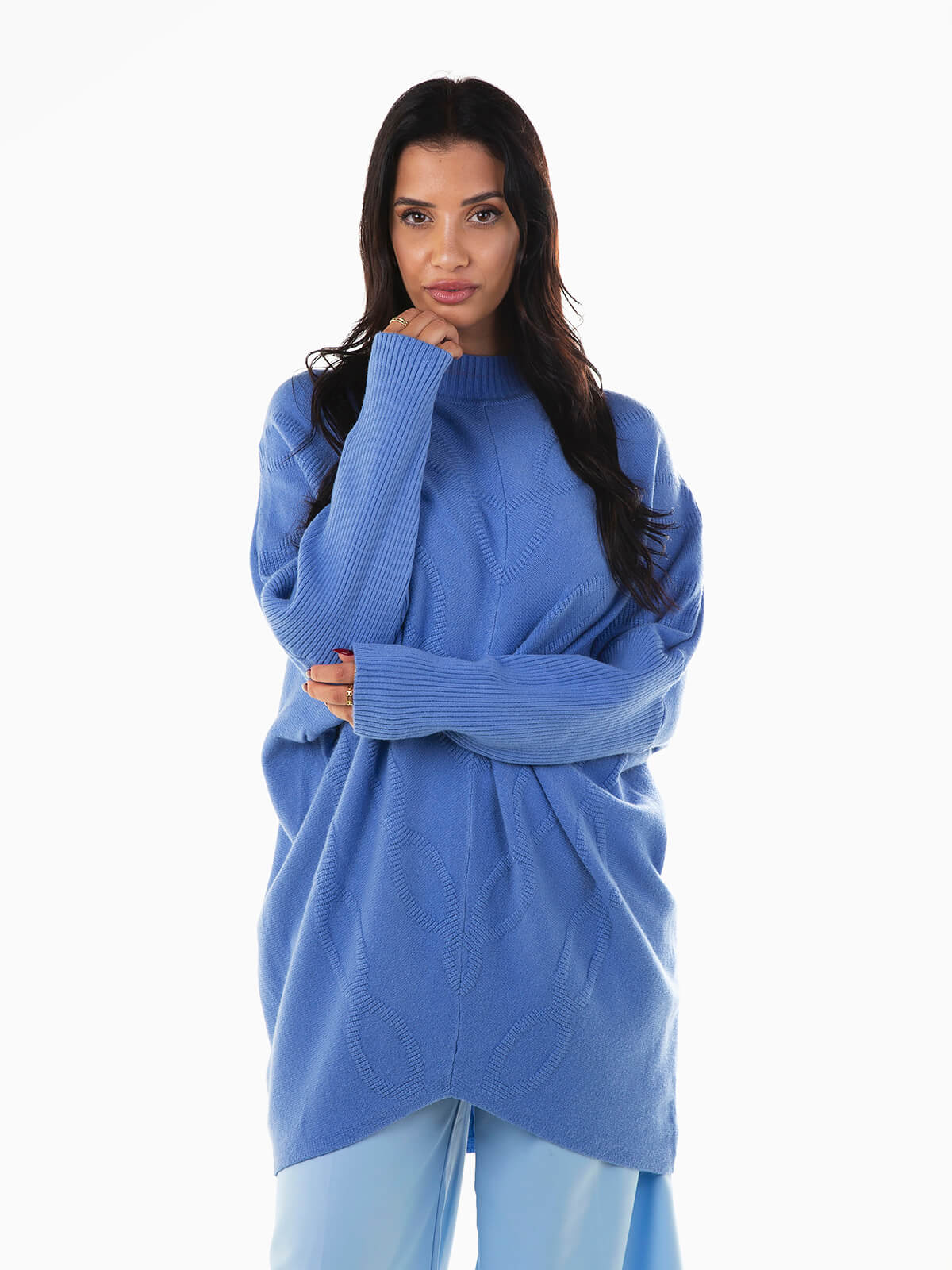 Camisola de malha oversize com manga morcego e cós assimétrico. Camisola estruturada com gola perkins e pormenores canelados.