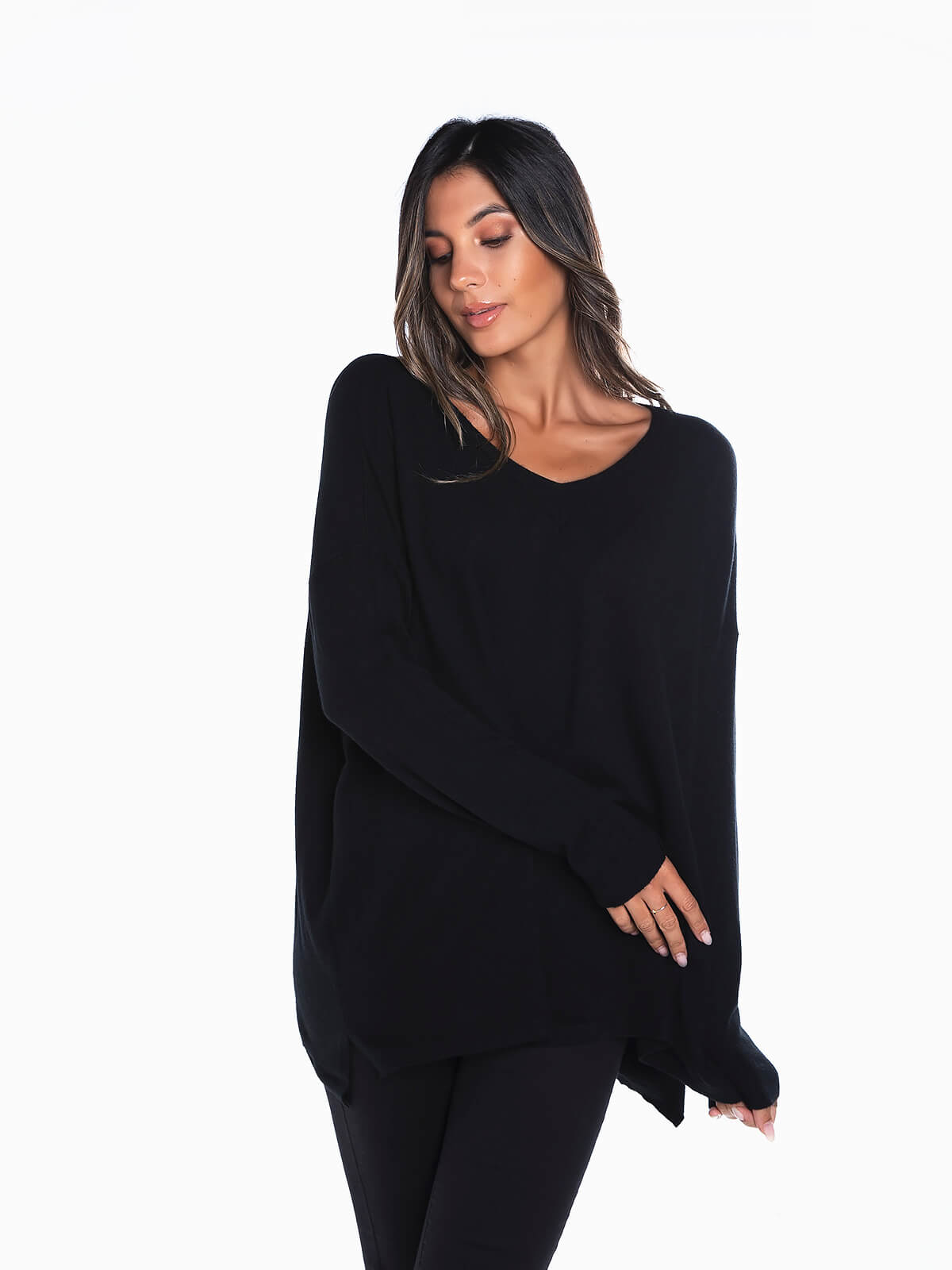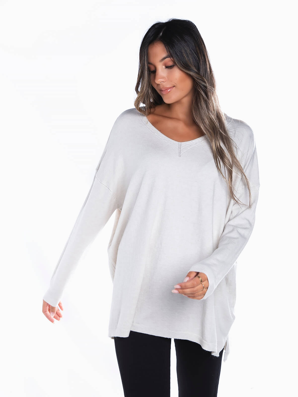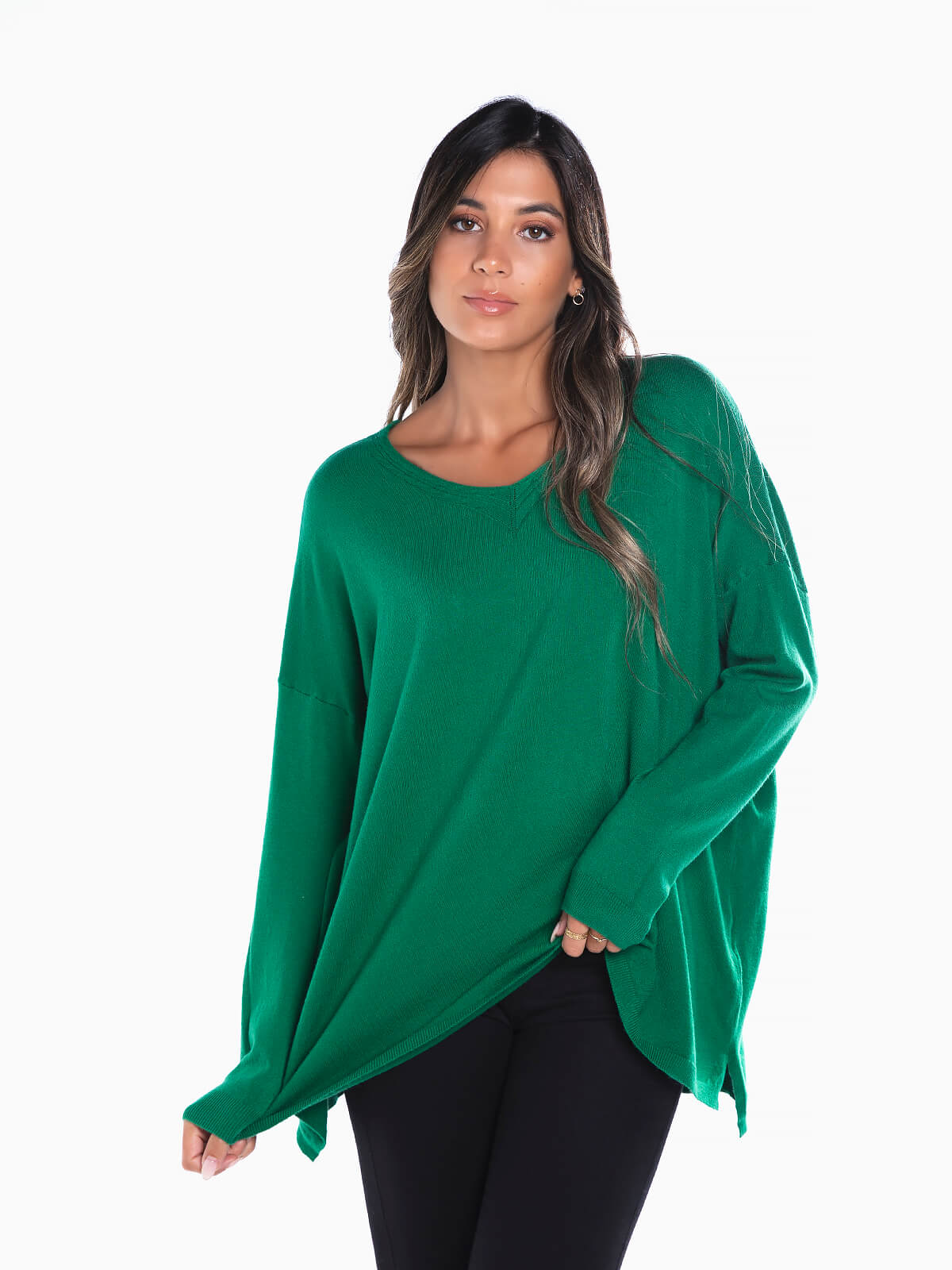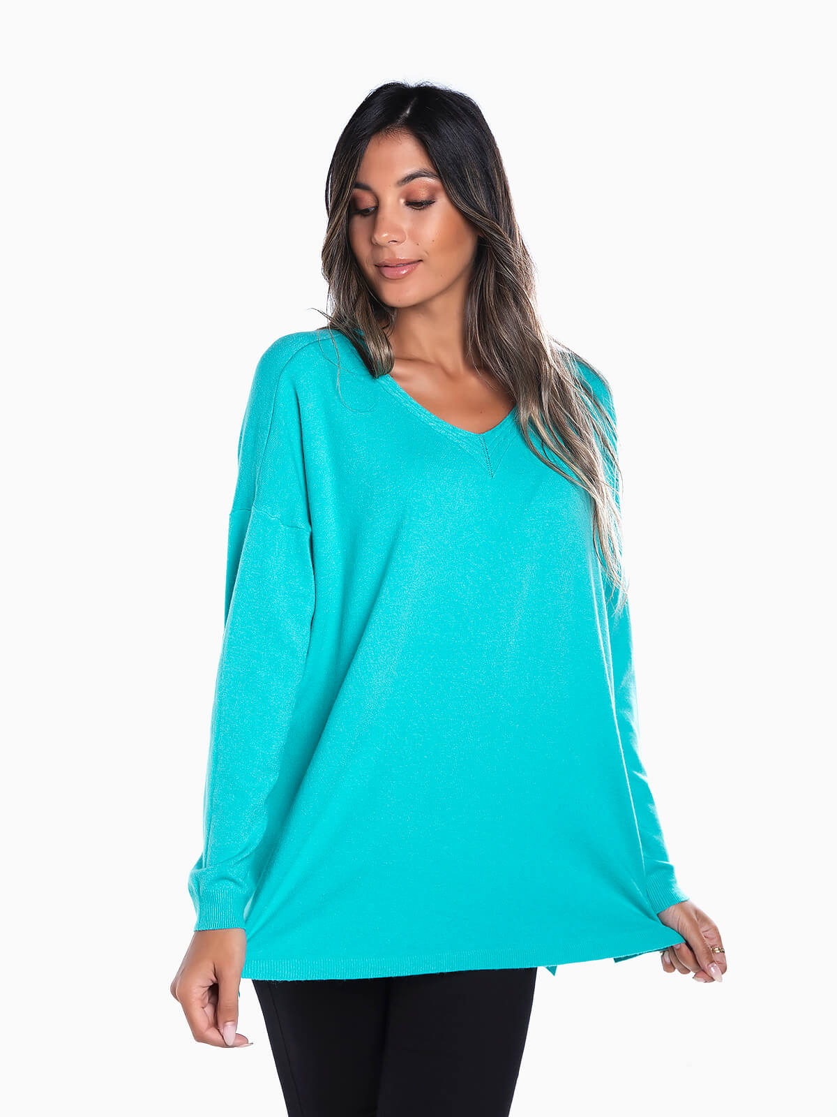Camisola de malha oversize para senhora. Camisola de manga comprida com decote em bico. Aberturas laterais na base. Malha de cabo no decote. Acabamentos canelados.