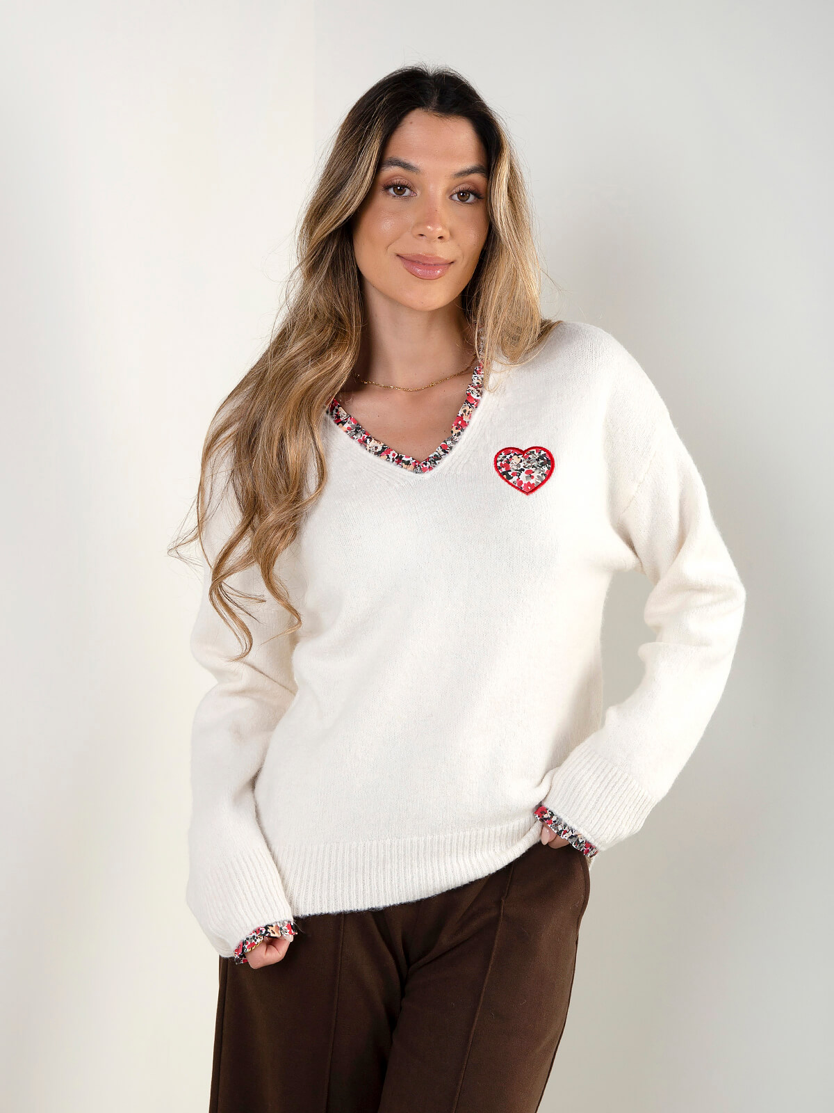 Camisola de malha com decote em V, manga comprida e detalhes em tecido floral no decote e nos punhos. Destaca-se pela aplicação de coração bordado no peito, que acrescenta um toque feminino e atual à peça.