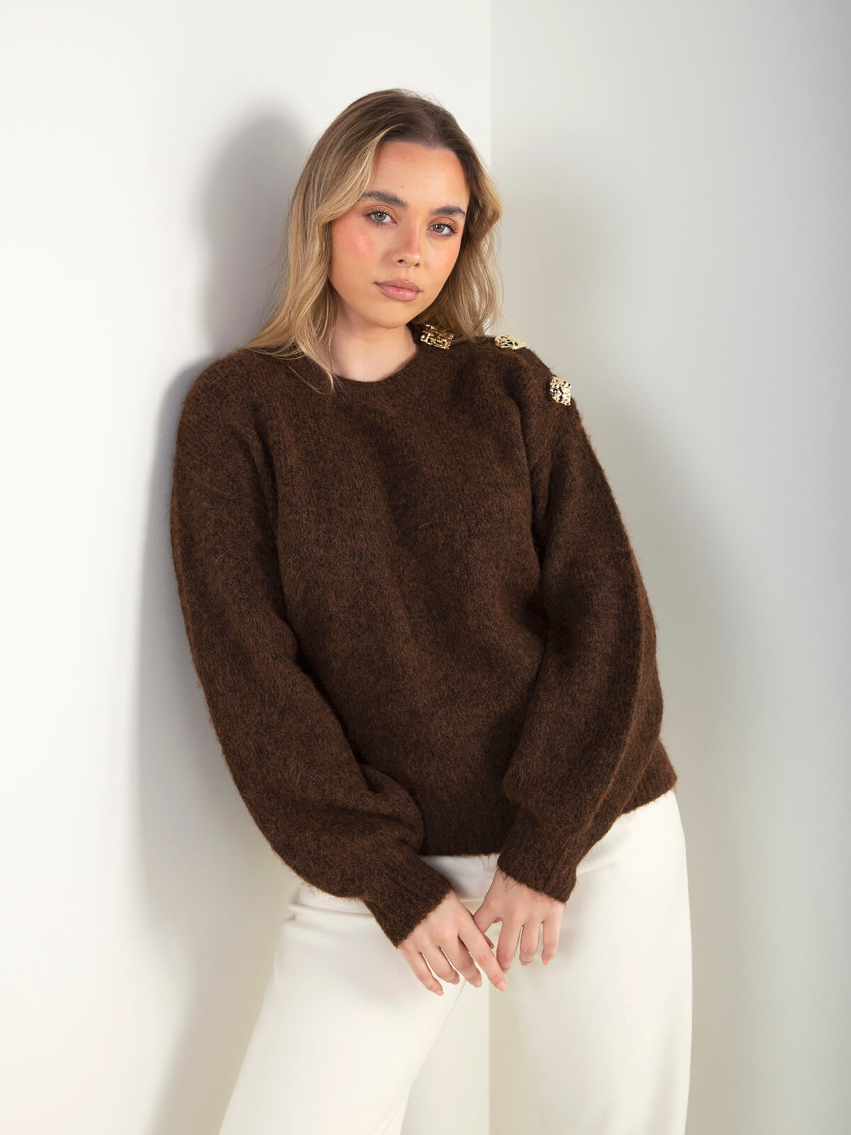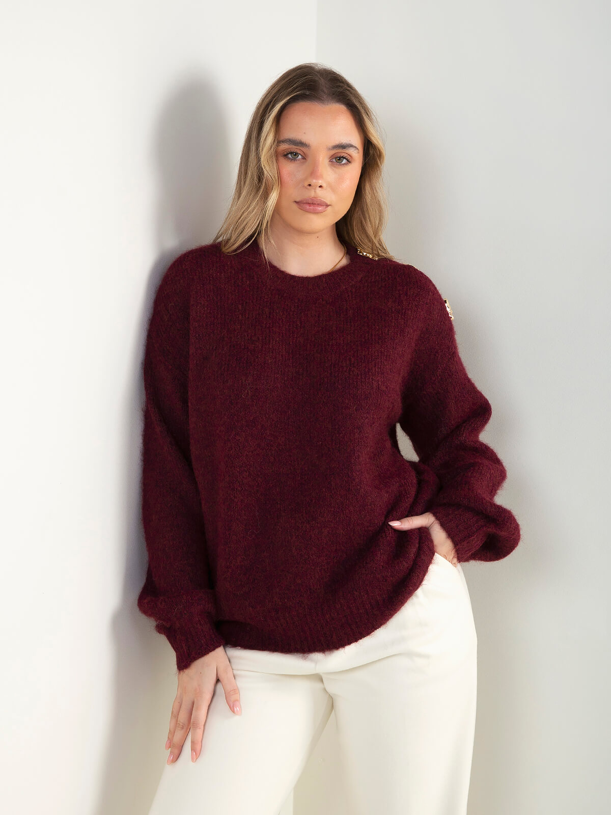 Camisola de malha oversized com mistura de lã, ideal para os dias frios. Modelo de corte solto, com botões decorativos no ombro que acrescentam detalhe ao design. Confortável e versátil, adapta-se facilmente a looks casuais ou mais cuidados com calças de alfaiataria ou ganga.
