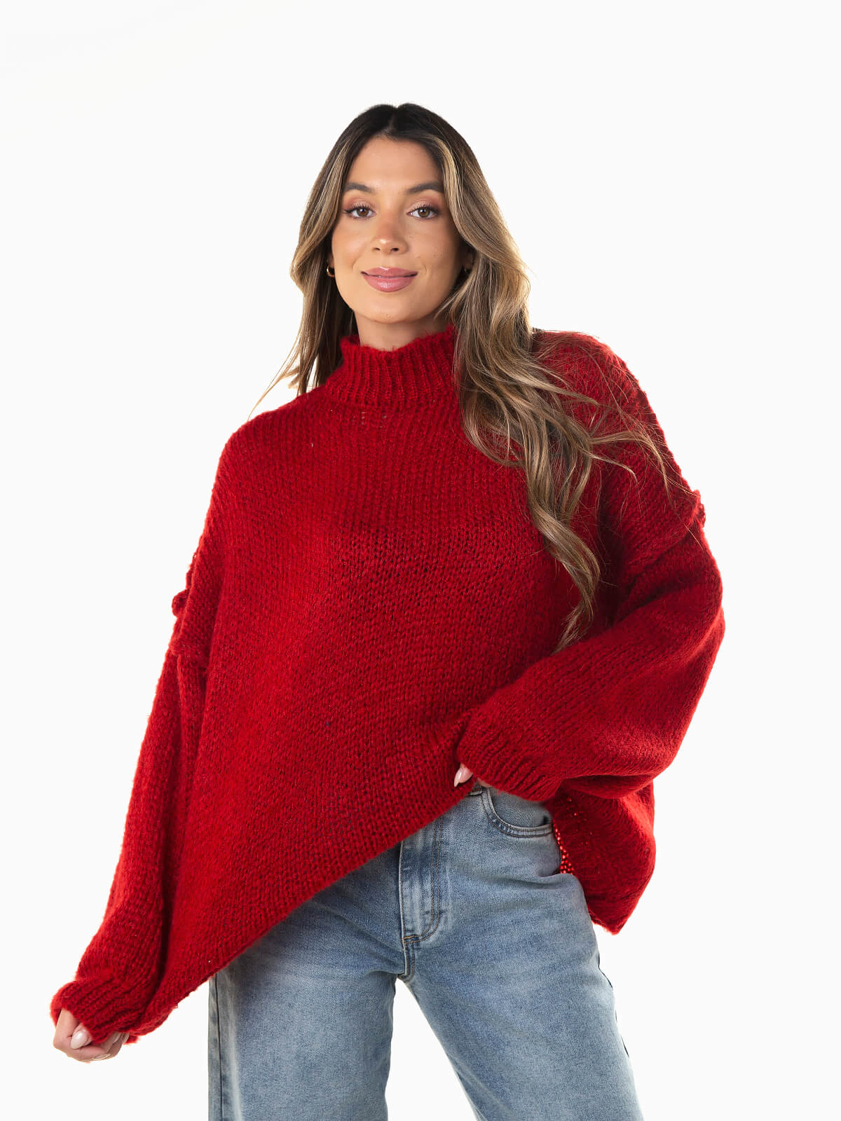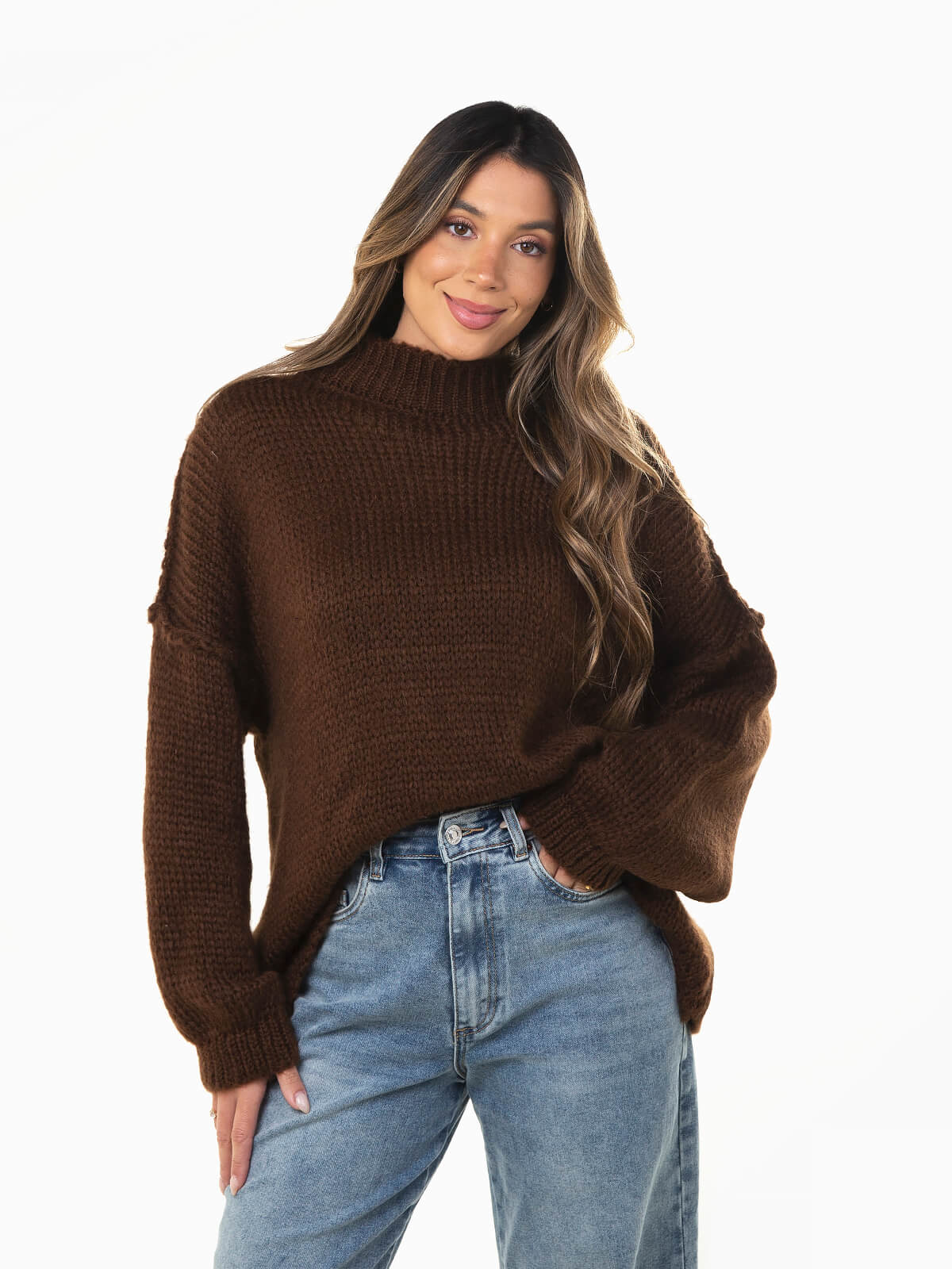Camisola de malha oversized com gola subida. Confortável e com um ligeiro efeito perfurado, ideal para um look em camadas. Modelo amplo, quente e fácil de combinar no dia a dia.