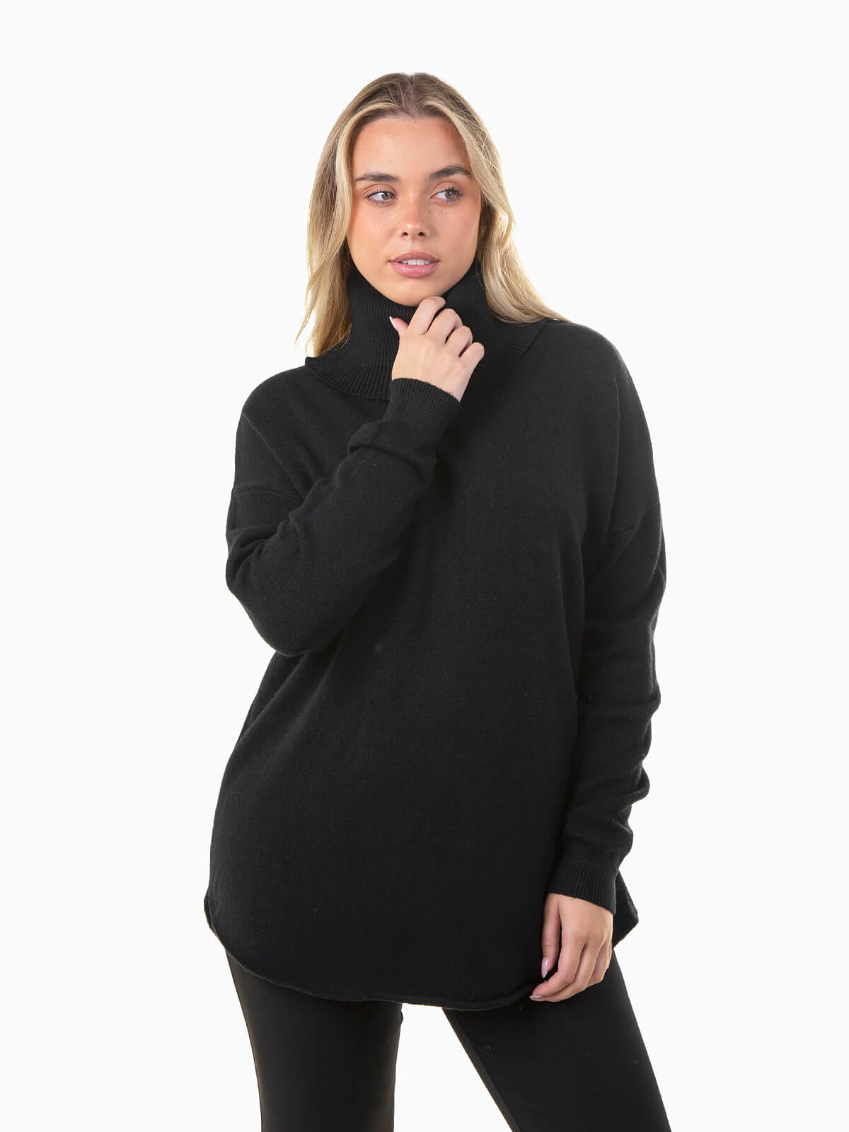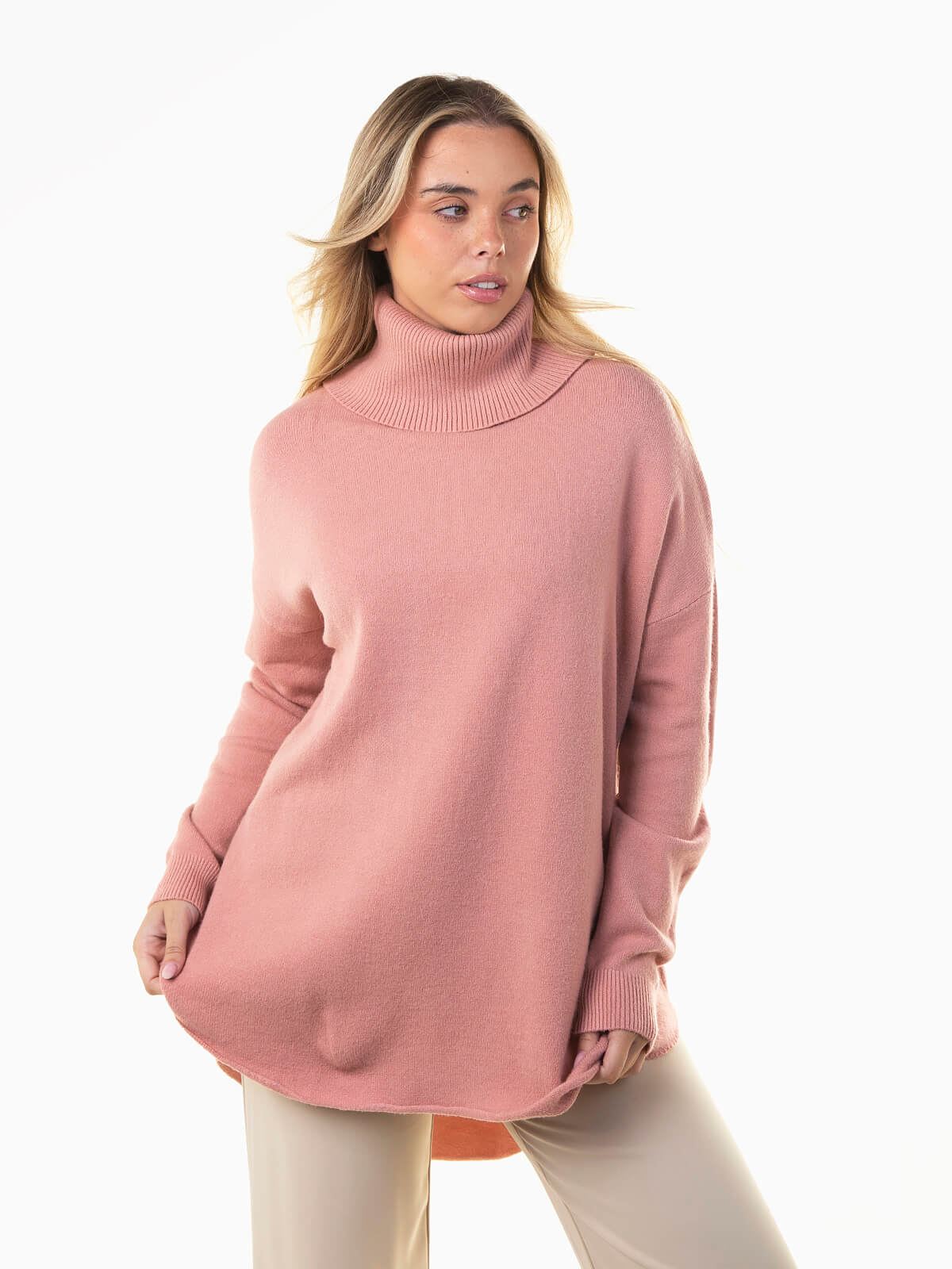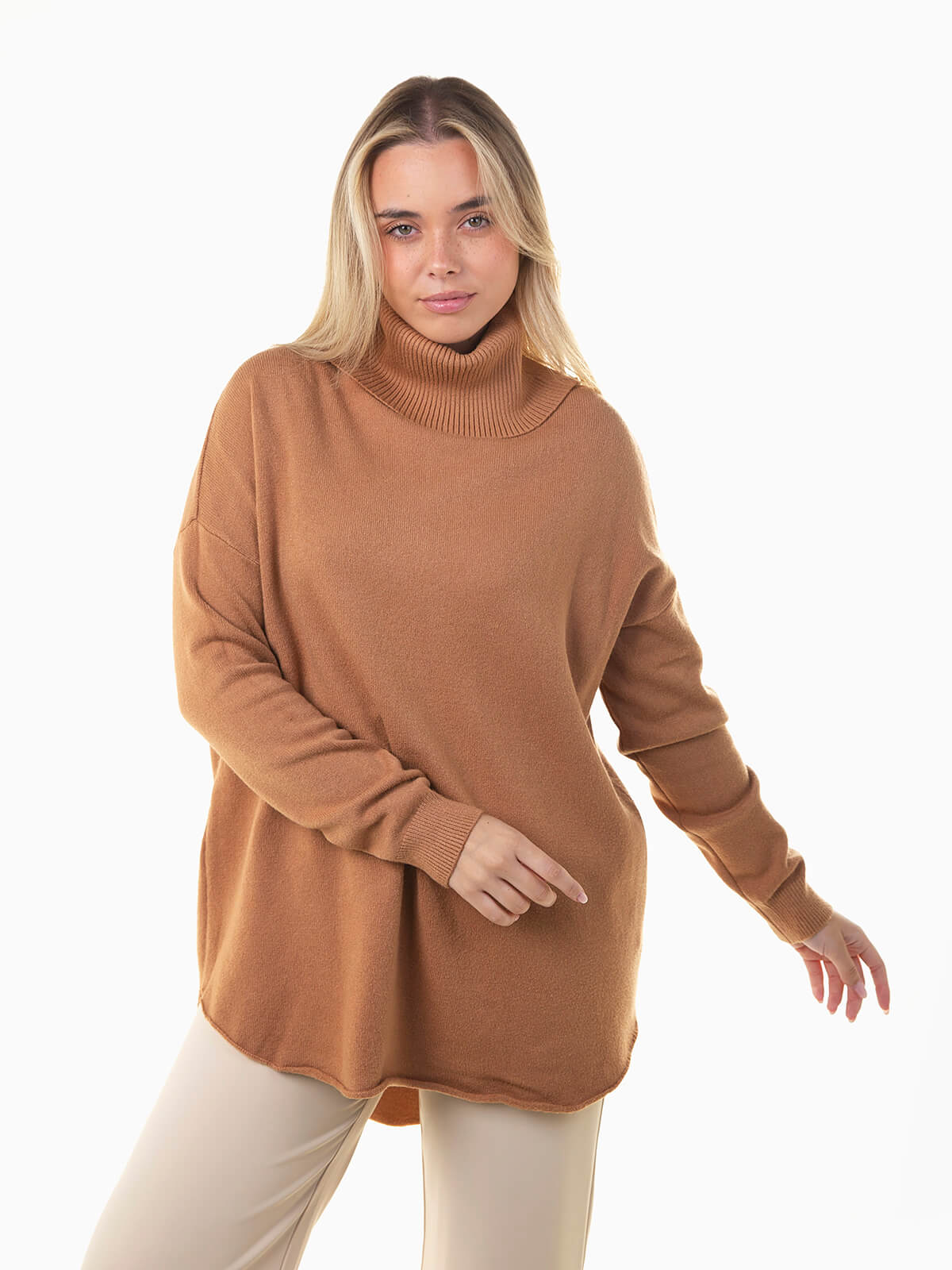Camisola oversized em malha para mulher, com gola alta dobrada e acabamentos canelados. O cós arredondado, mais comprido atrás, adiciona estilo e conforto, tornando esta peça perfeita para looks casuais e modernos.