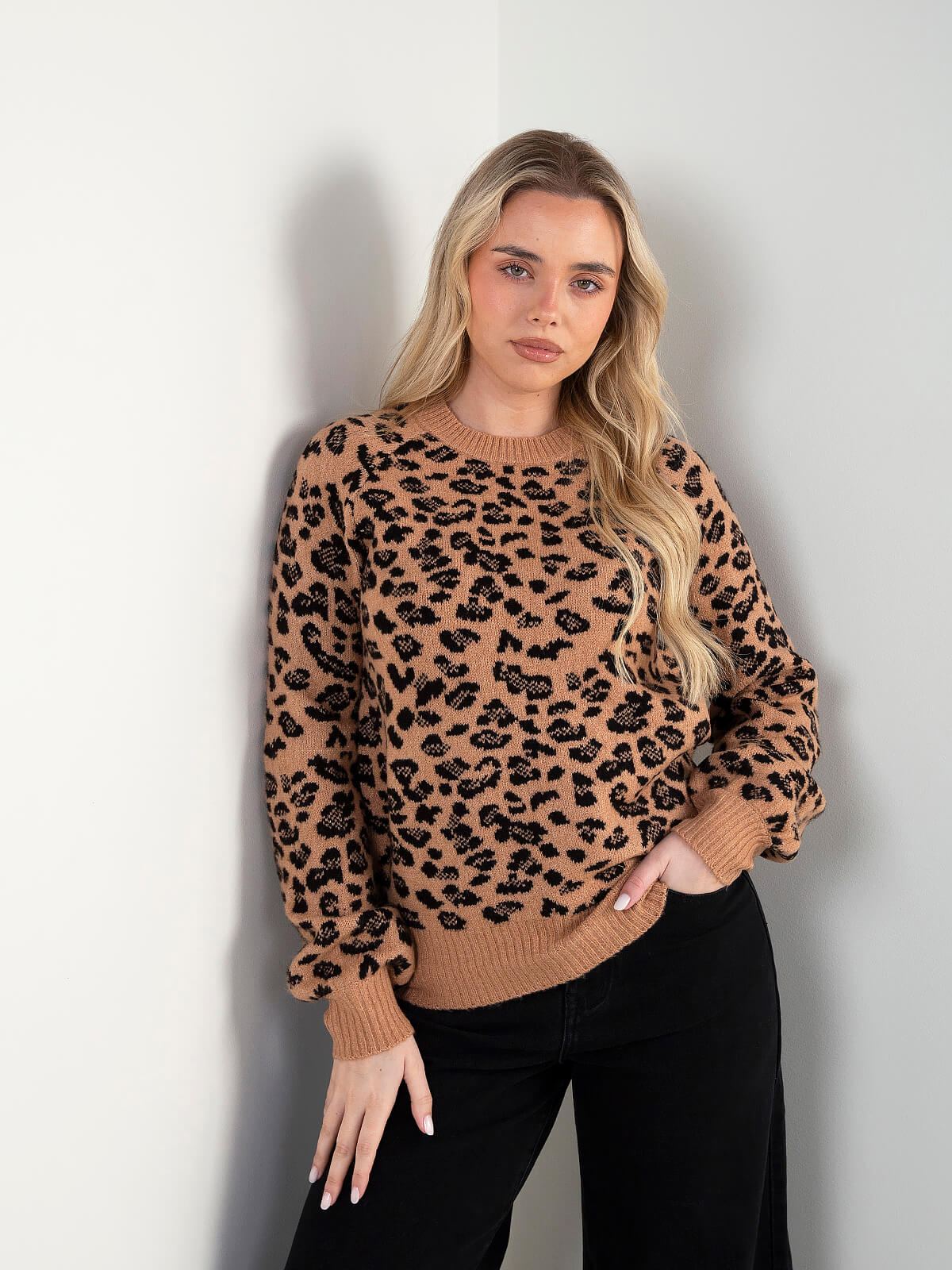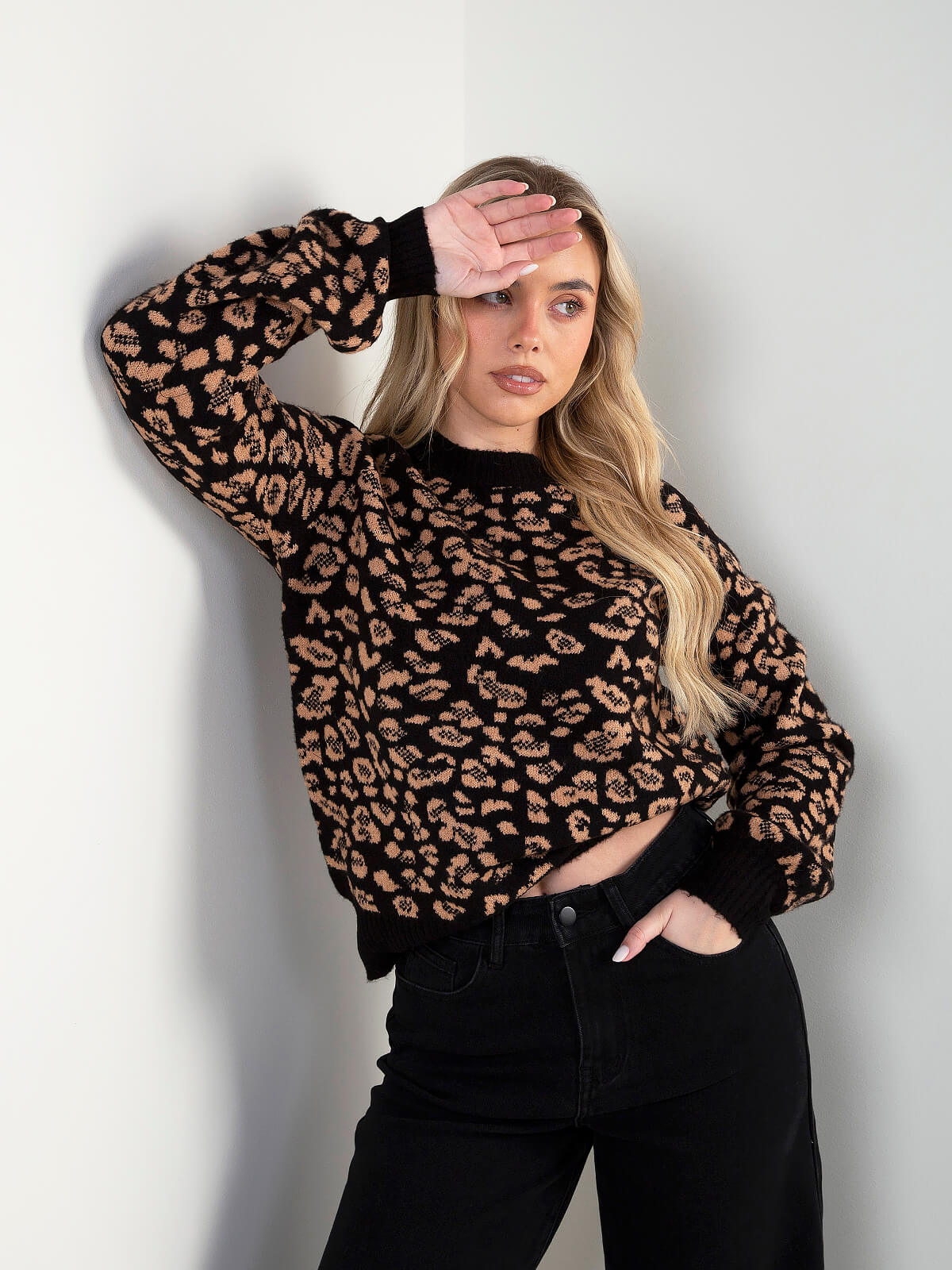 Camisola de malha com decote redondo e acabamentos canelados. Modelo com padrão animal print e estrutura confortável. Ideal para conjugar com jeans, calças de alfaiataria ou saias lisas.