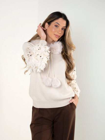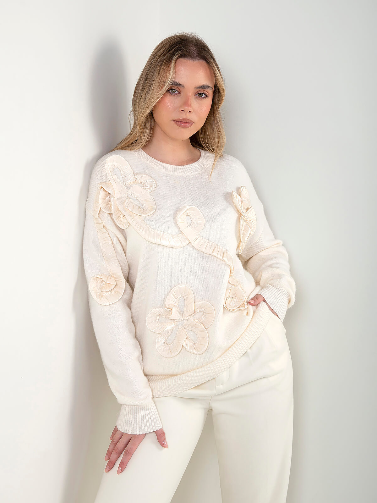 Camisola de malha em tom pérola, com aplicações florais em relevo na parte frontal e mangas. Modelo de toque macio, manga comprida e gola redonda. Uma peça delicada e elegante, ideal para elevar looks do dia a dia com um detalhe diferenciador.