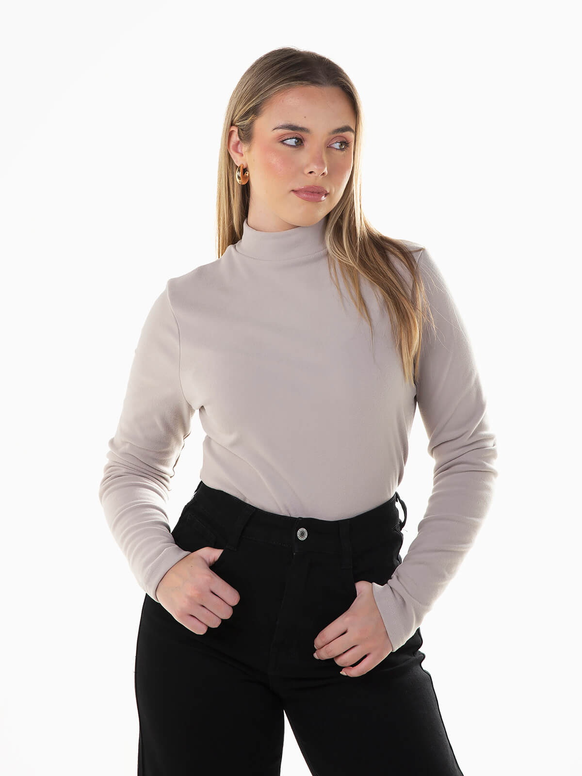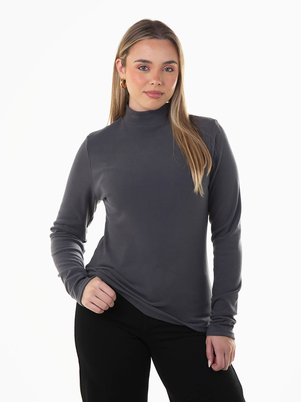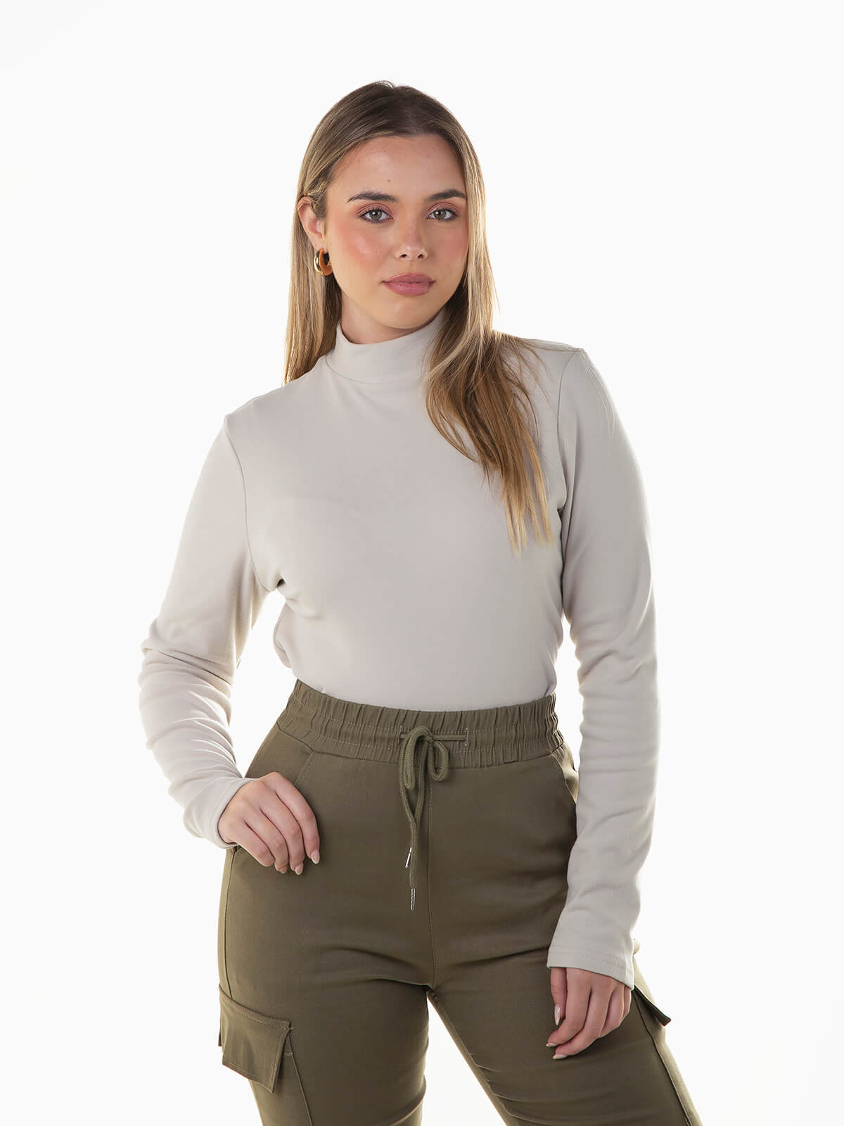 Camisola em malha polar para maior conforto térmico. Camisola elástica de manga comprida para mulher com gola perkins.
