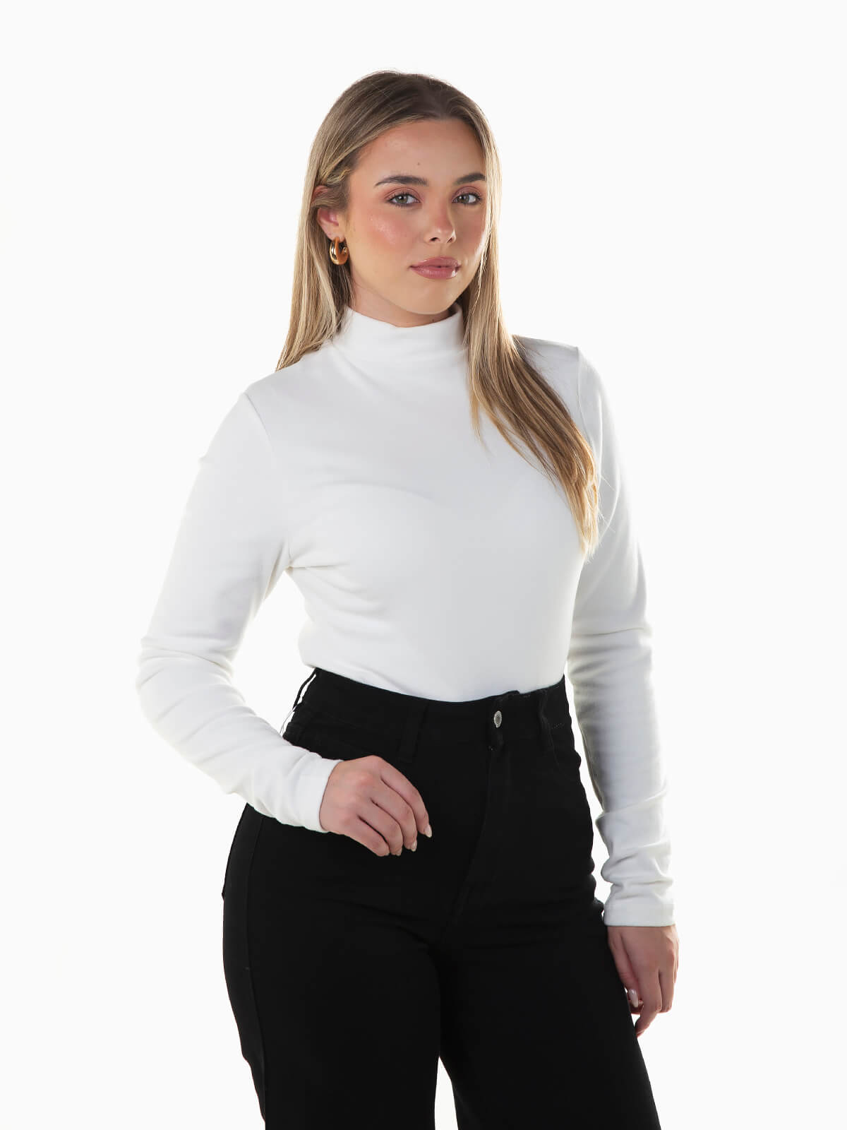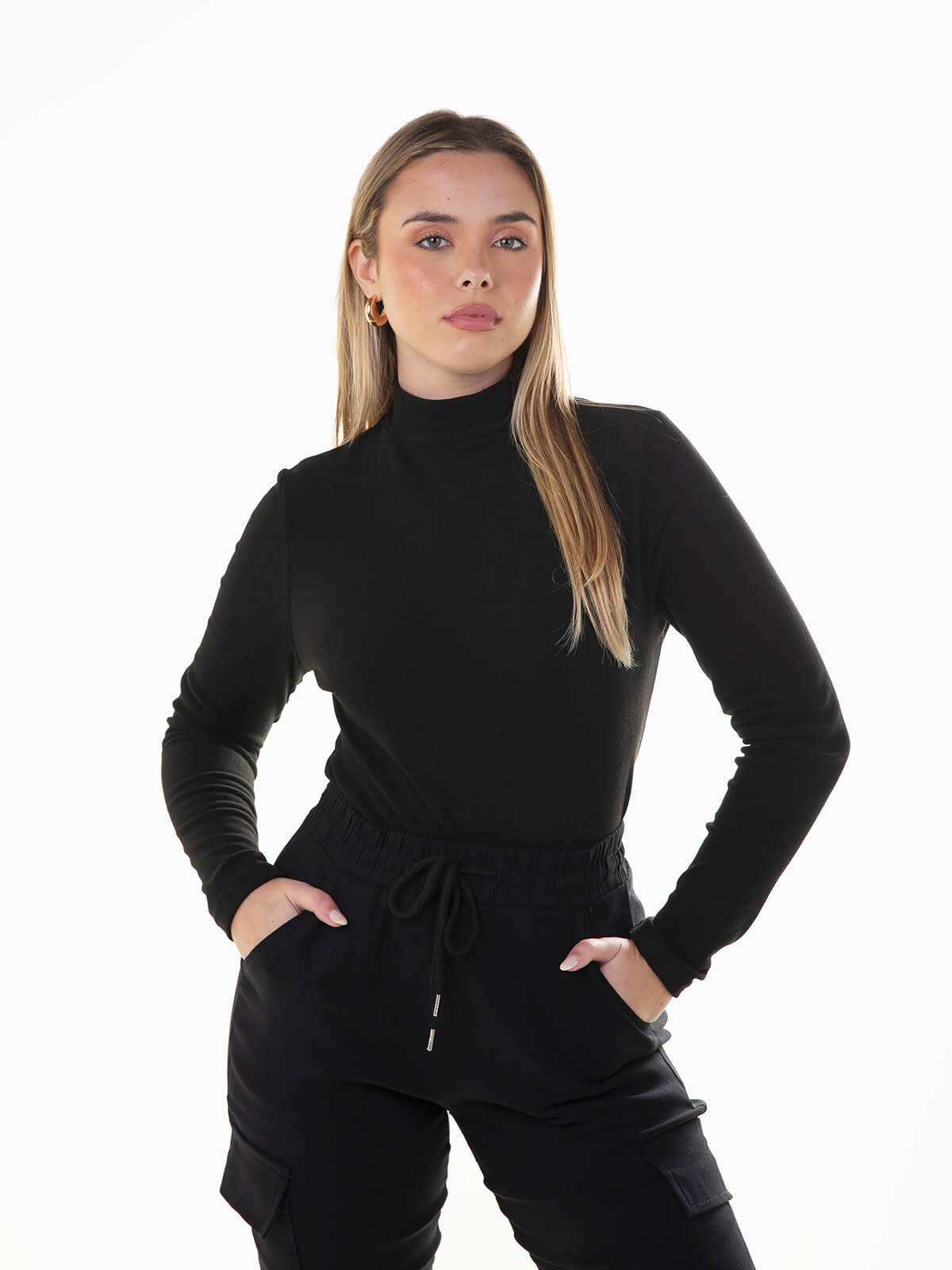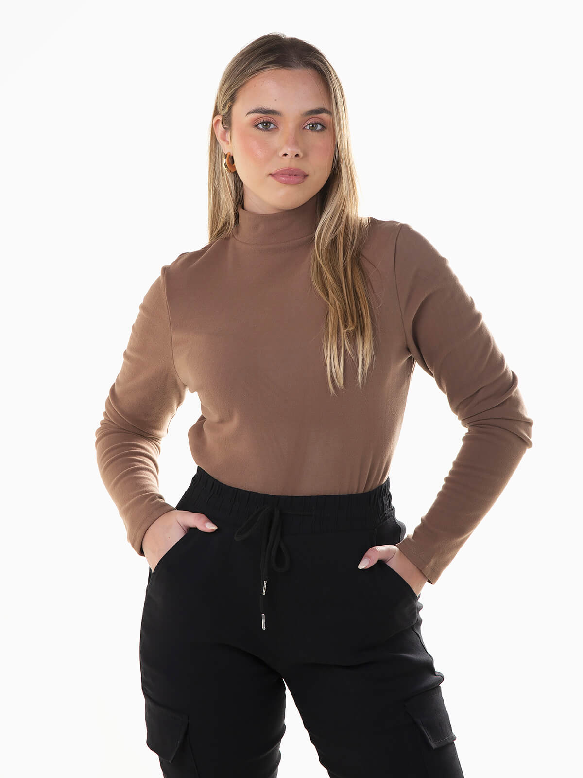 Camisola em malha polar para maior conforto térmico. Camisola elástica de manga comprida para mulher com gola perkins.