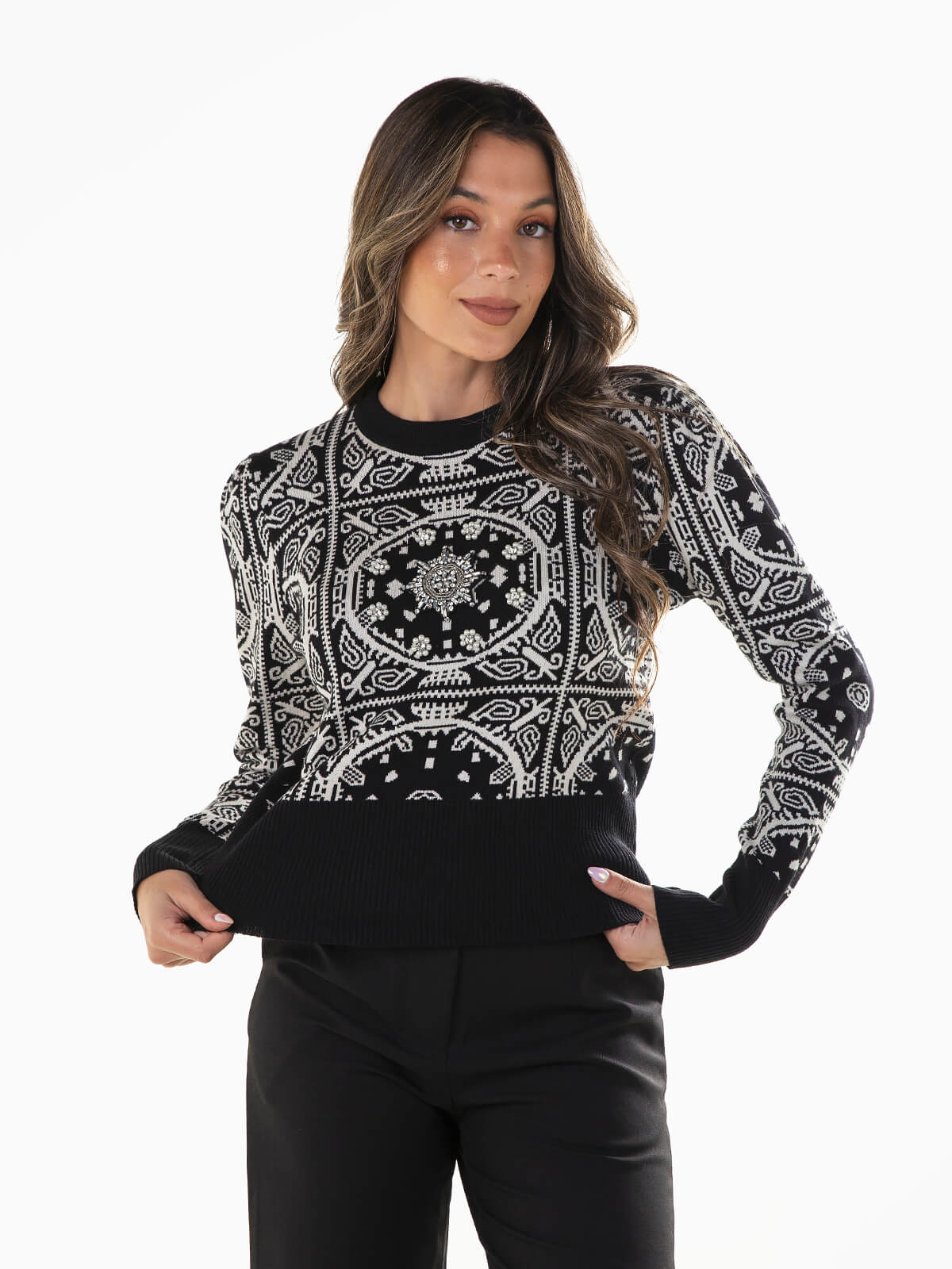 Camisola malha jacquard preta com aplicações de pérolas e brilhantes. Camisola de manga comprida com acabamentos canelados. Decote redondo.