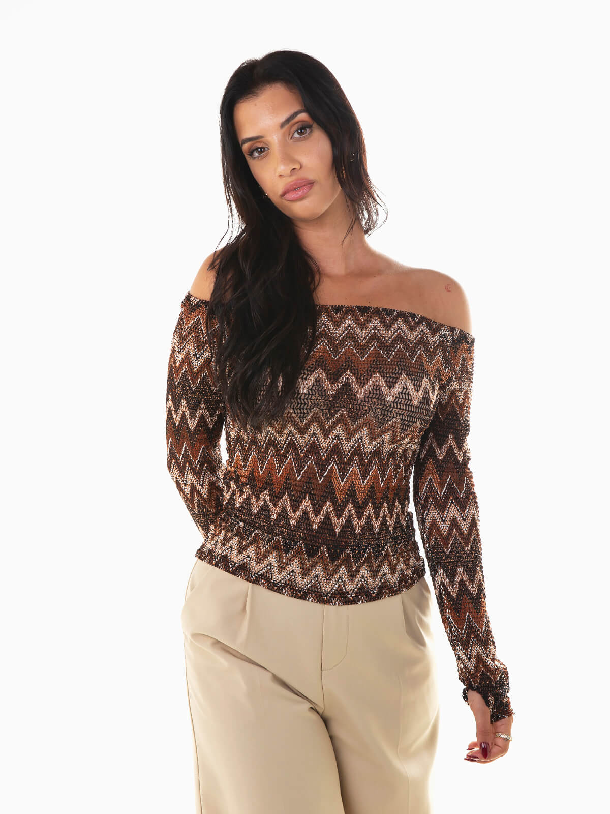 Camisola em malha de rede com geométrico colorido para senhora. Camisola elástica de manga comprida com decote barco. Abertura para o polegar para um toque moderno.