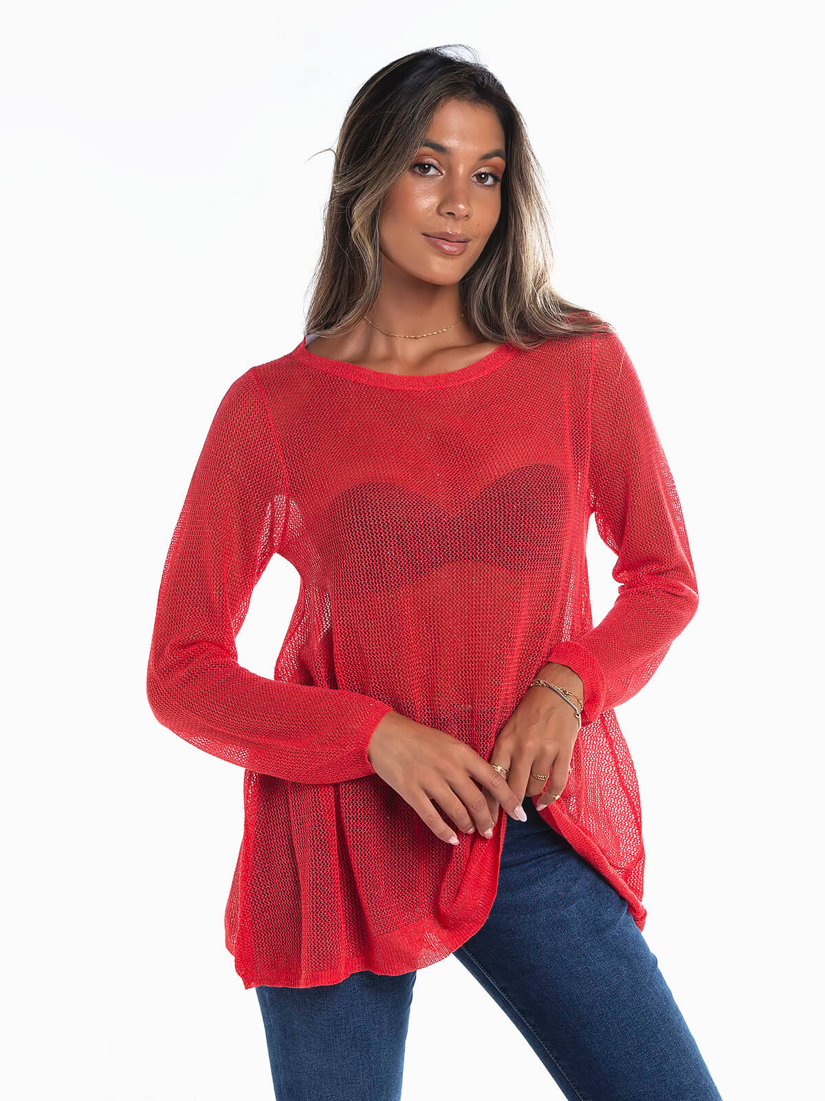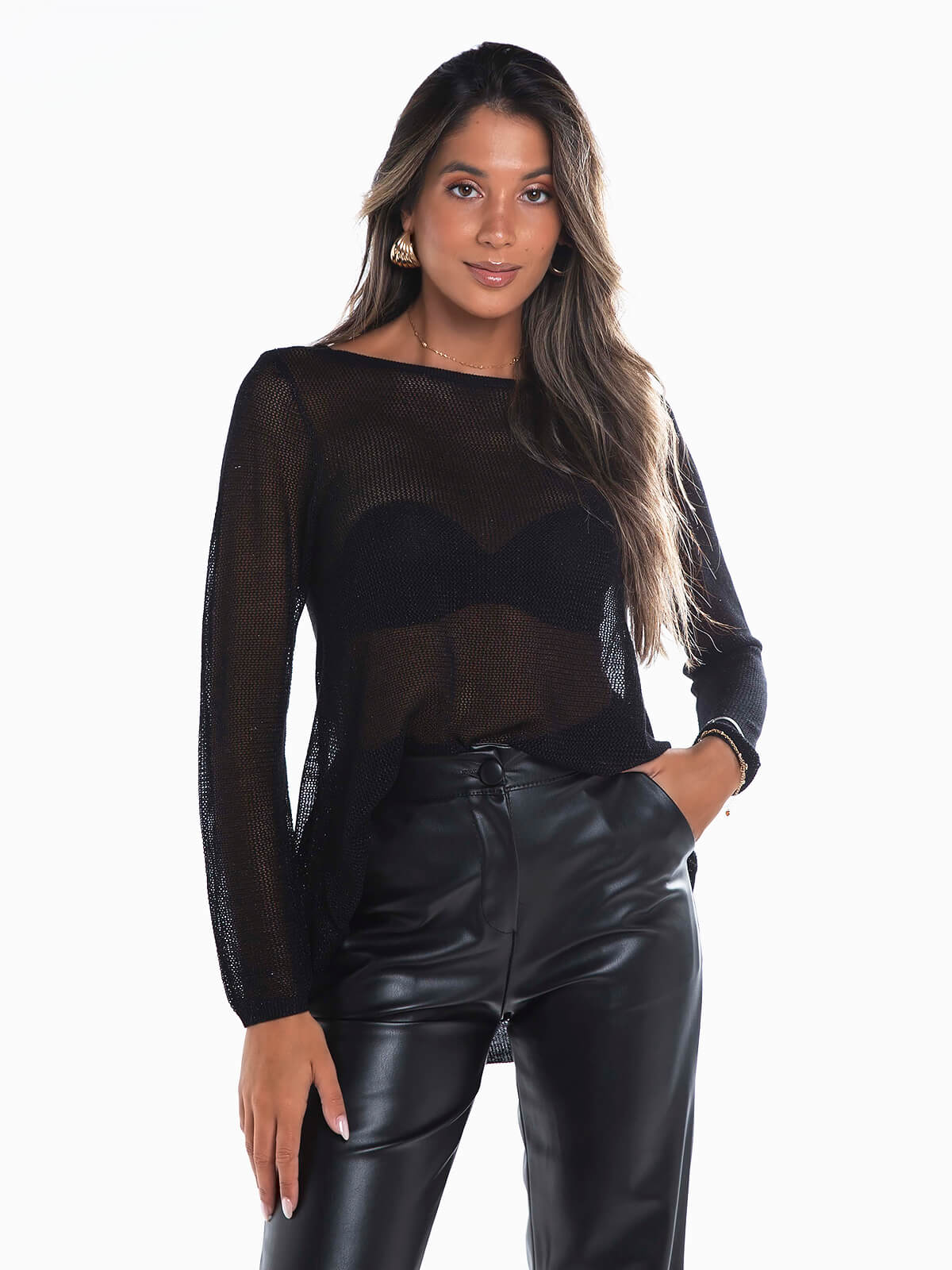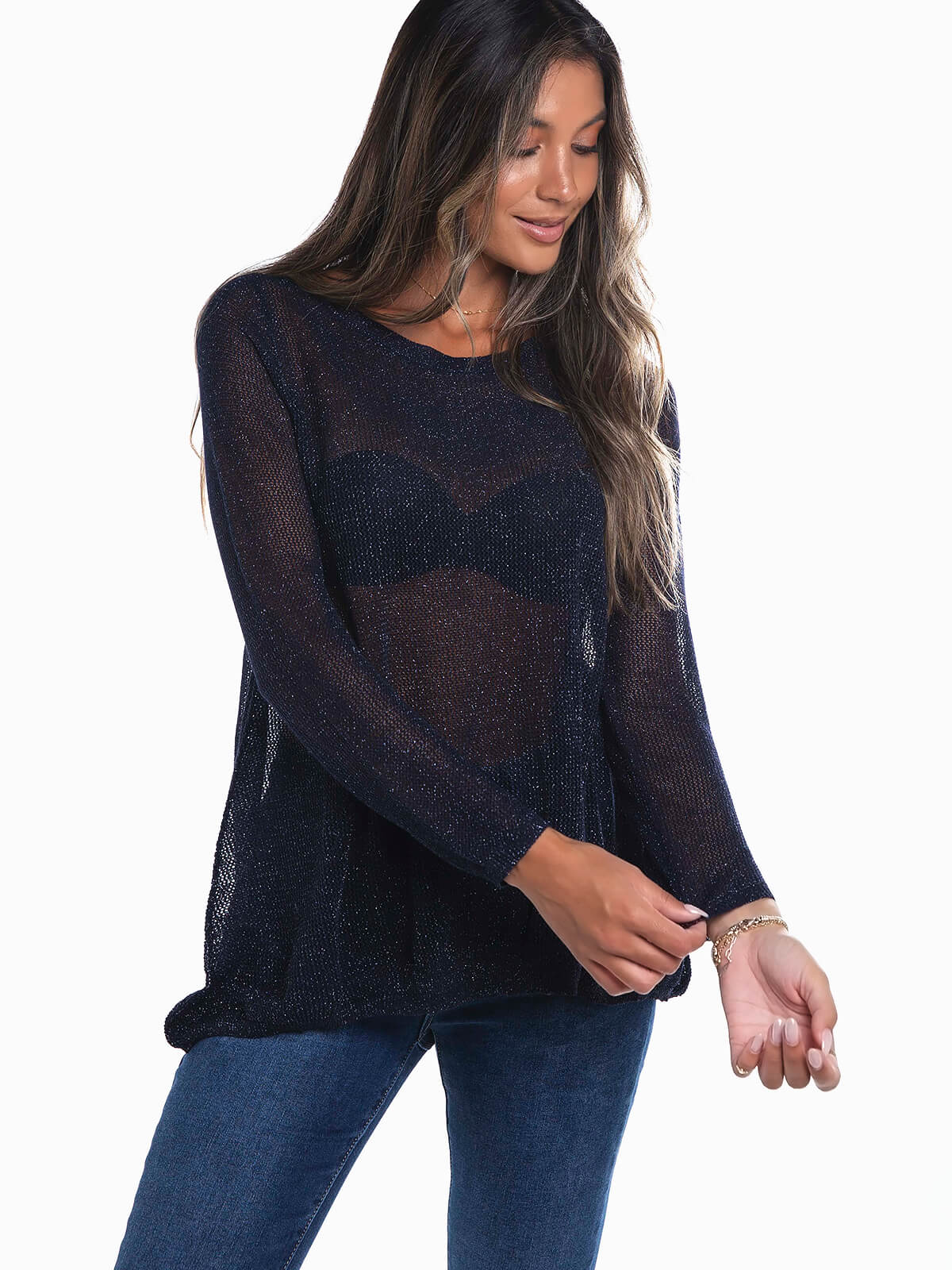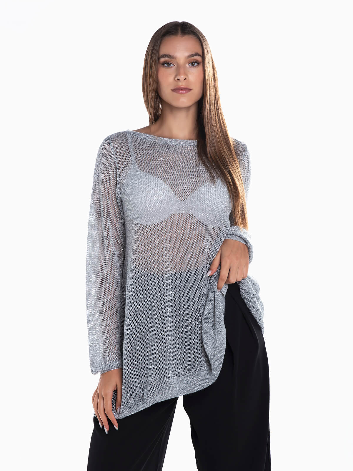 Camisola de malha rendilhada com fios lurex para efeito brilhante. Camisola de manga comprida com decote redondo. Corte comprido.