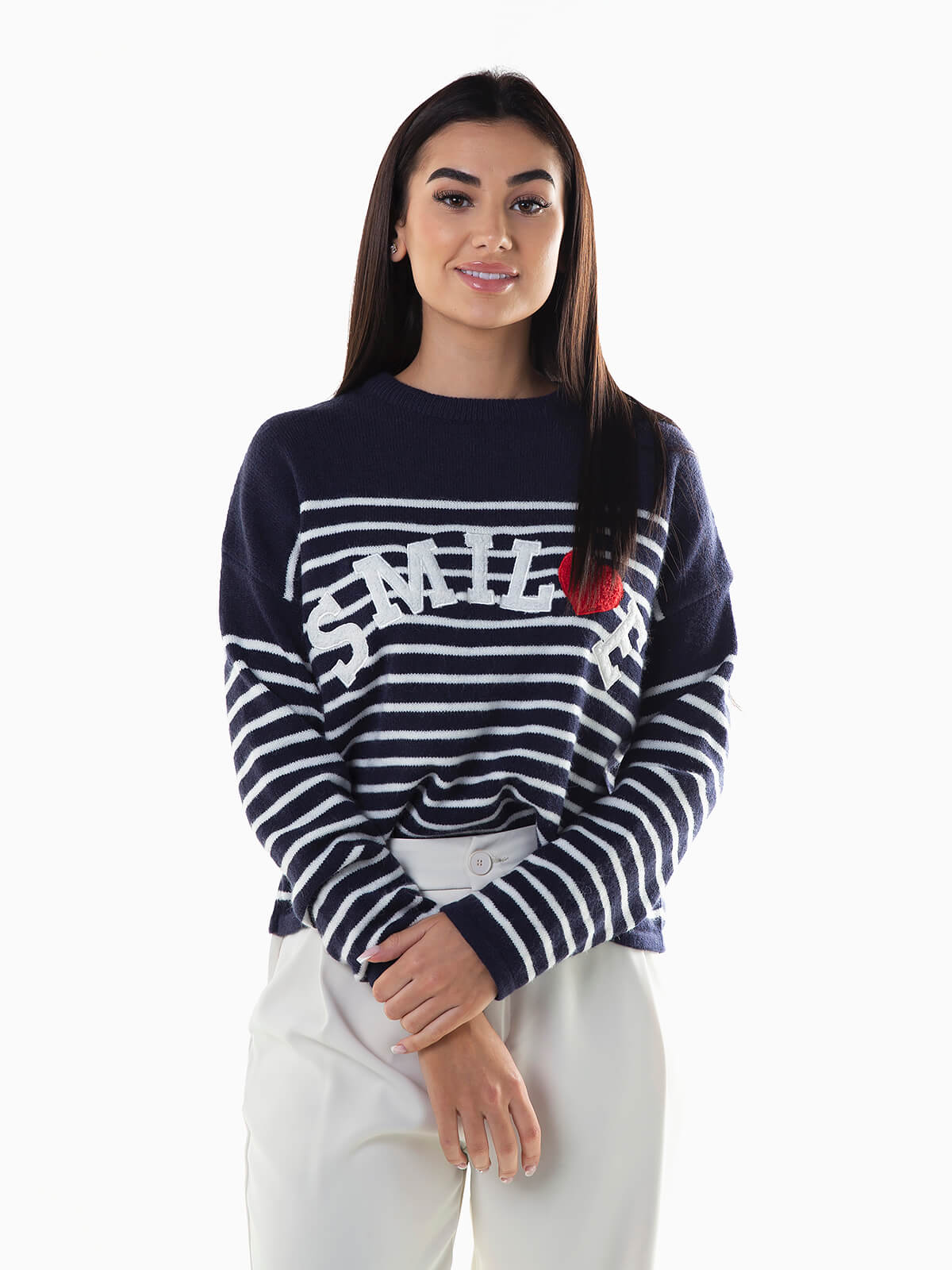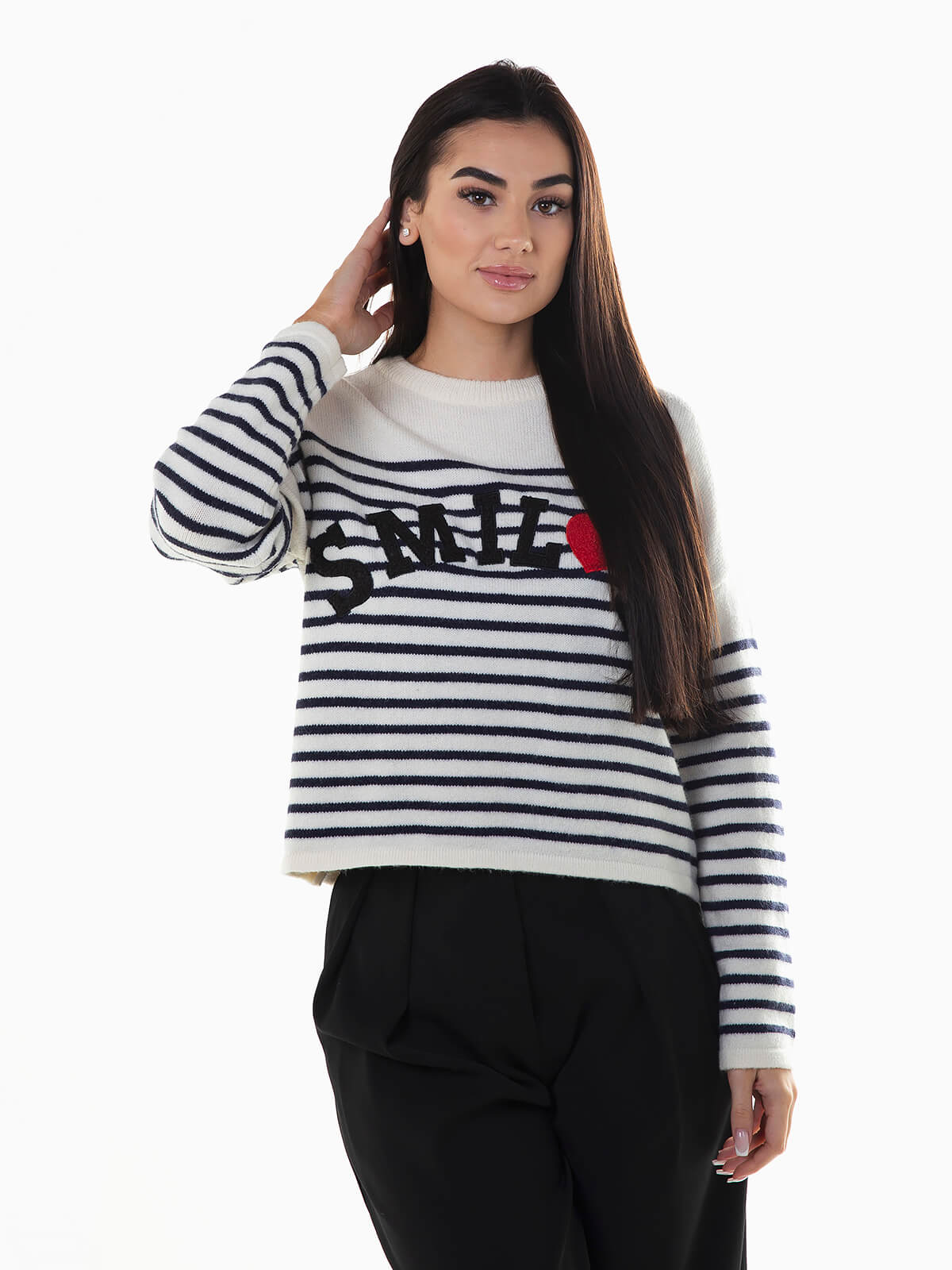 Camisola malha às riscas com bordado smile e coração em tecido terry. Camisola manga comprida com decote redondo.