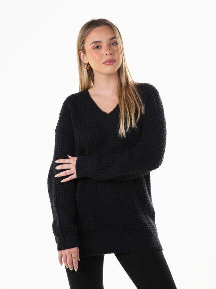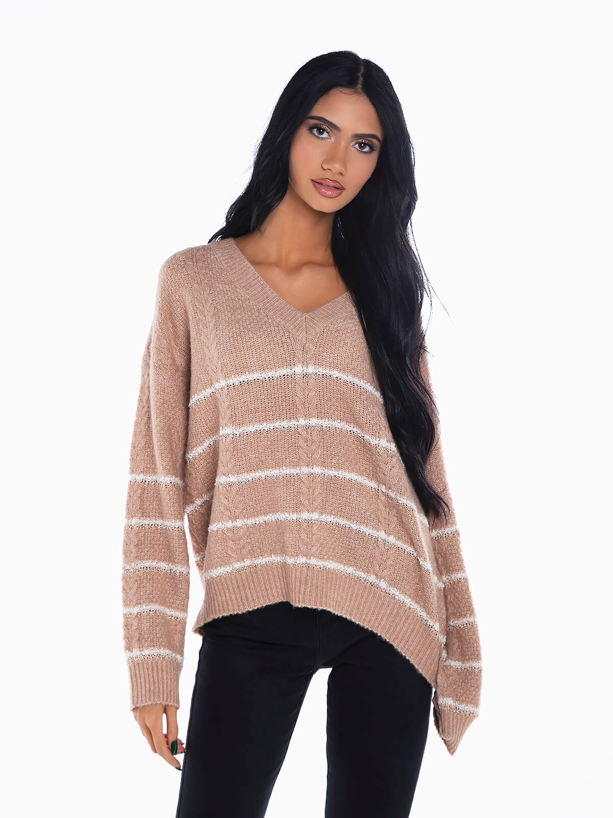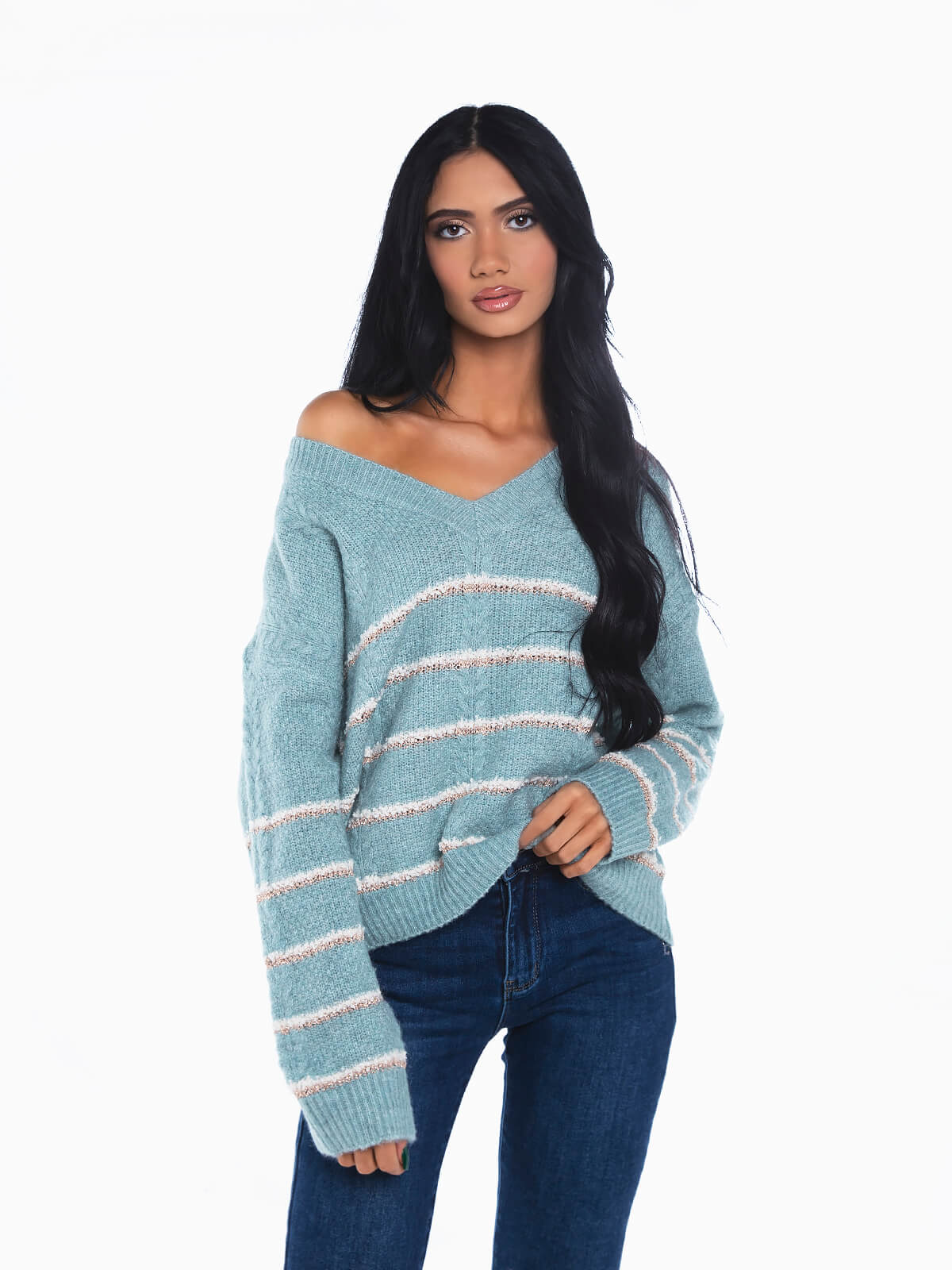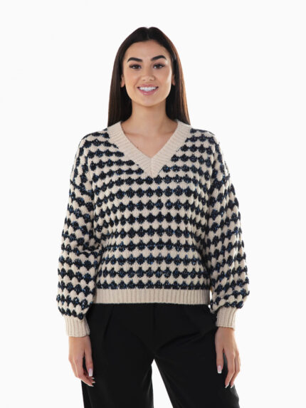 Camisola de malha com riscas em fios lurex para efeito brilhante. Camisola de manga comprida com decote em bico. Acabamentos em nervuras.