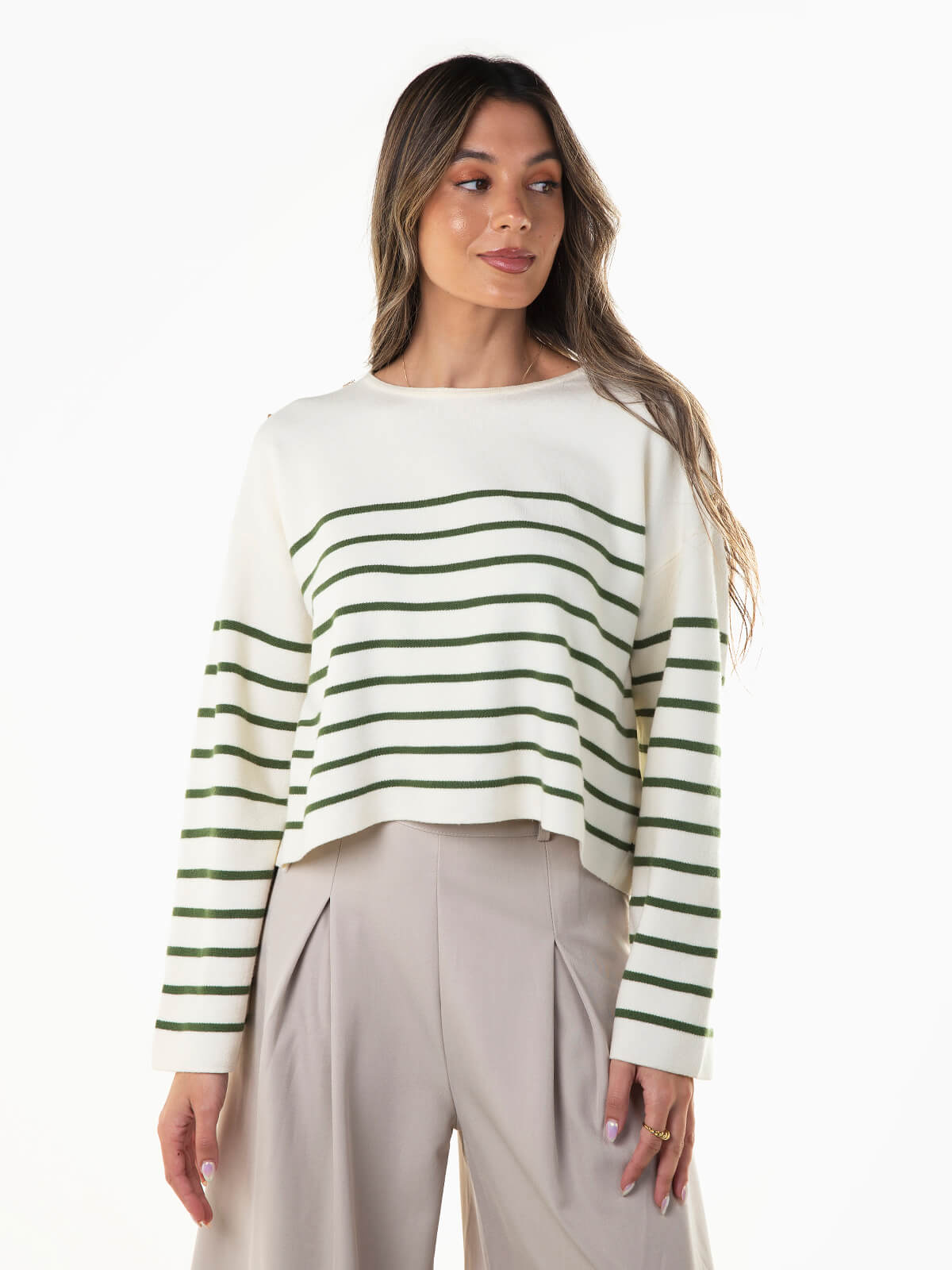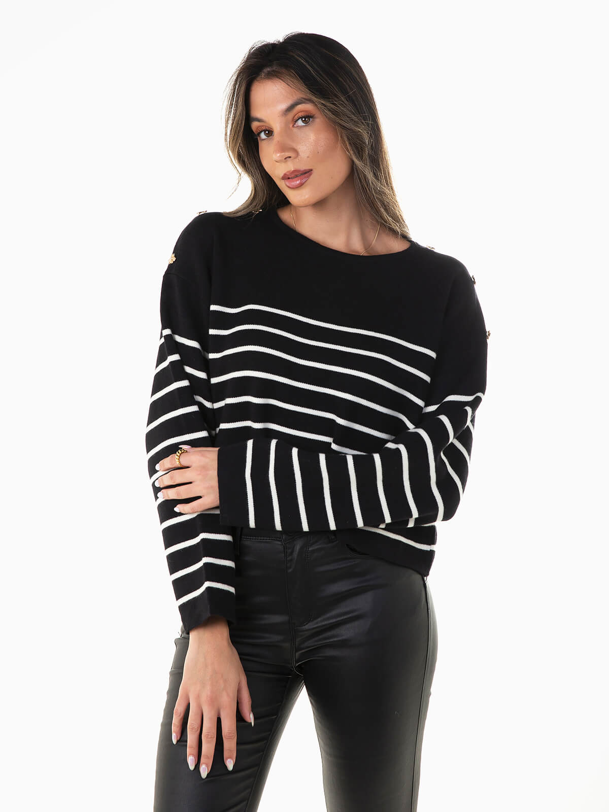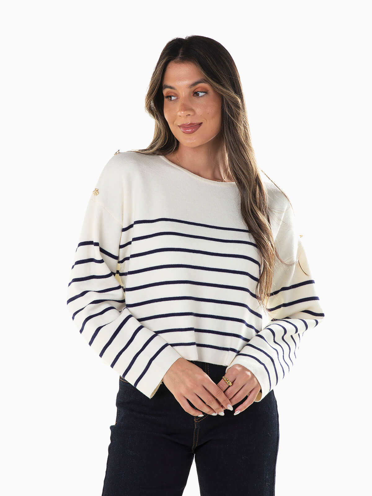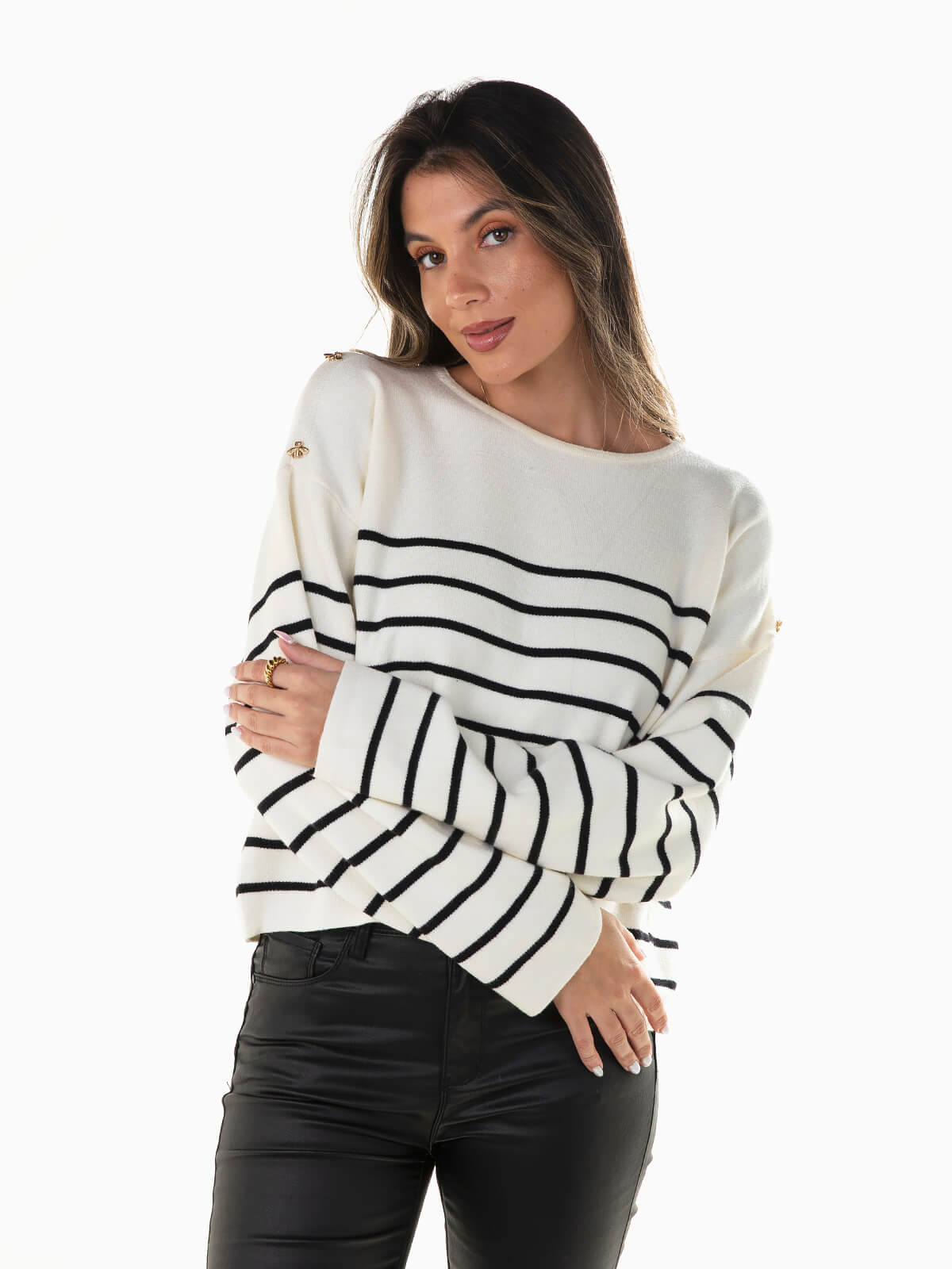 Camisola malha às riscas com aplicações douradas nos ombros. Camisola oversize manga comprida com decote redondo.