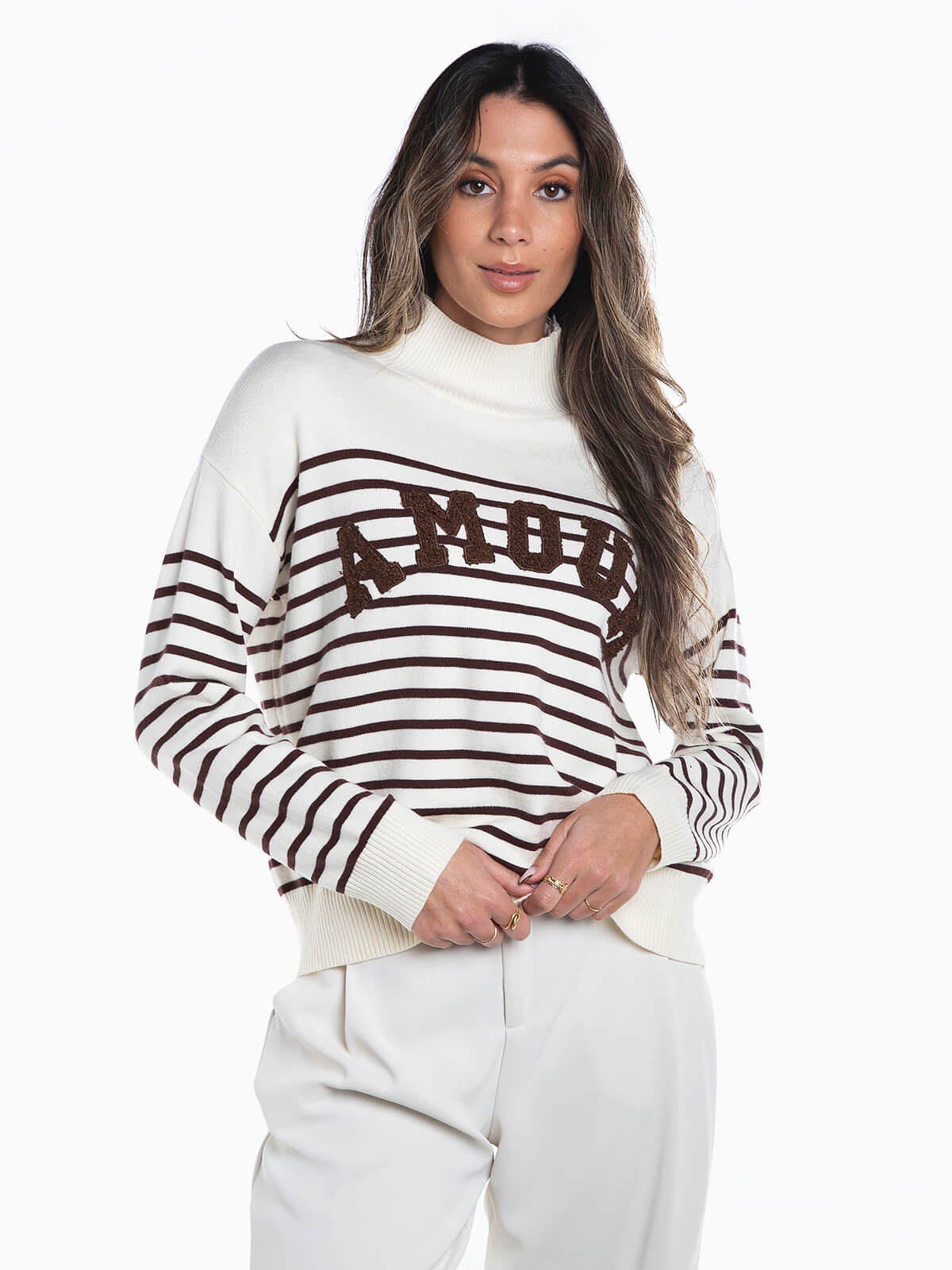 Camisola malha às riscas com bordado de letras em tecido terrycloth. Camisola manga comprida com gola alta e aperto de botões. Acabamentos canelados.