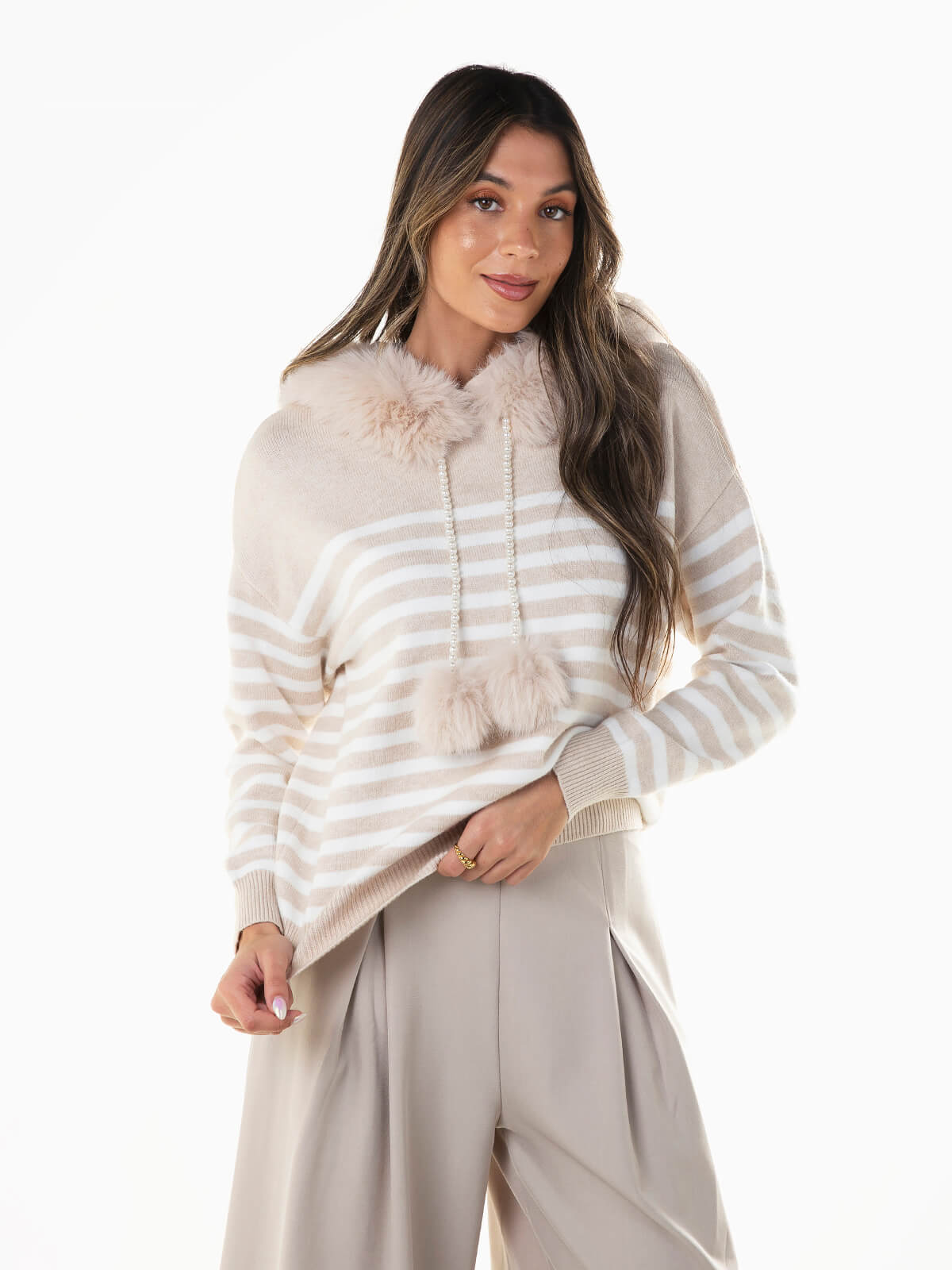 Camisola de malha às riscas com capuz para senhora. Camisola de manga comprida com acabamentos canelados. Capuz com pelo e pompons removíveis.