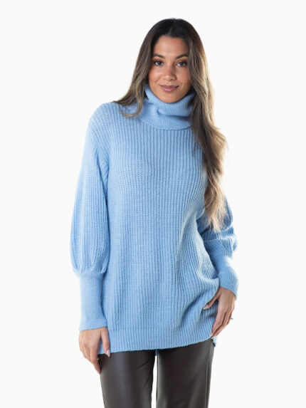Camisola bege de malha às riscas para senhora. Camisola manga comprida com gola subida e aperto fecho zíper. Acabamentos canelados.