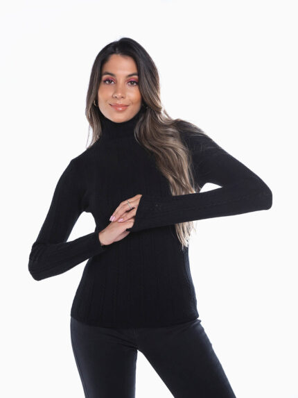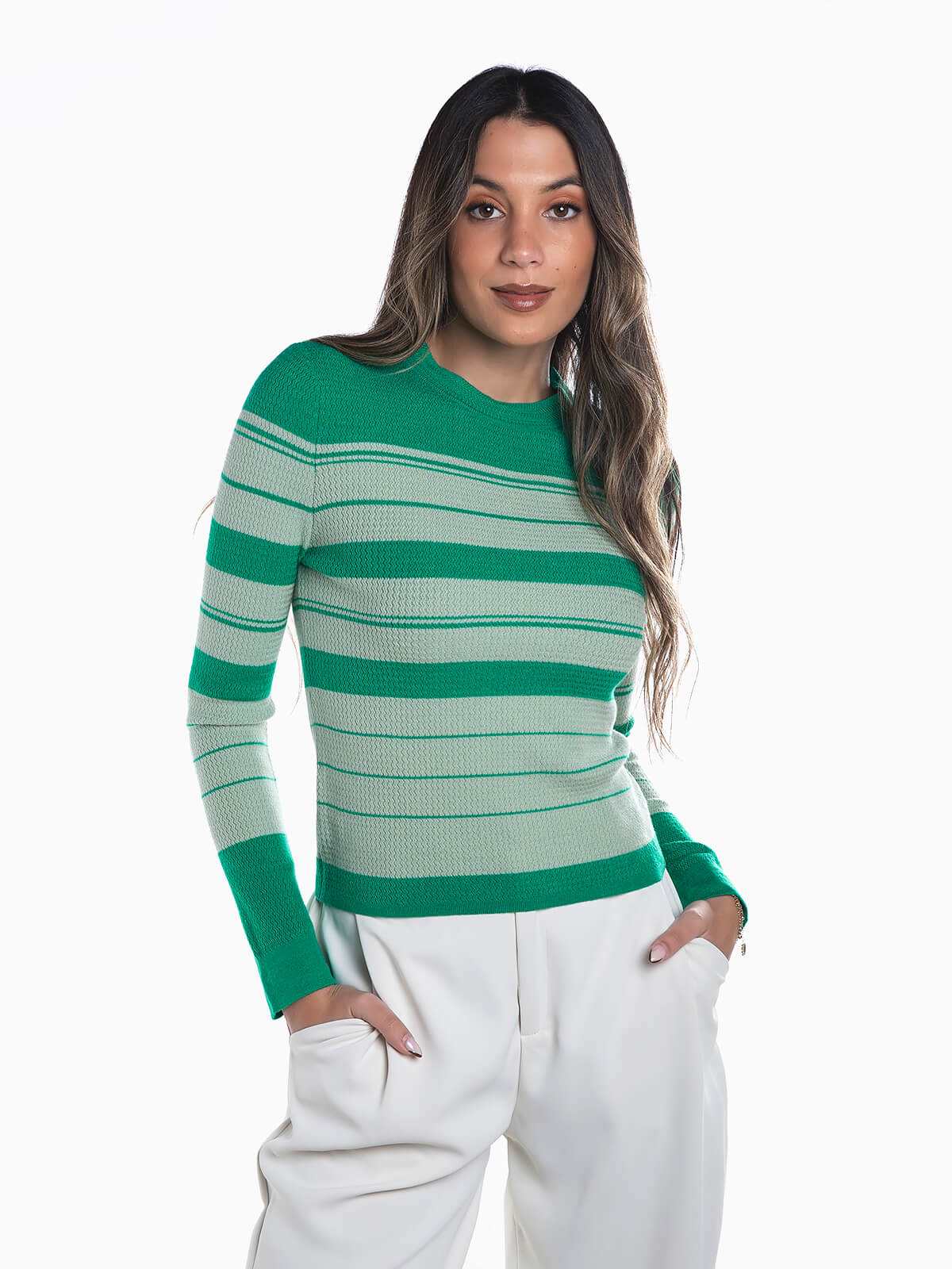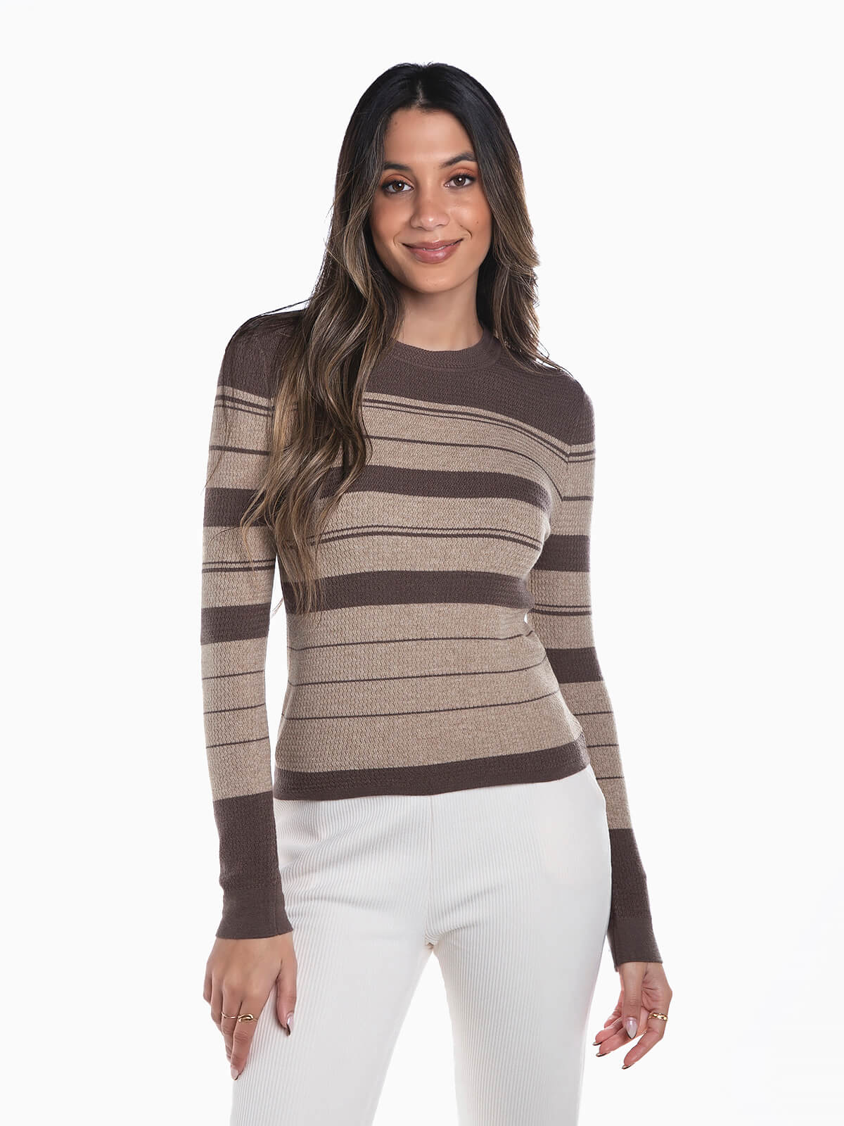 Camisola às riscas em malha com mistura lã para maior conforto térmico. Camisola manga comprida com decote redondo.