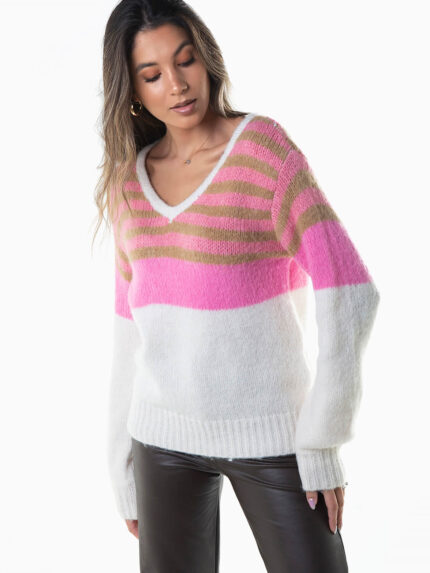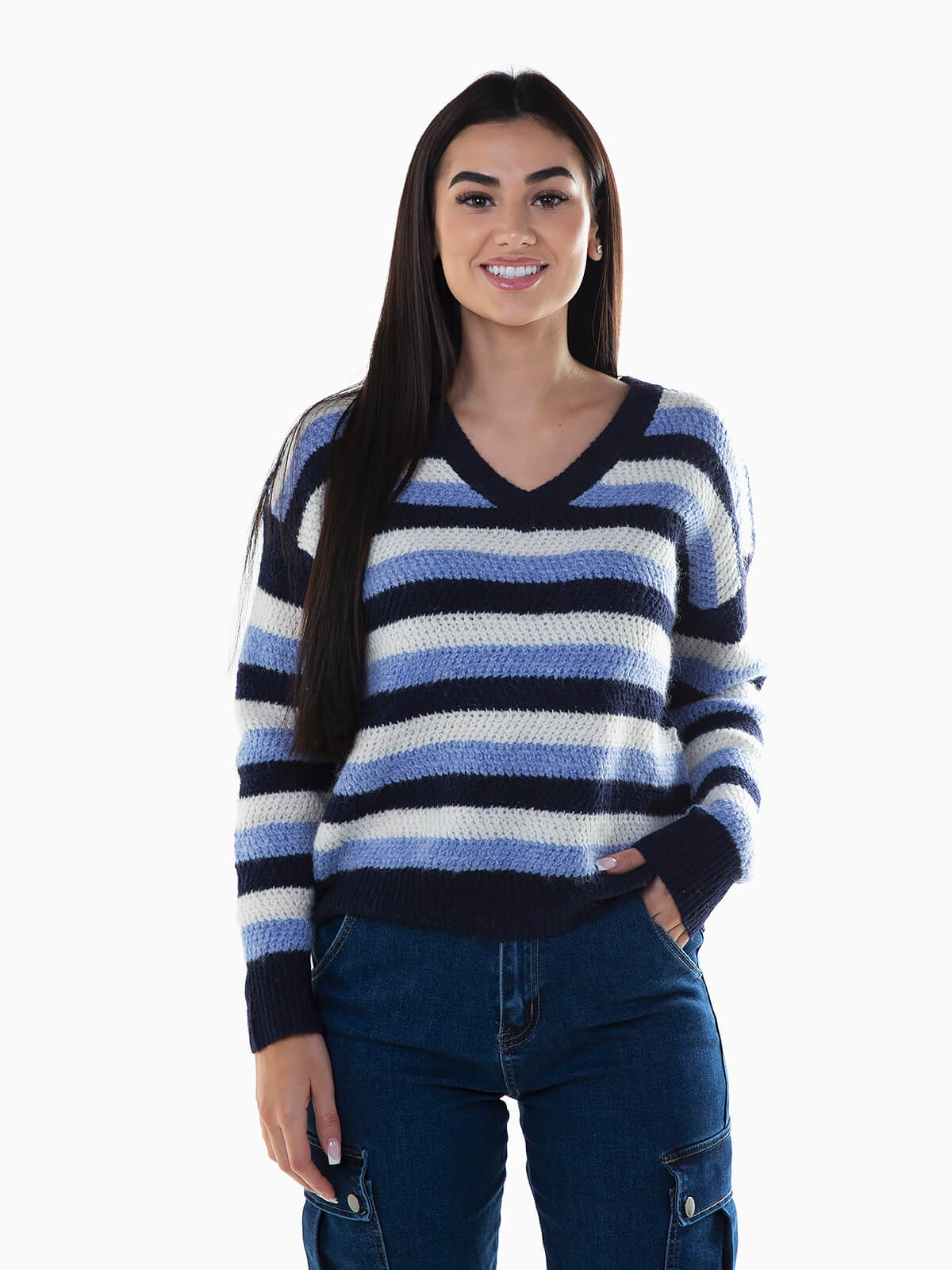 Camisola de malha às riscas com decote em V para senhora. Camisola mistura de lã para maior conforto térmico. Manga comprida e acabamentos canelados.