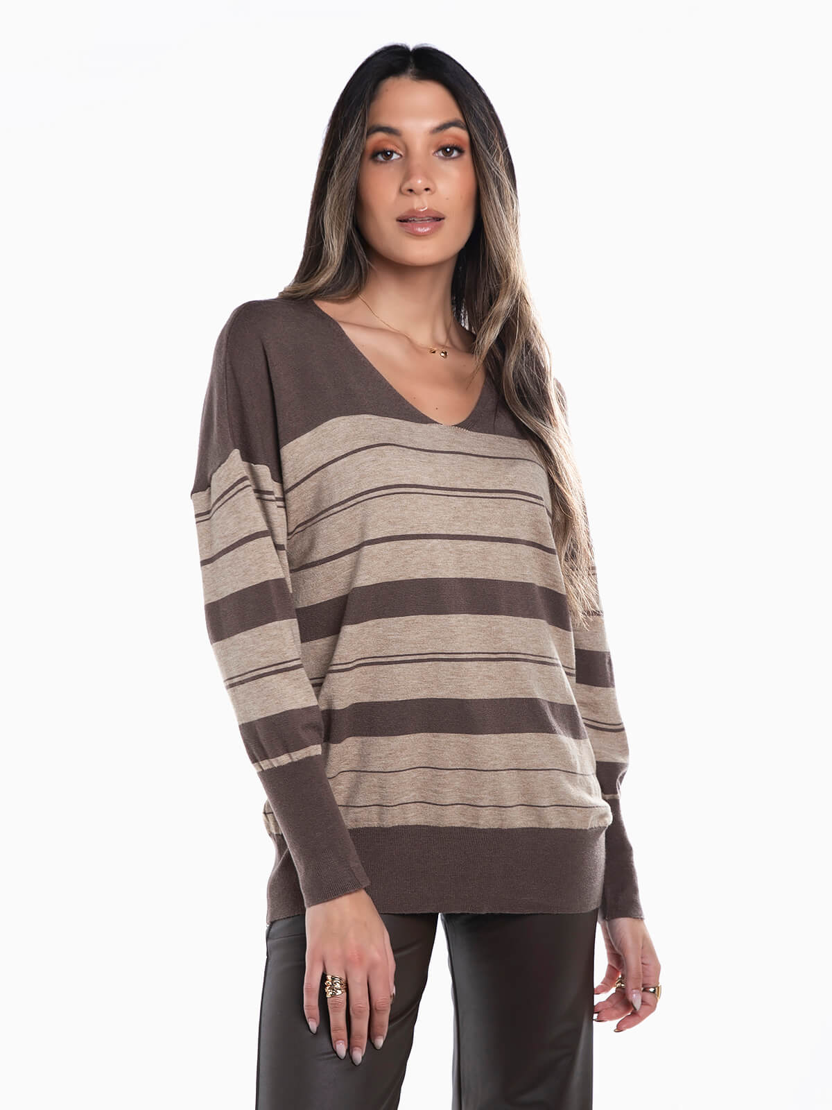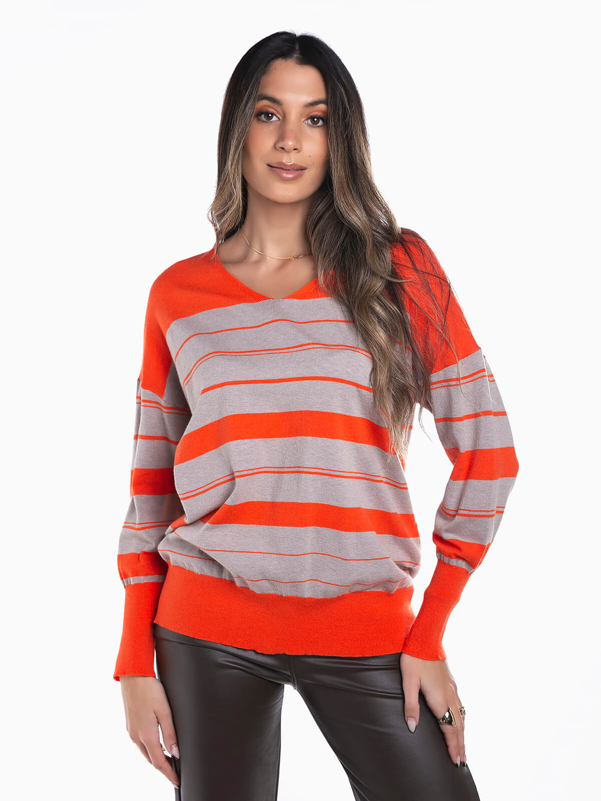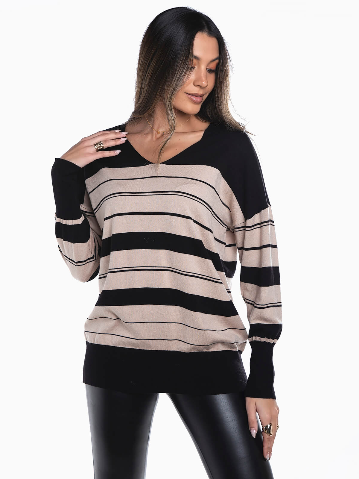Camisola às riscas em malha com mistura lã para maior conforto térmico. Camisola manga comprida com decote em V.