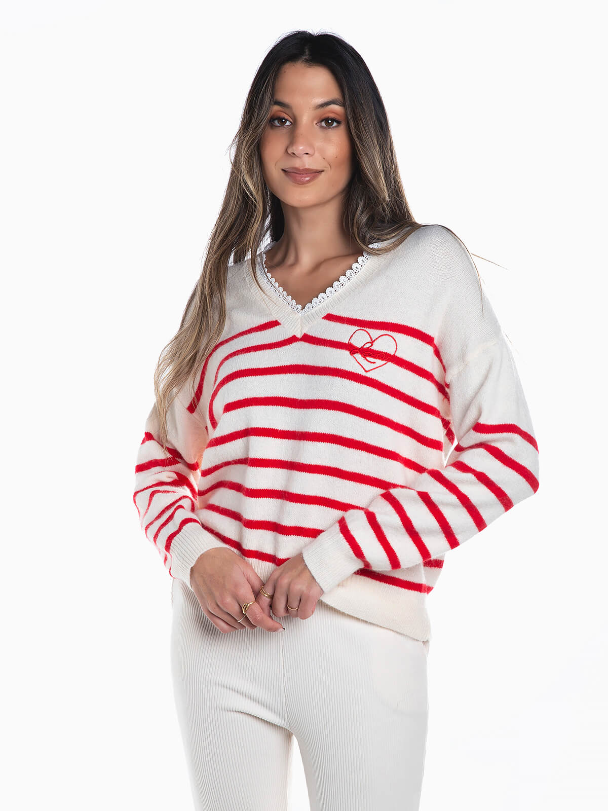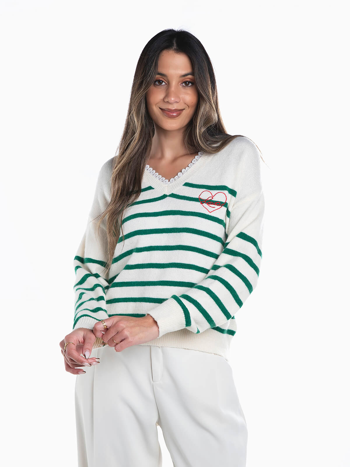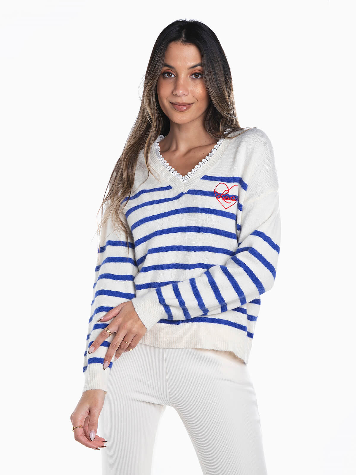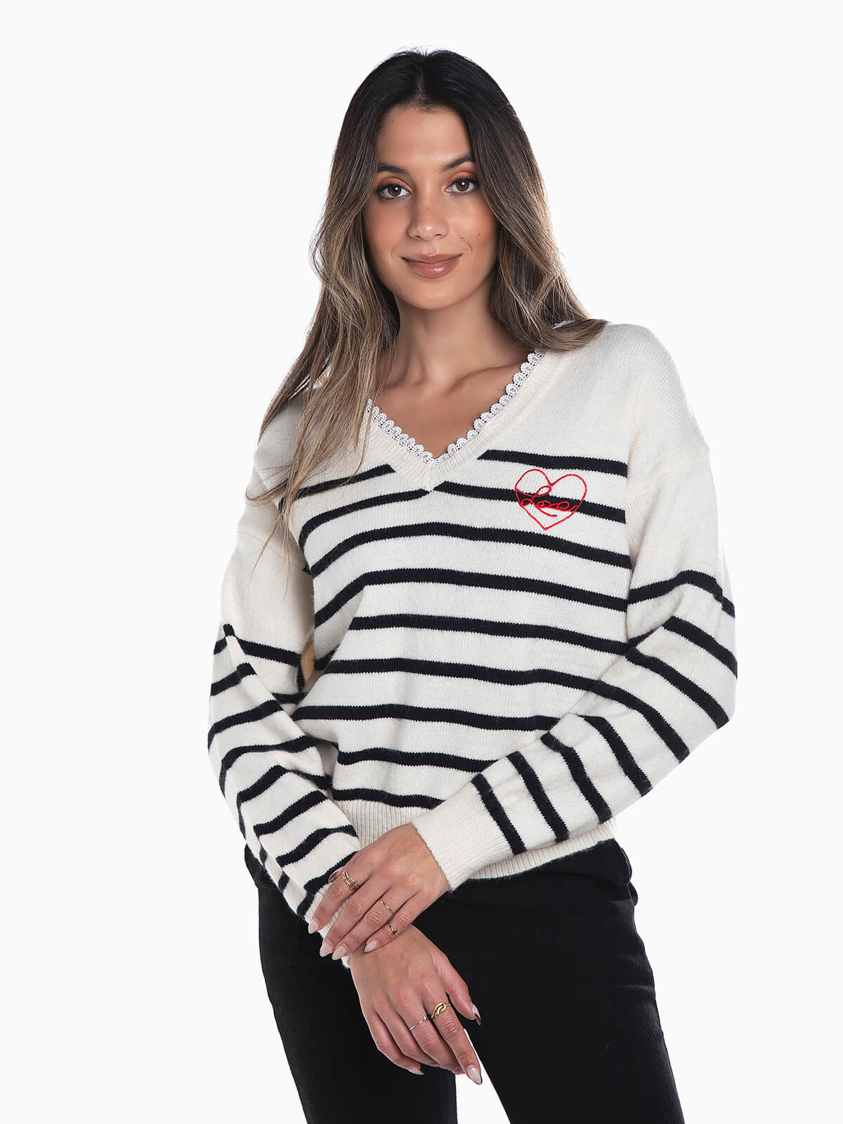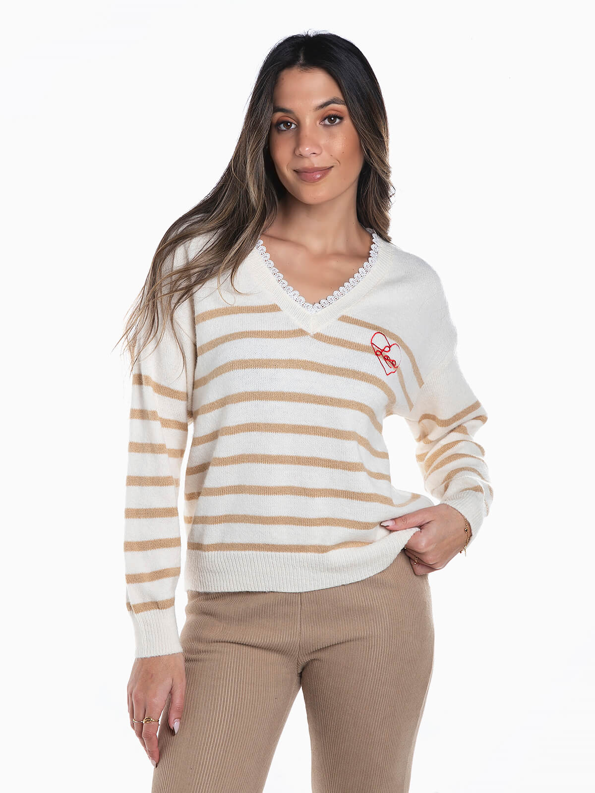 Camisola de malha às riscas com decote em V e encaixe de renda. Camisola manga comprida com ombros descaídos. Bordado no peito.