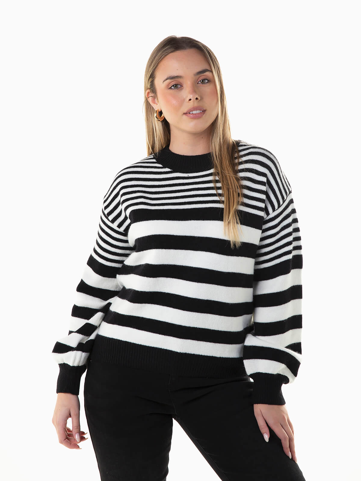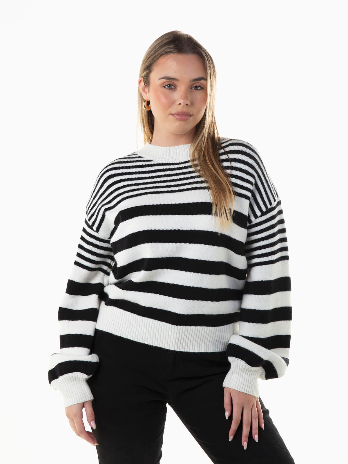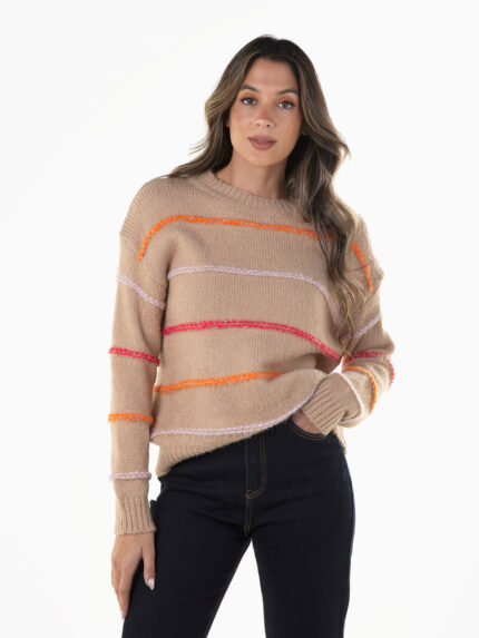 Camisola de malha às riscas com gola perkins para mulher. Camisola manga comprida com acabamentos canelados. Ombros descaídos.