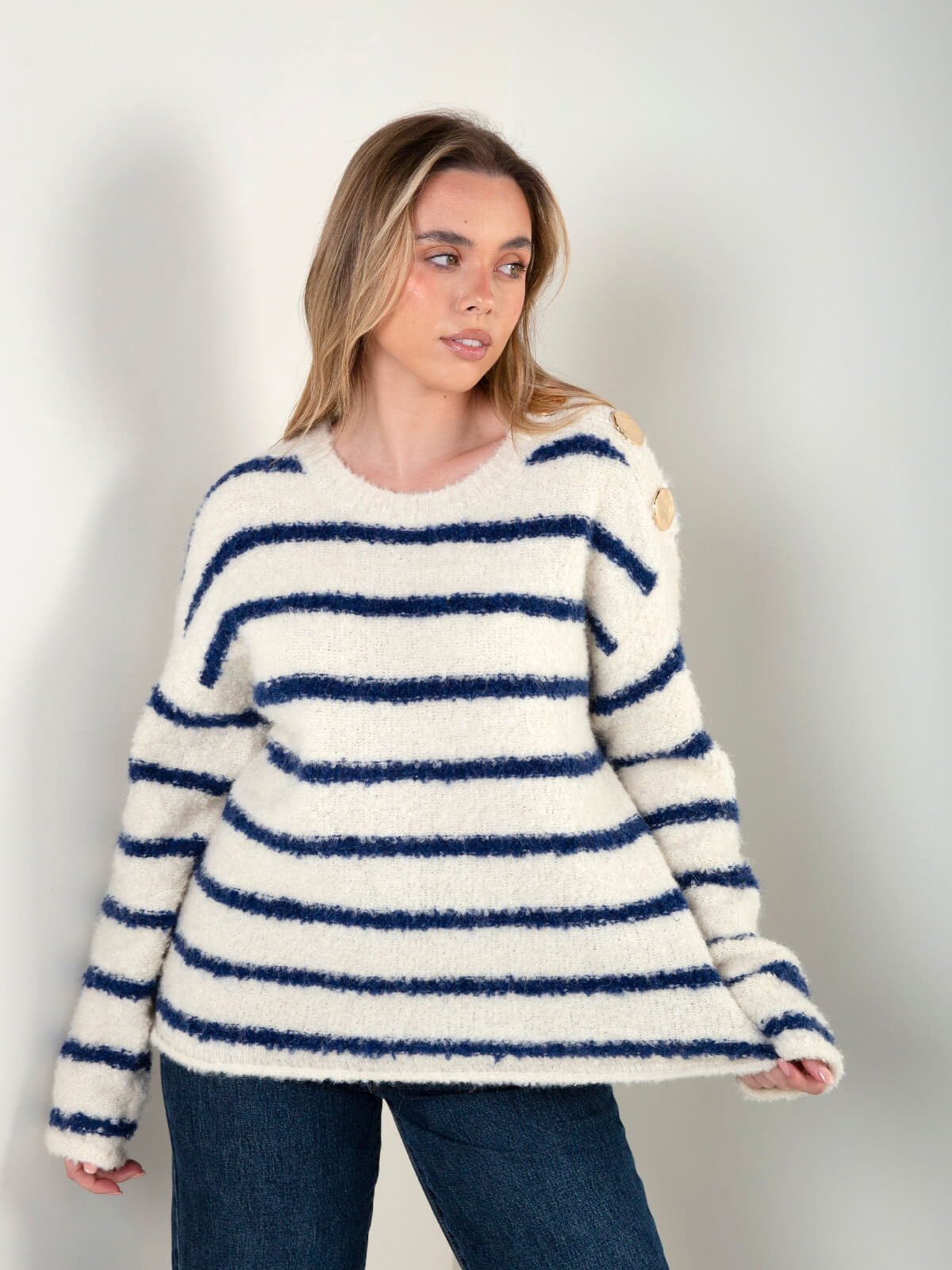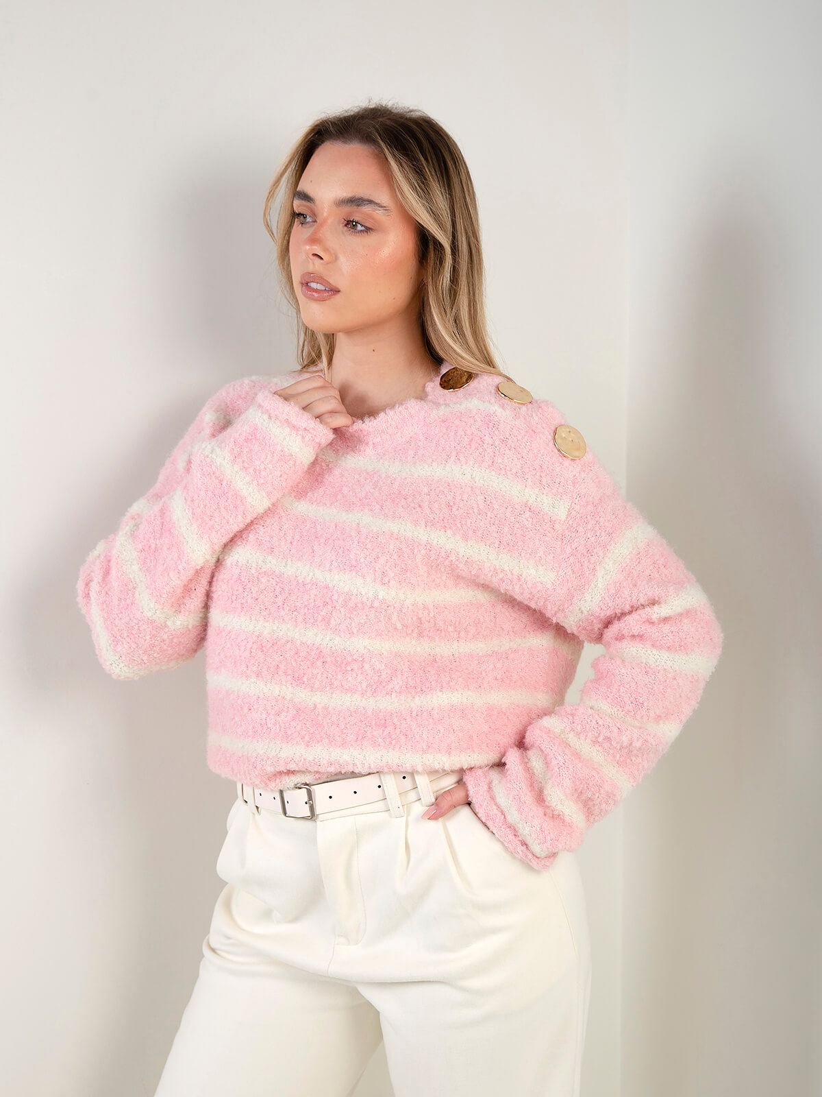 Camisola de malha com riscas em contraste, gola redonda, manga comprida e botões decorativos no ombro. Ideal para looks casuais de inverno, conjugando com calças de ganga ou calças de malha.