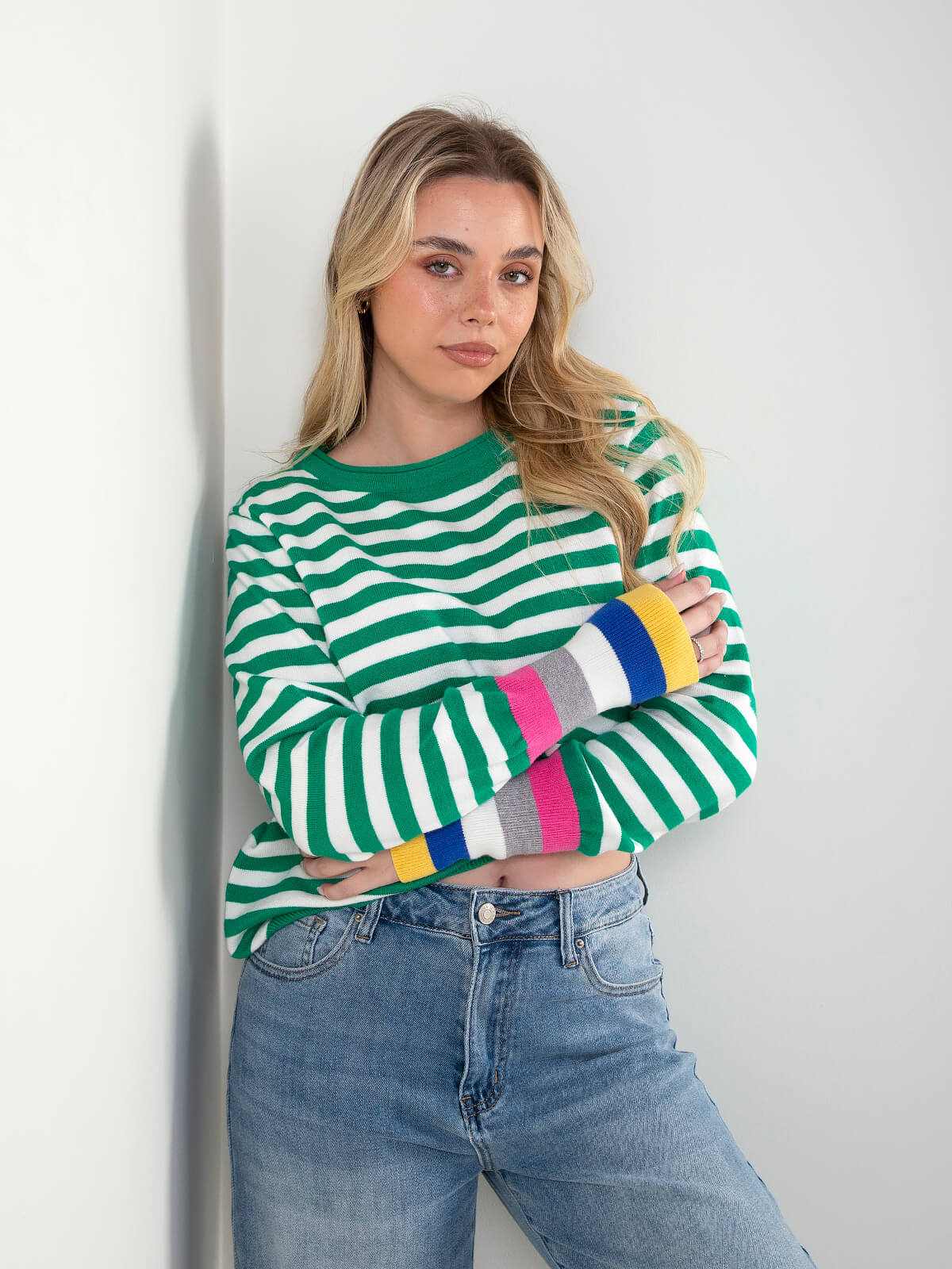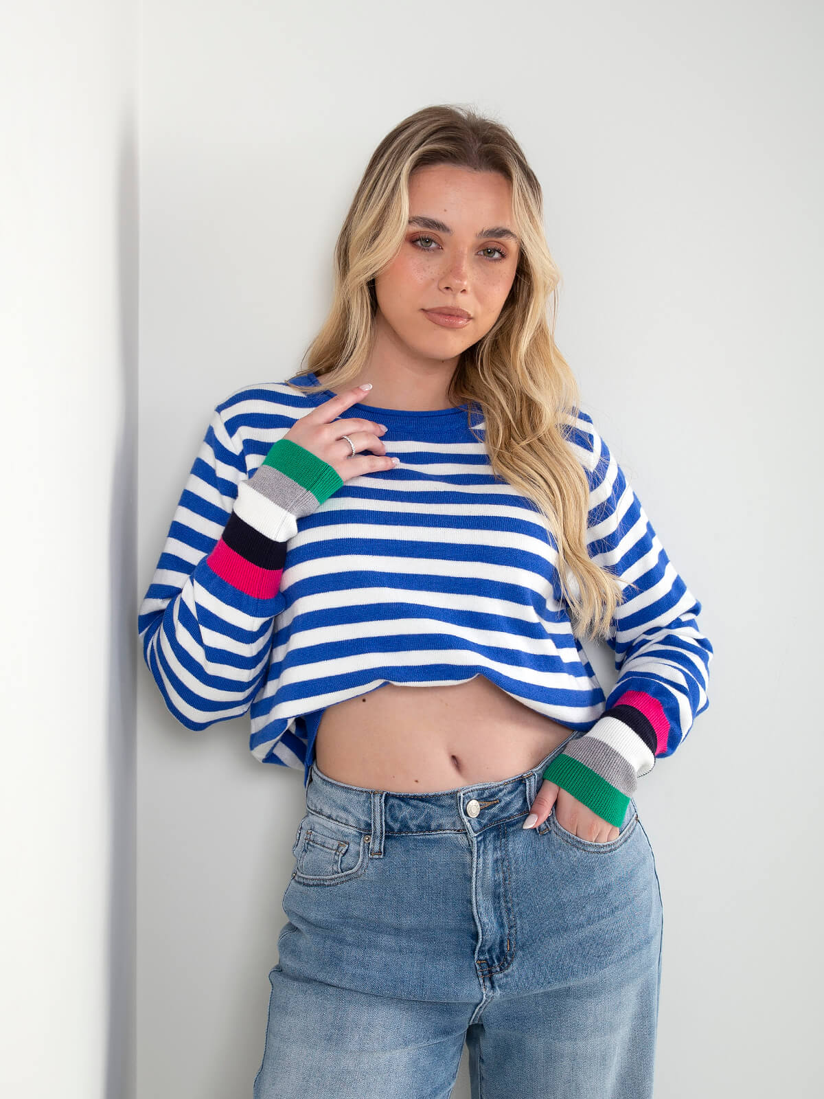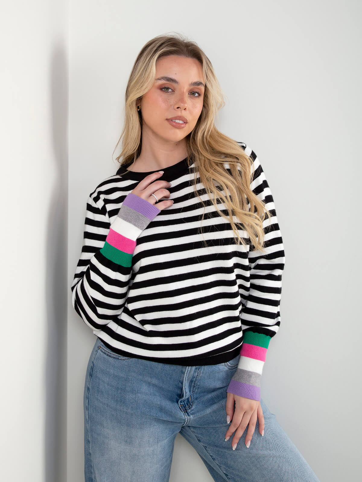 Camisola de malha às riscas rosa e azul marinho com manga comprida e punhos contrastantes. Ideal para looks casuais com jeans de cintura alta ou calças.
