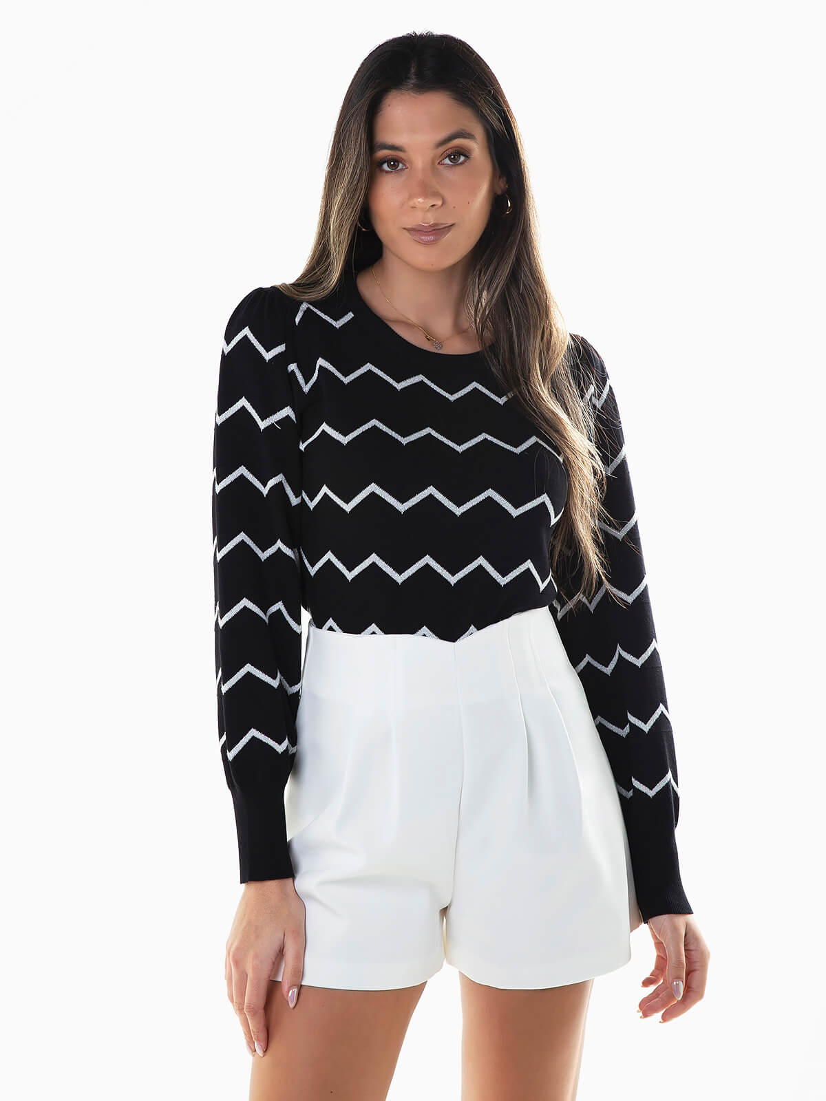 Camisola malha com riscas em ziguezague e fios lurex para efeito brilhante. Camisola manga comprida com pregas. Decote redondo e punho justo.