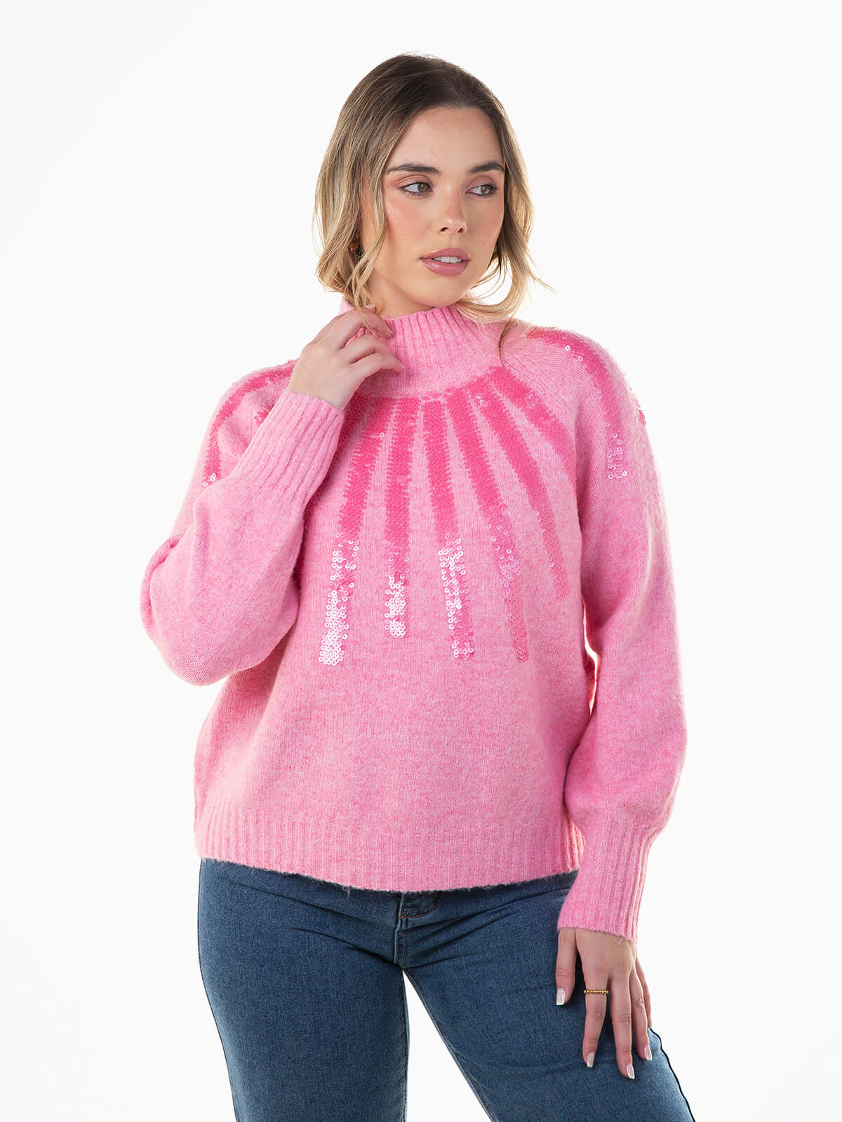 Camisola rosa de malha com mistura de lã para maior conforto térmico. Camisola de manga comprida com gola alta e acabamentos canelados. Lantejoulas aplicadas.
