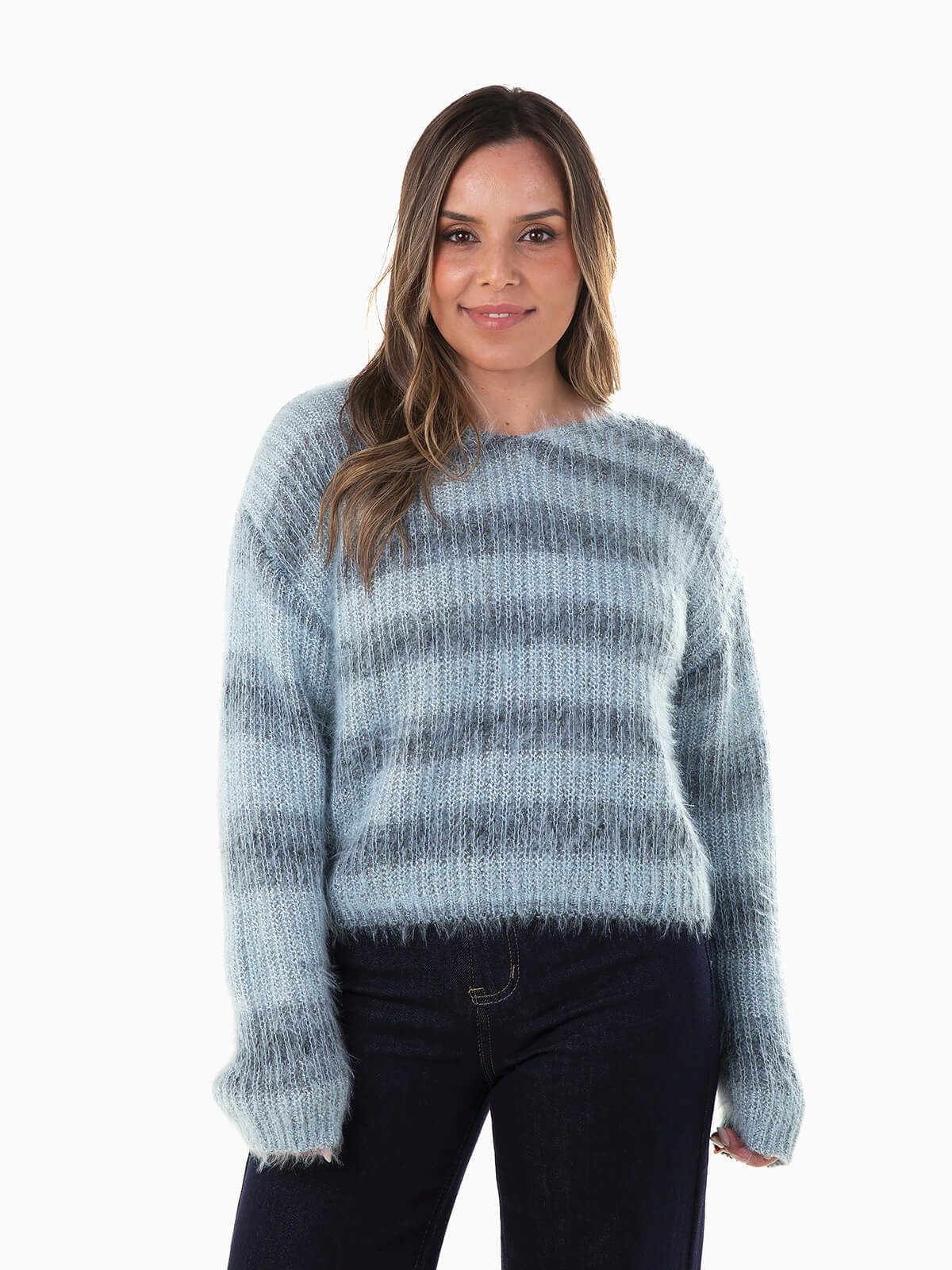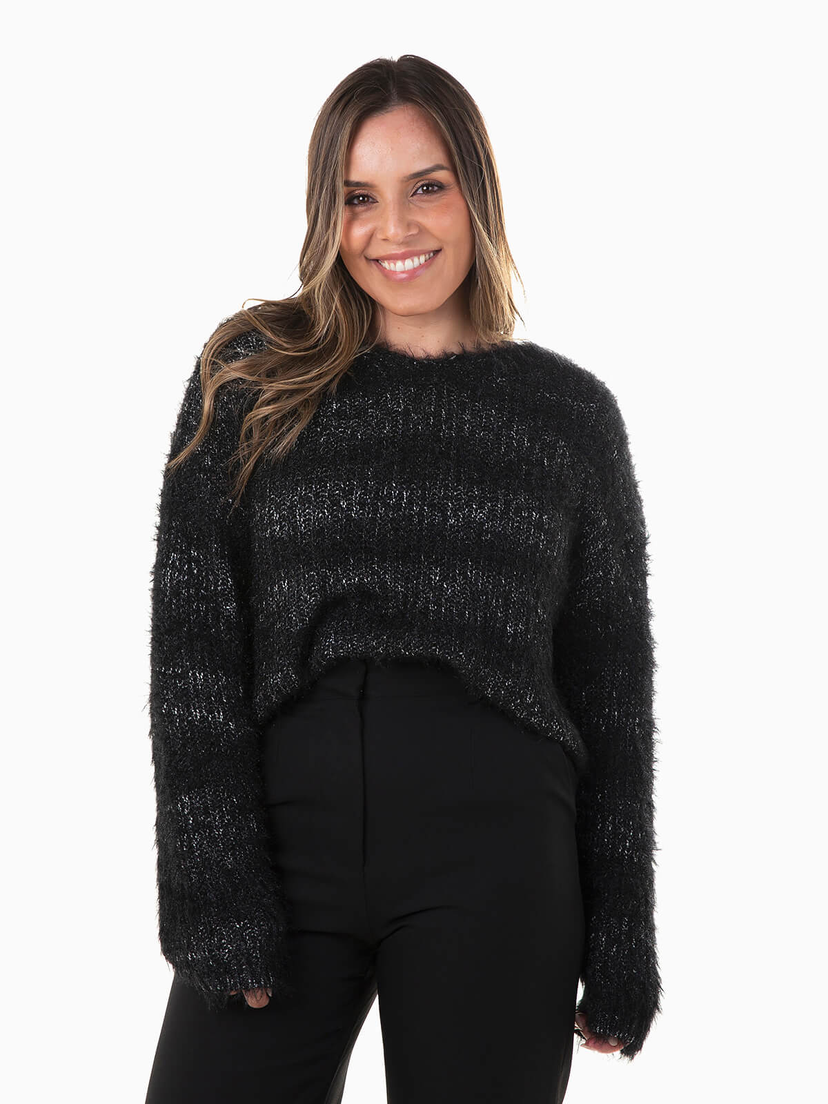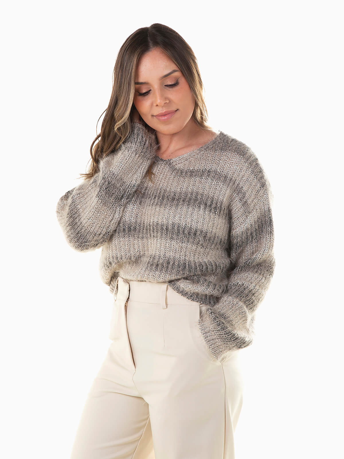 Camisola de malha suave com fios lúrex para efeito brilhante. Camisola às riscas com manga comprida e decote em V.