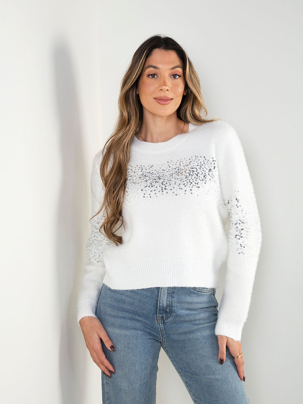 Camisola de malha macia com aplicação de lantejoulas na parte frontal e mangas, que acrescentam um toque luminoso e sofisticado ao look. Modelo de gola redonda, manga comprida e acabamento suave, ideal para elevar coordenados do dia a dia ou para ocasiões especiais sem esforço.