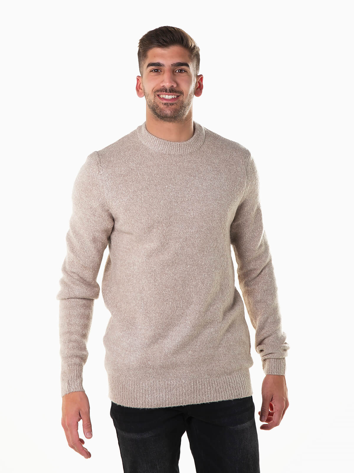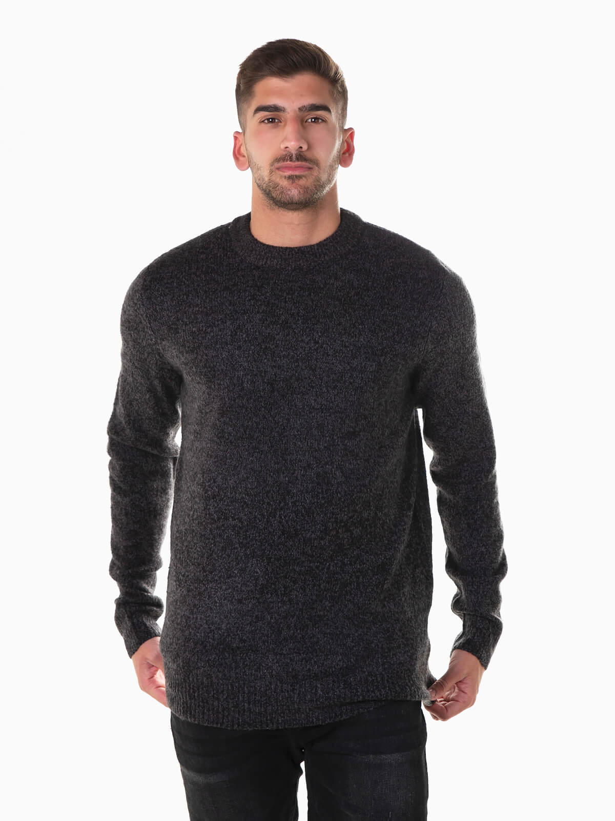 Camisola de malha mesclada de toque suave e confortável. Camisola de manga comprida com gola redonda e acabamentos canelados.