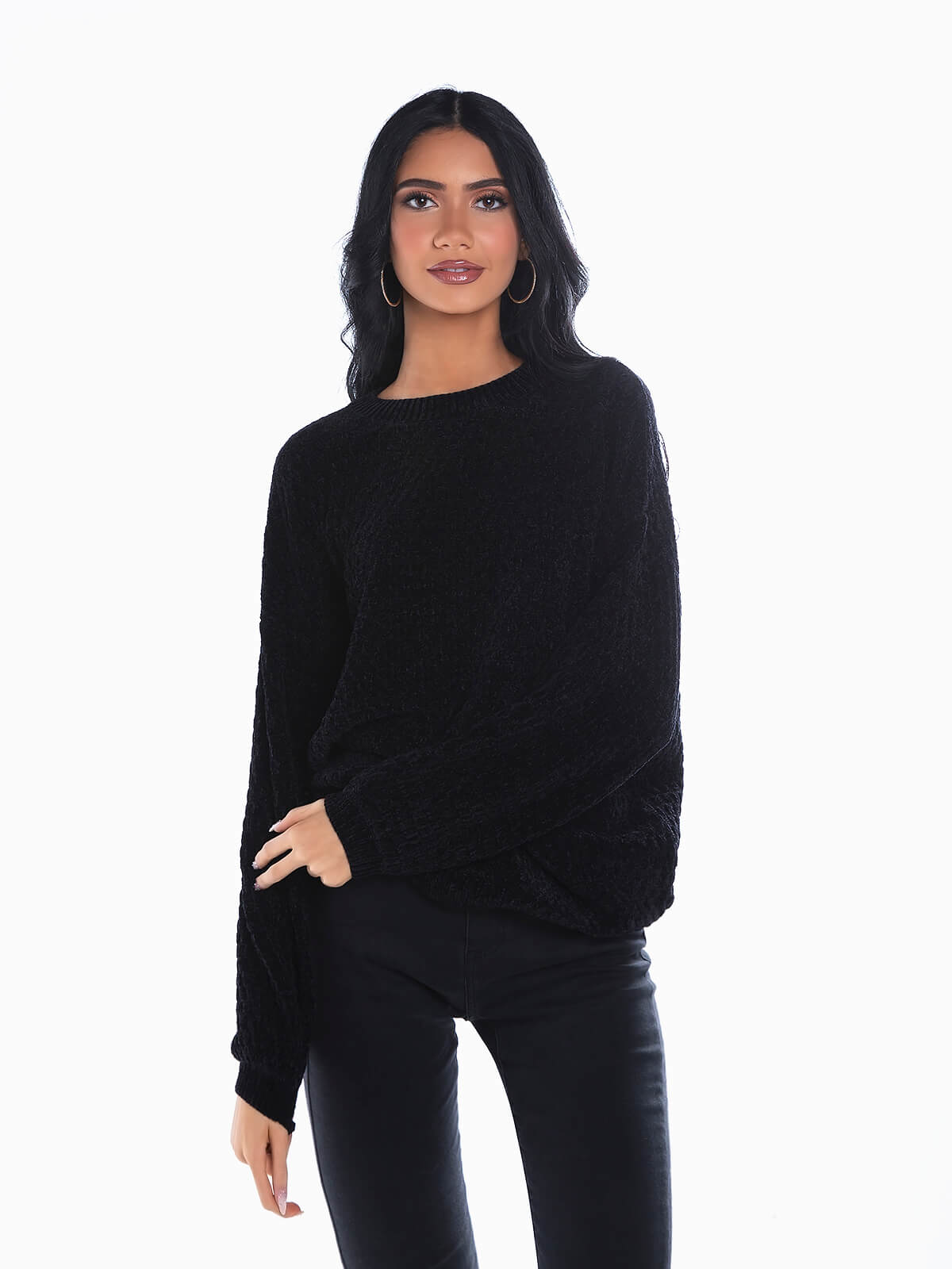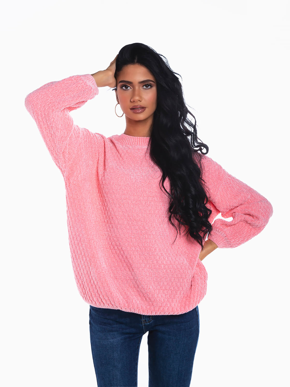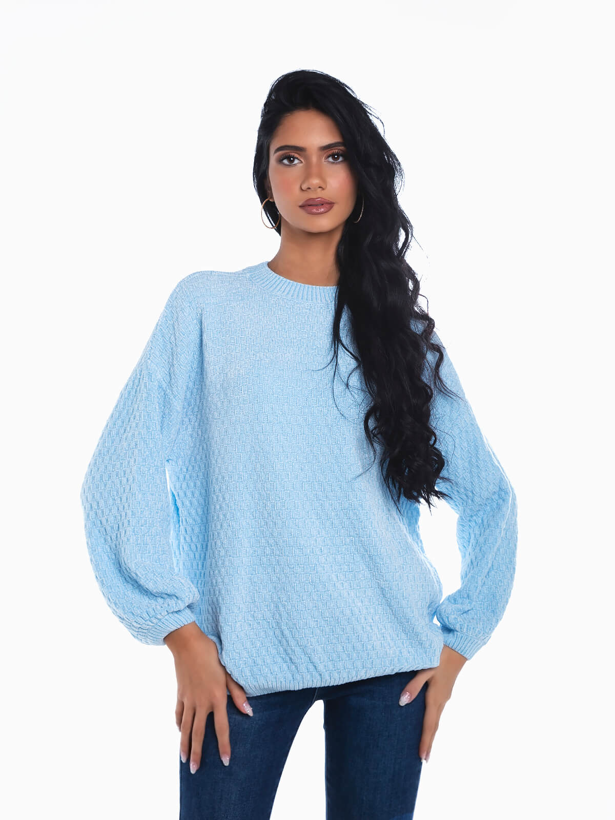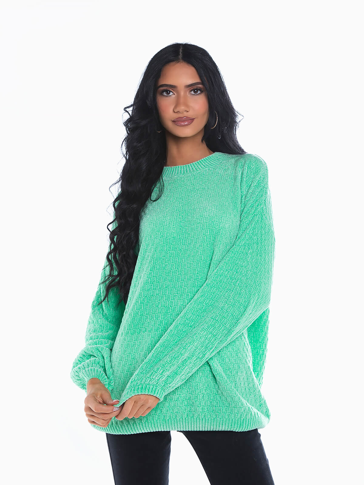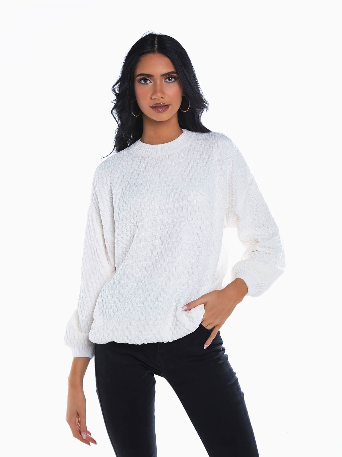 Camisola em malha de tato suave para senhora. Camisola confortável de manga comprida com decote redondo. Acabamentos canelados.