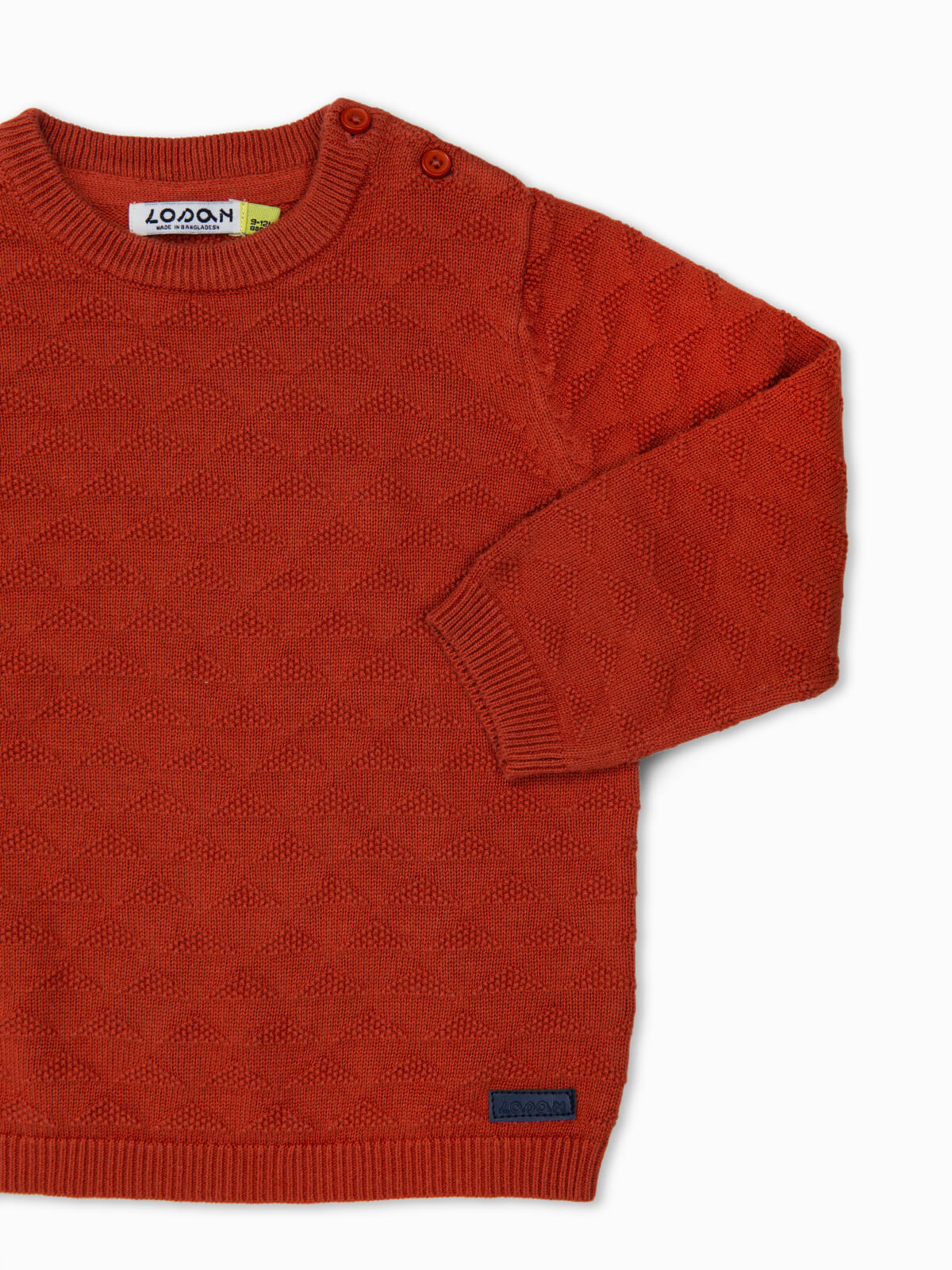Camisola de malha telha com relevo para bebé menino. Camisola de manga comprida com gola redonda e aperto de dois botões. Acabamentos em nervuras.
