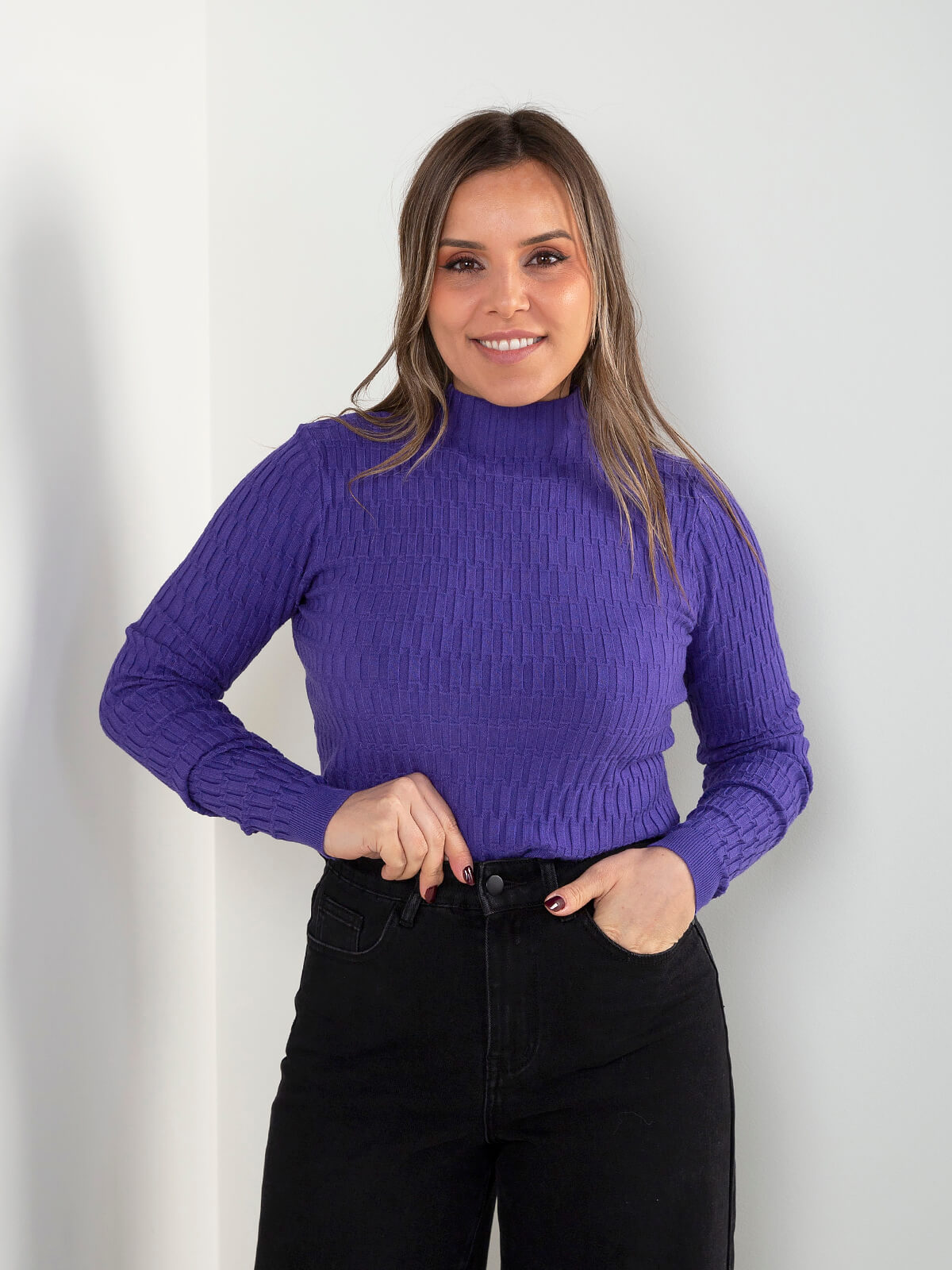 Camisola de malha com textura geométrica em relevo e gola subida. Modelo de manga comprida, com punhos e gola canelados. Um essencial versátil para looks de meia-estação, fácil de conjugar tanto em coordenados mais clássicos como em combinações mais modernas.