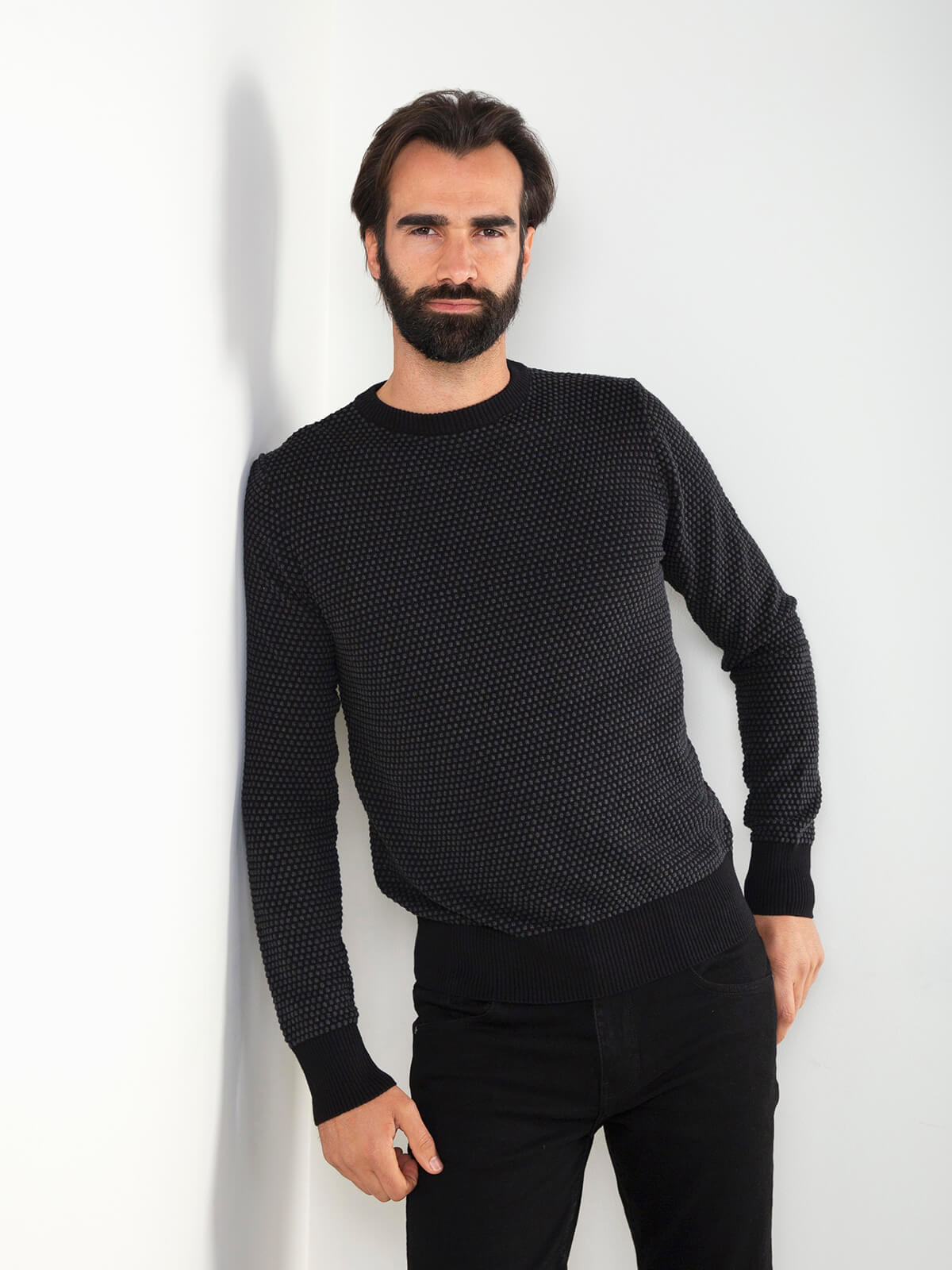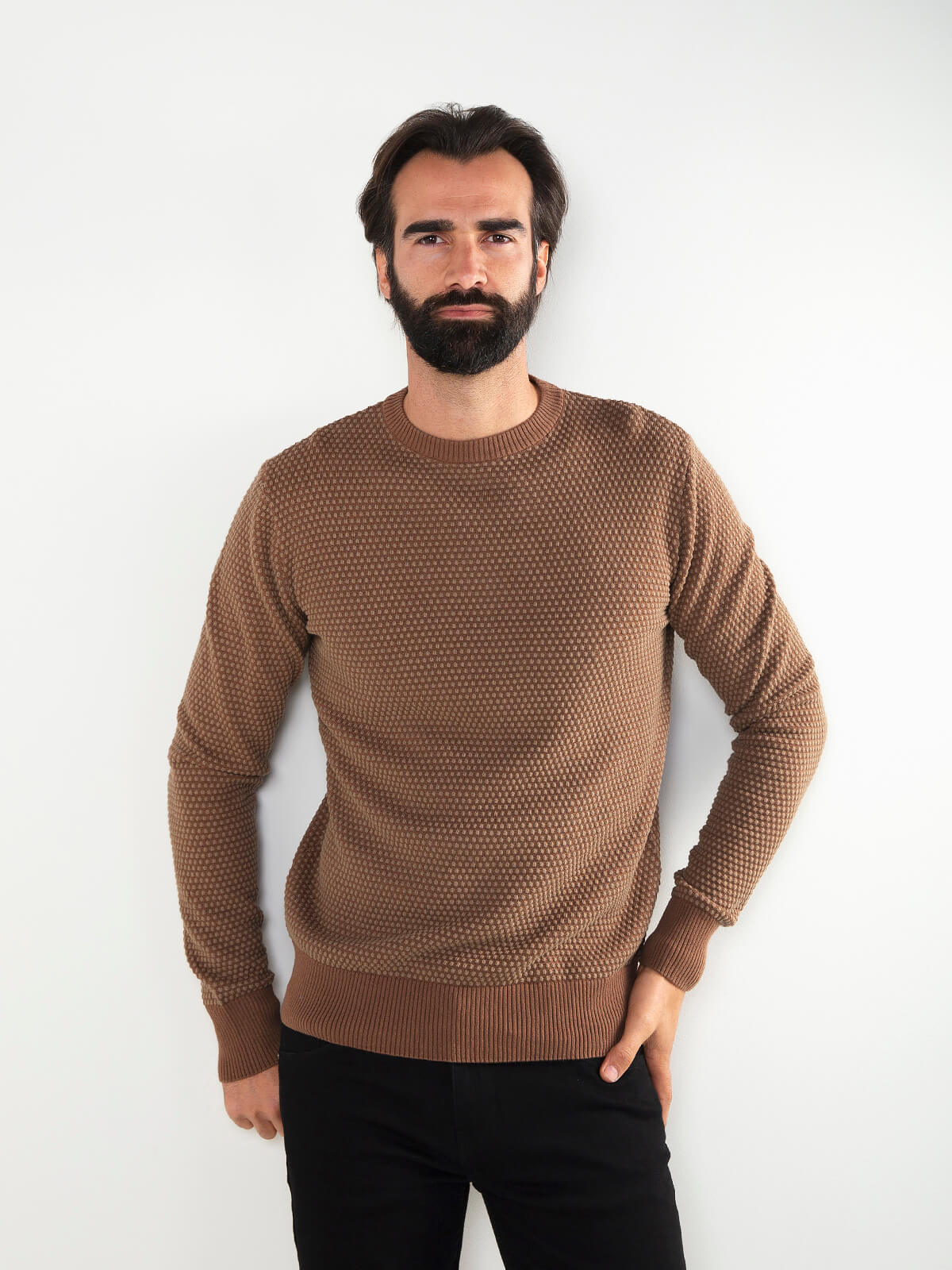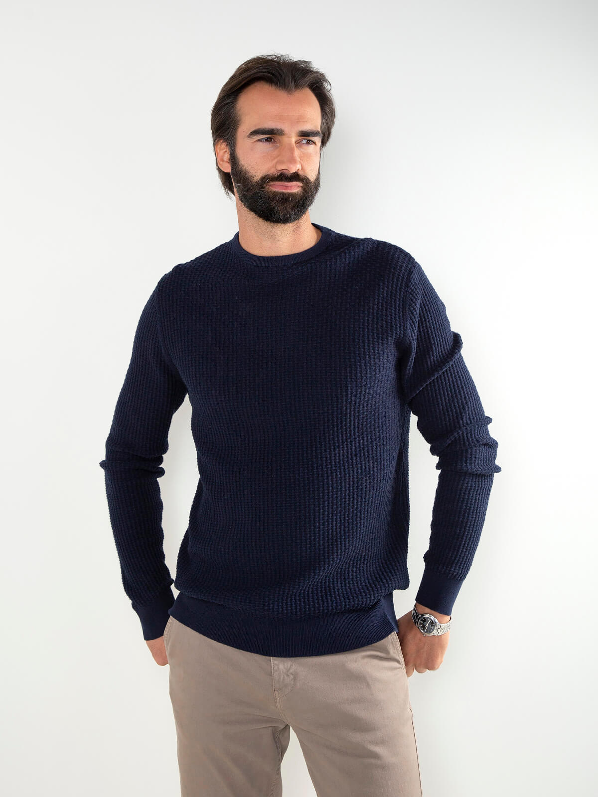 Camisola de malha texturizada para homem, confecionada em 100% algodão, com gola redonda e manga comprida. O relevo da malha acrescenta detalhe ao visual sem perder sobriedade. Uma peça prática e versátil, ideal para looks casuais com um toque mais cuidado.