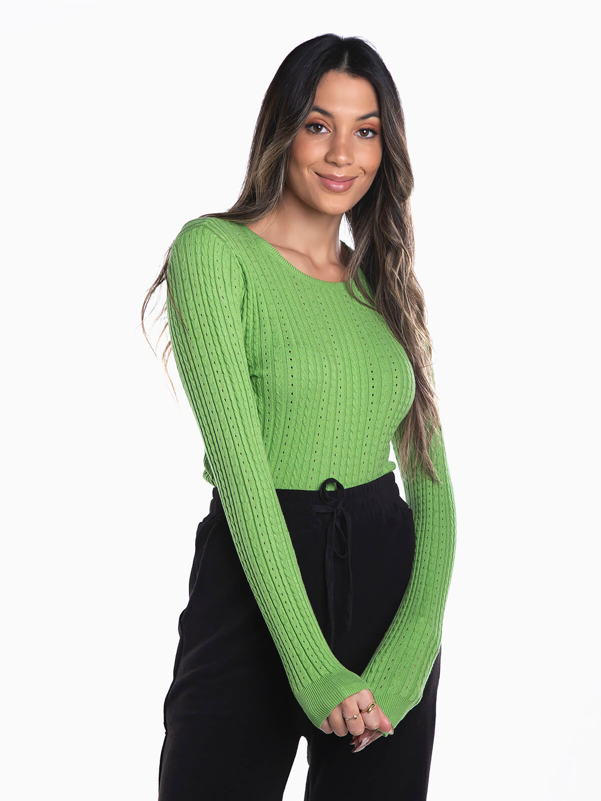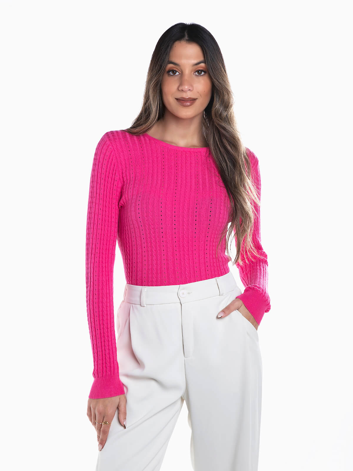 Camisola em malha com torcidos e pormenor perfurados. Camisola em tecido mistura de lã para maior conforto térmico. Decote redondo. Acabamentos canelados.