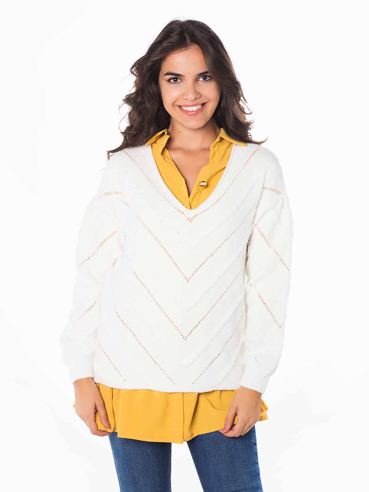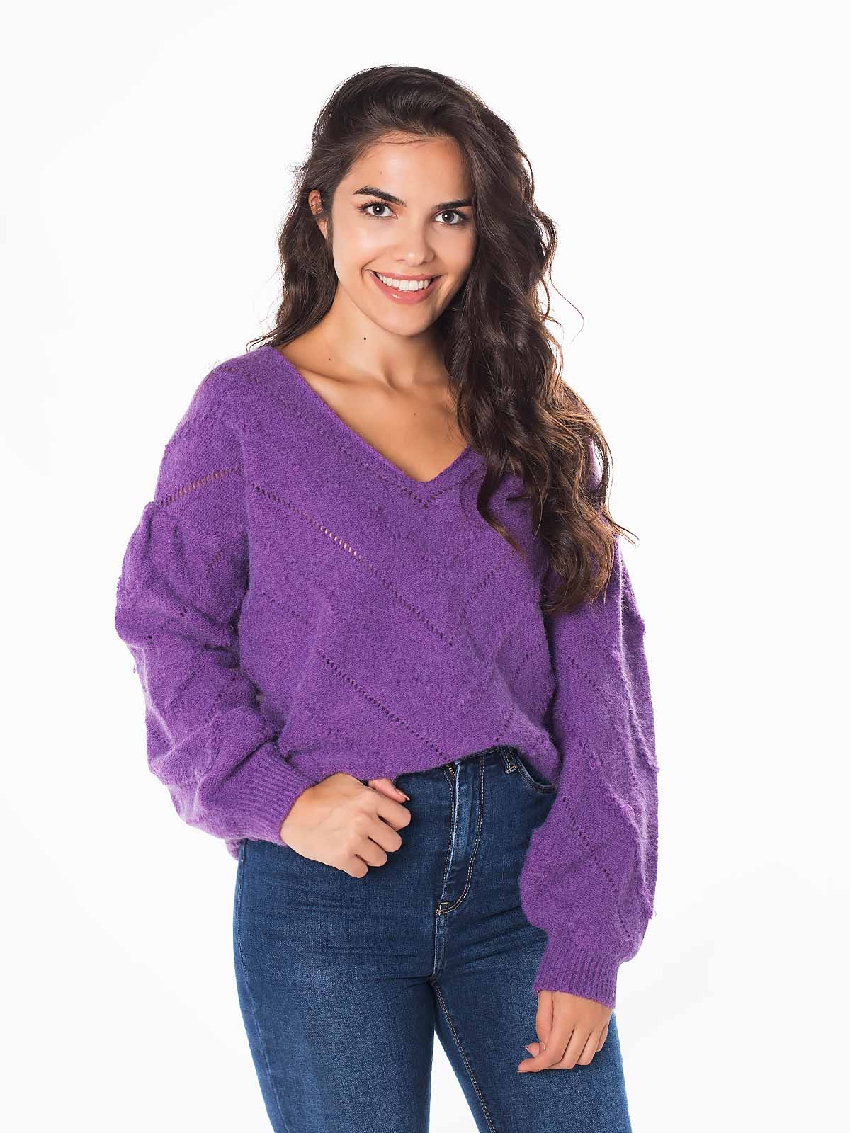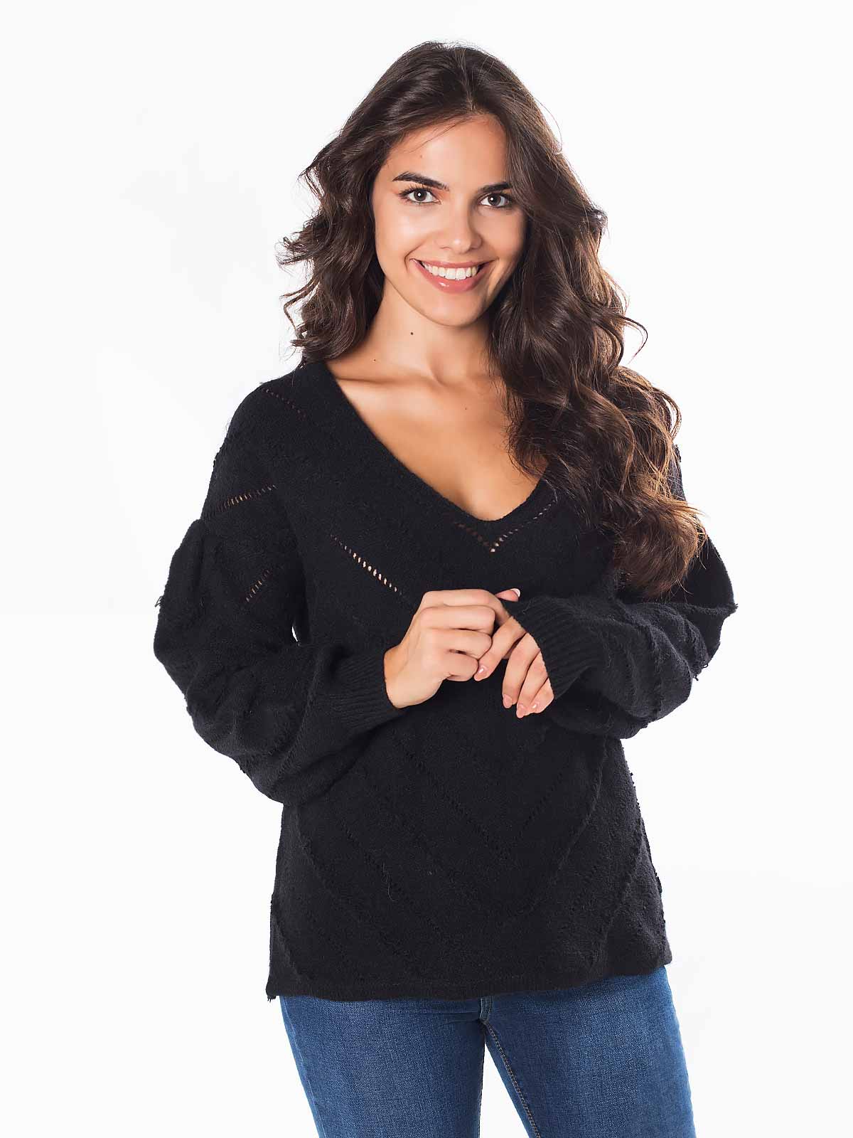 Camisola de malha trabalhada com decote em V. Camisola de manga comprida com ligeiro efeito balão. Punhos elásticos.