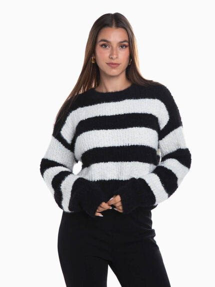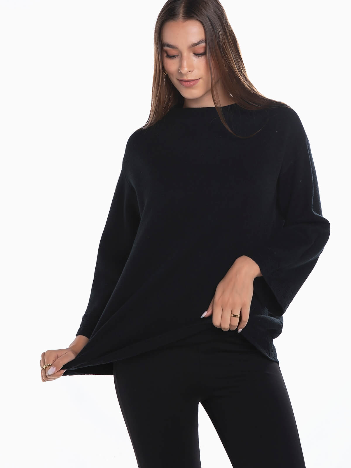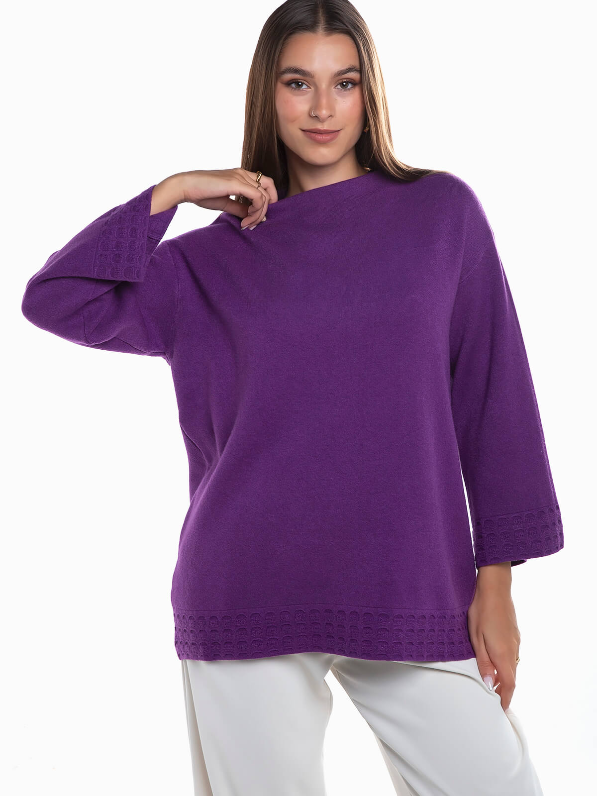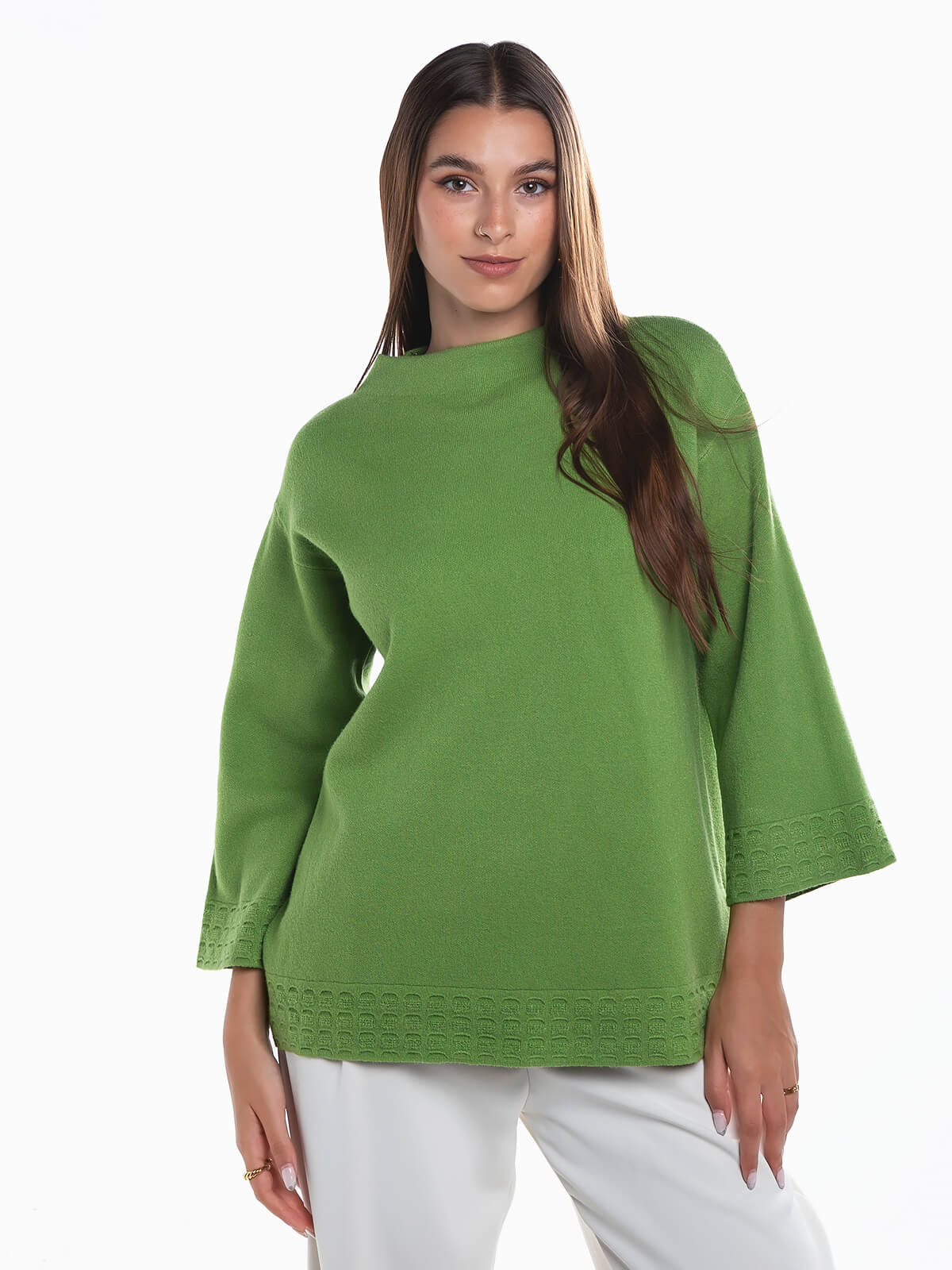 Camisola de malha larga toque suave trabalhada nos punhos e no inferior. Gola subida redonda. Manga 3/4.