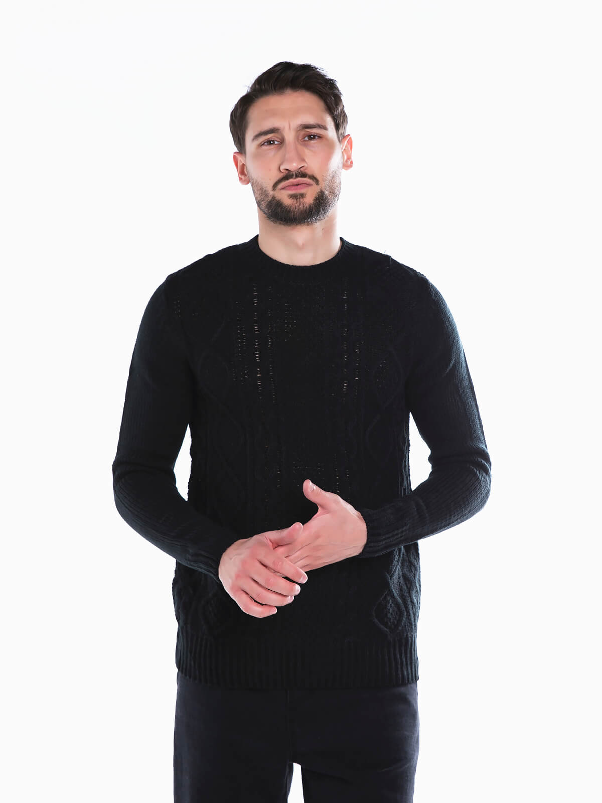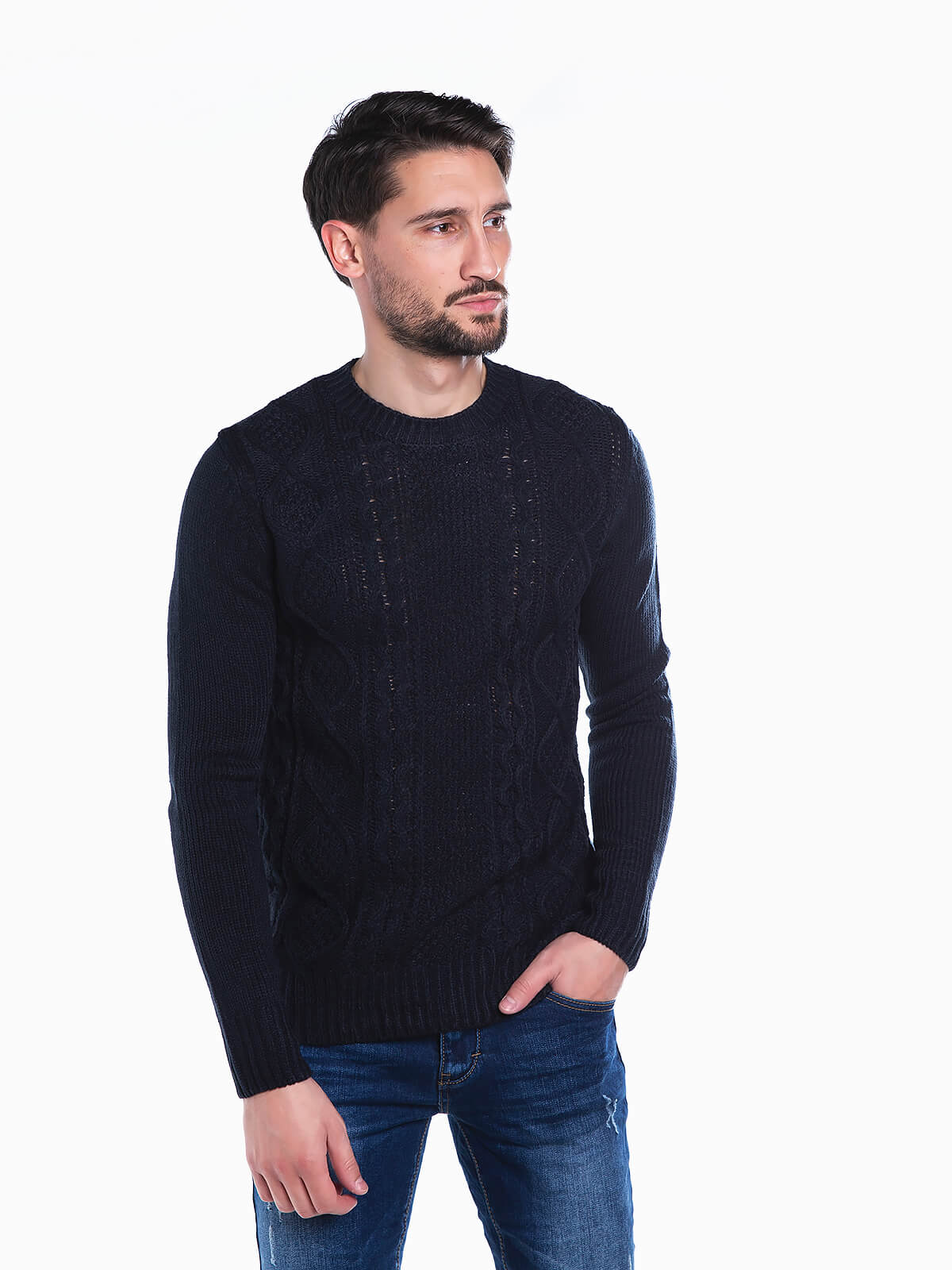 Camisola em malha trançada para homem. Camisola de manga comprida justa. Extremidades caneladas elásticas.