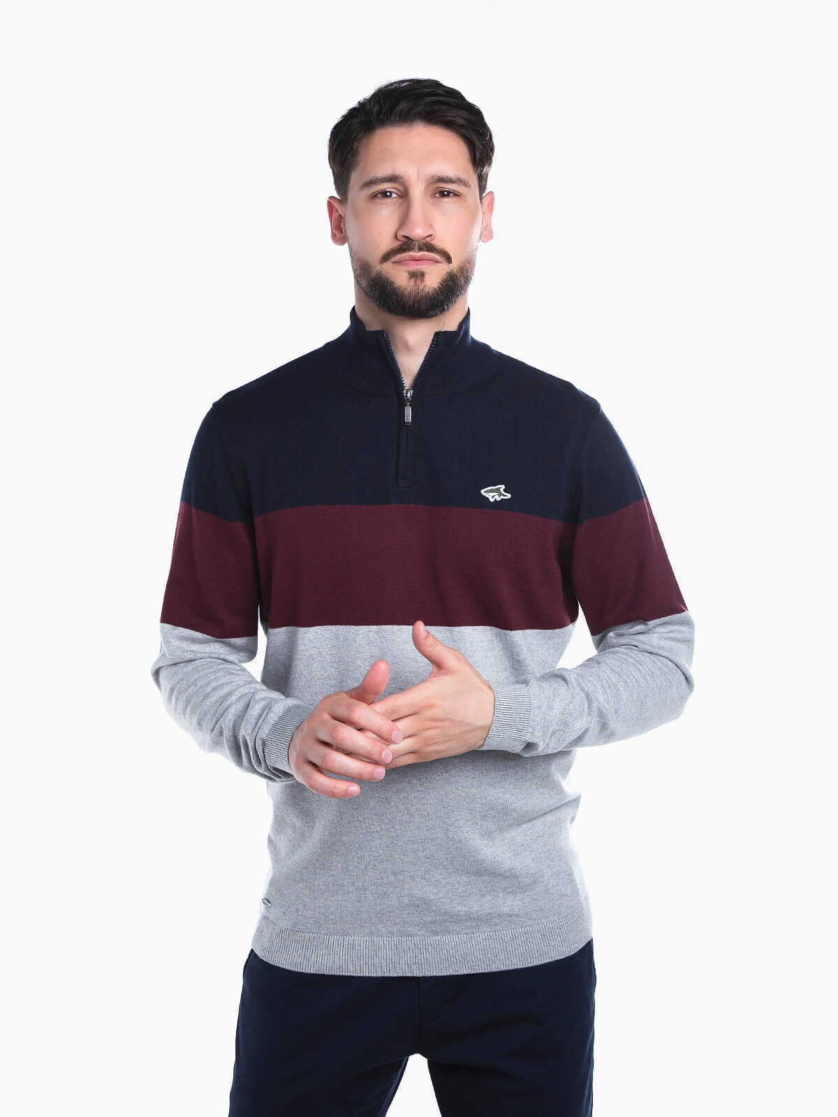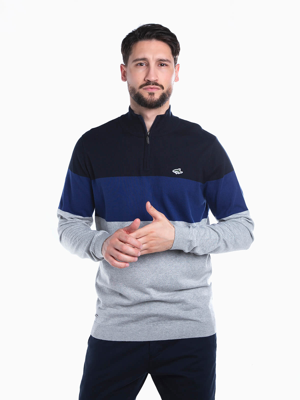 Camisola de malha tricolor com fecho na gola. Camisola de manga comprida em tecido 100% algodão com símbolo bordado no peito. Extremidades caneladas.