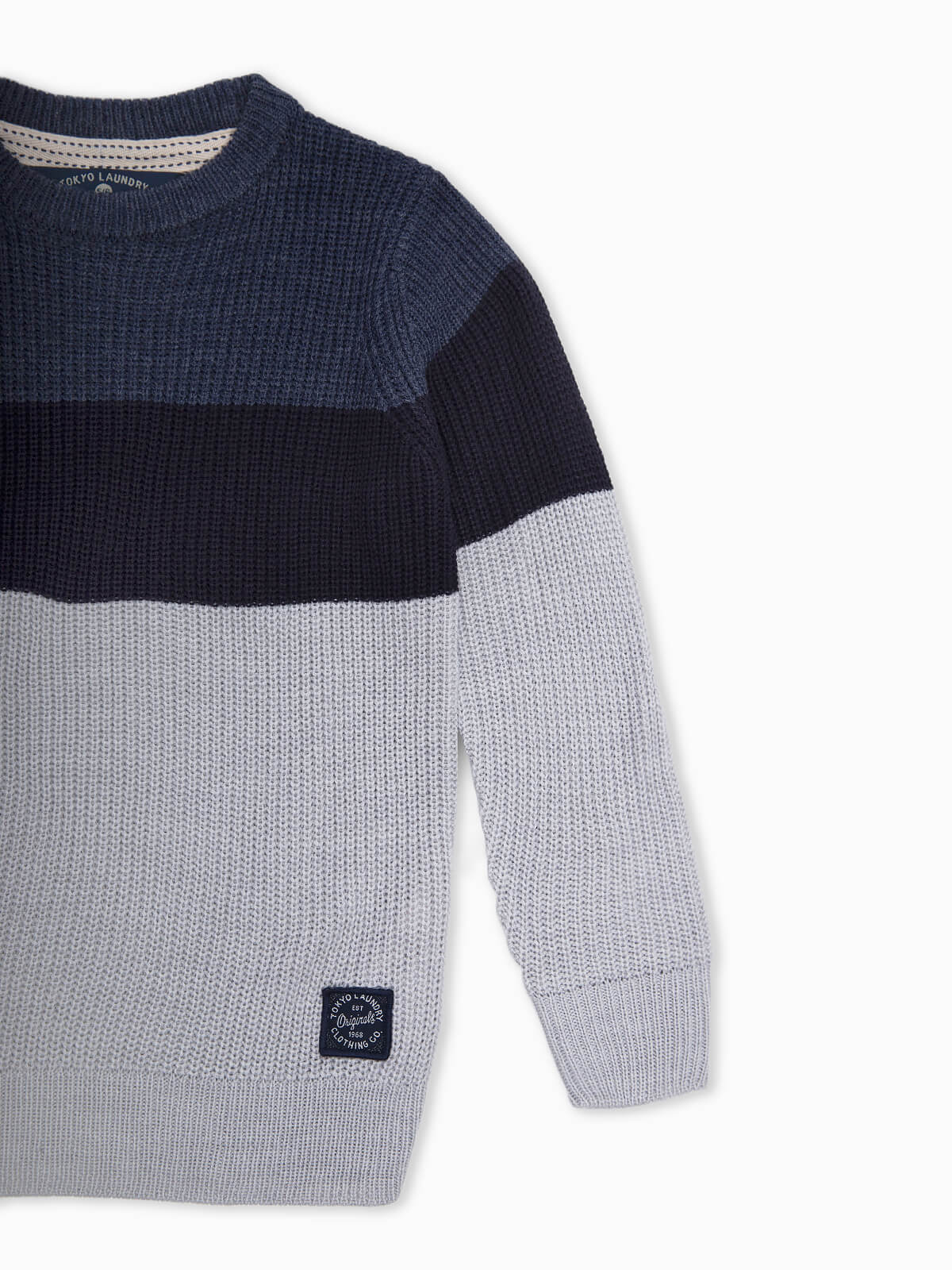 Camisola de malha tricolor para menino. Camisola de manga comprida com símbolo bordado na base. Gola redonda. Acabamentos em nervuras.