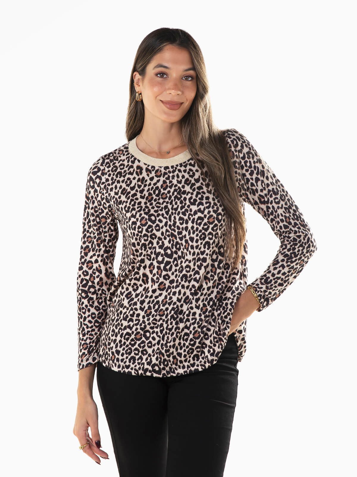 Camisola de manga comprida com estampado leopardo para senhora. Camisola de manga comprida com decote redondo em fios luréx para efeito brilhante.