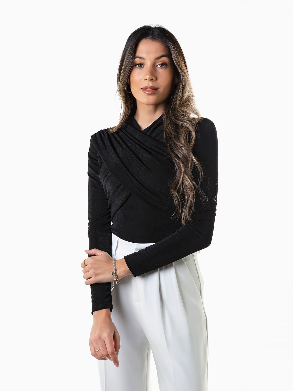 Camisola de manga comprida com decote drapeado cruzado à frente. Camisola justa elástica em tecido brilhante.
