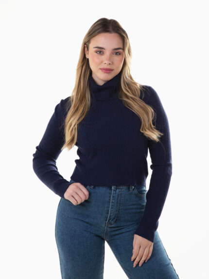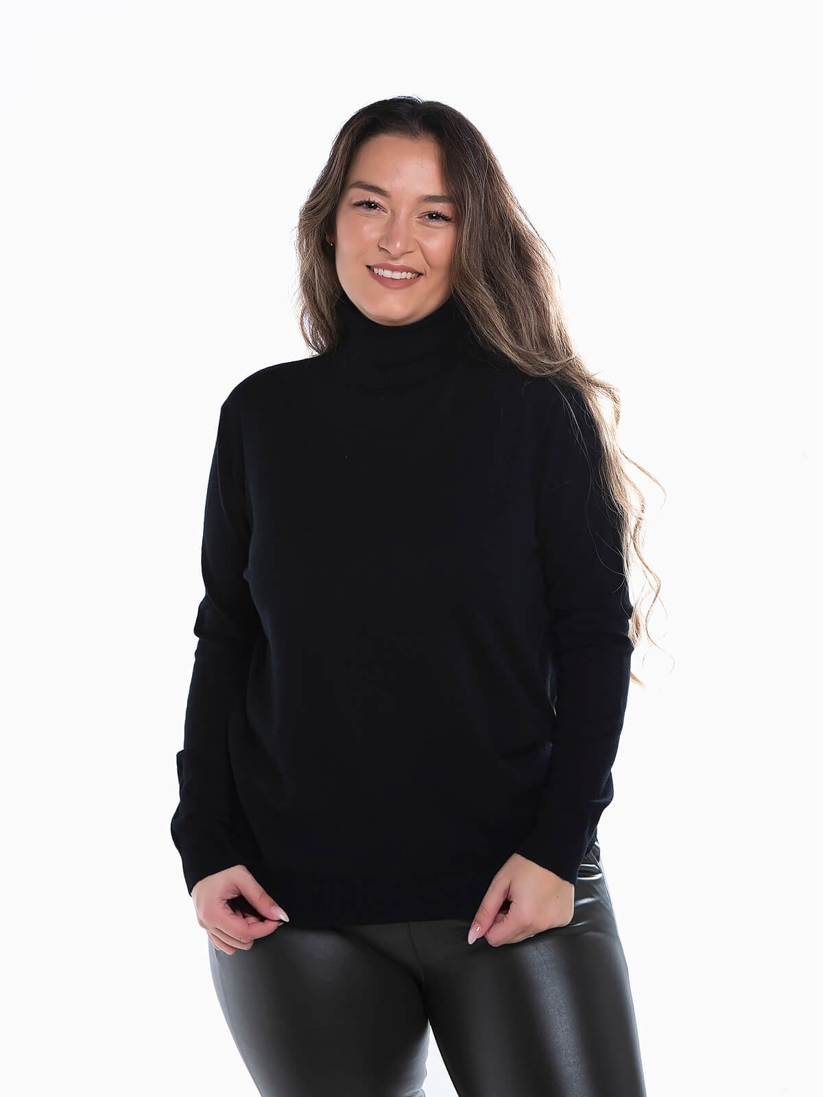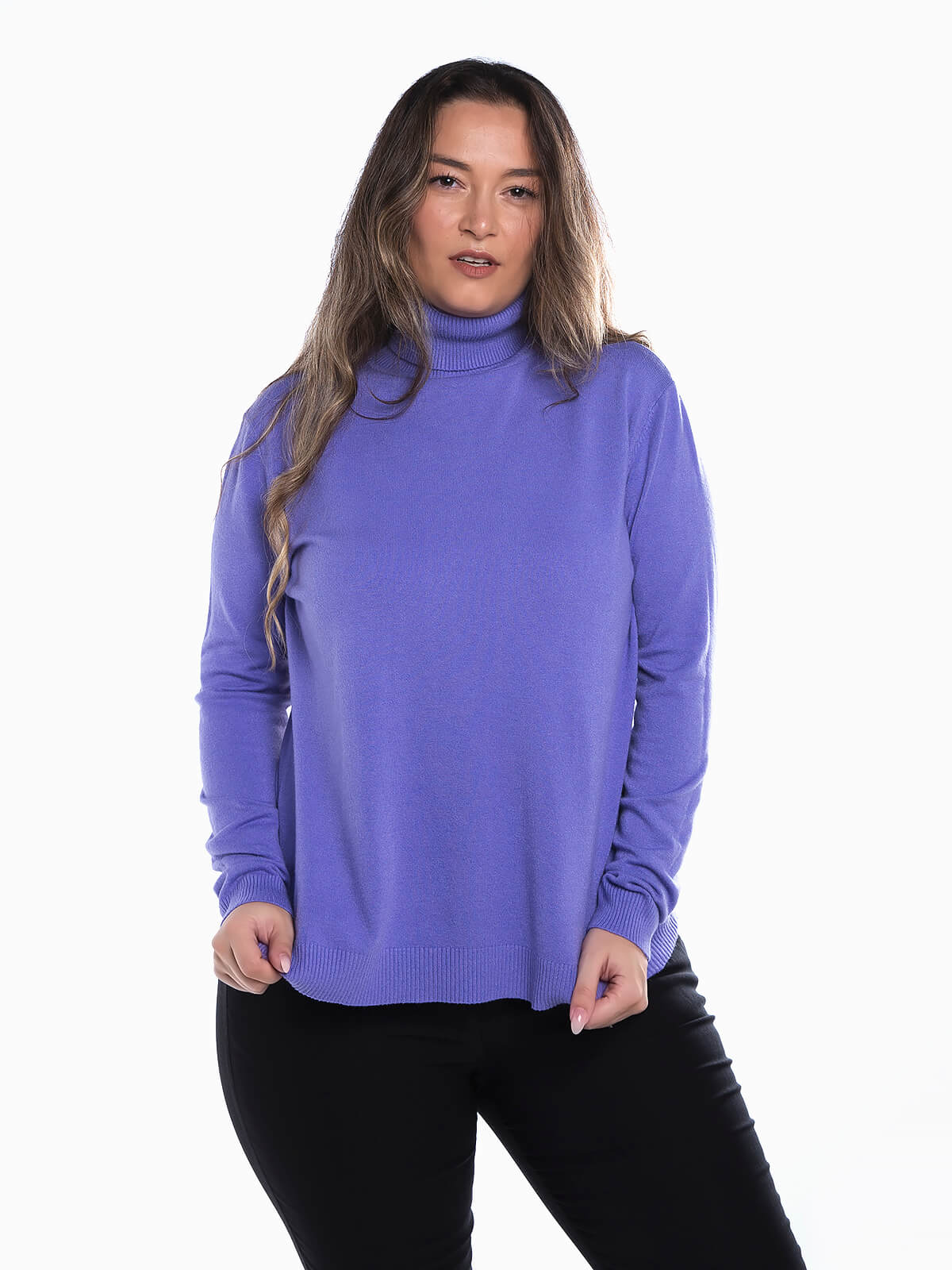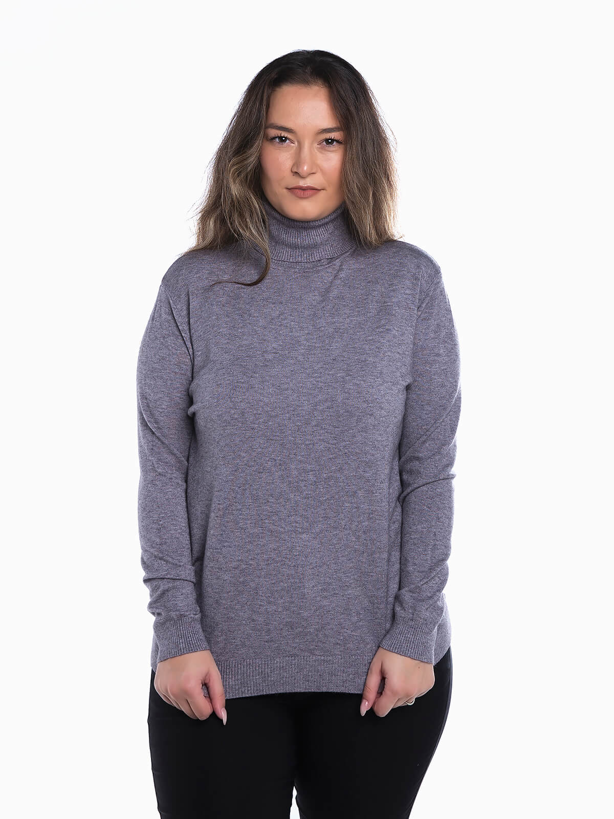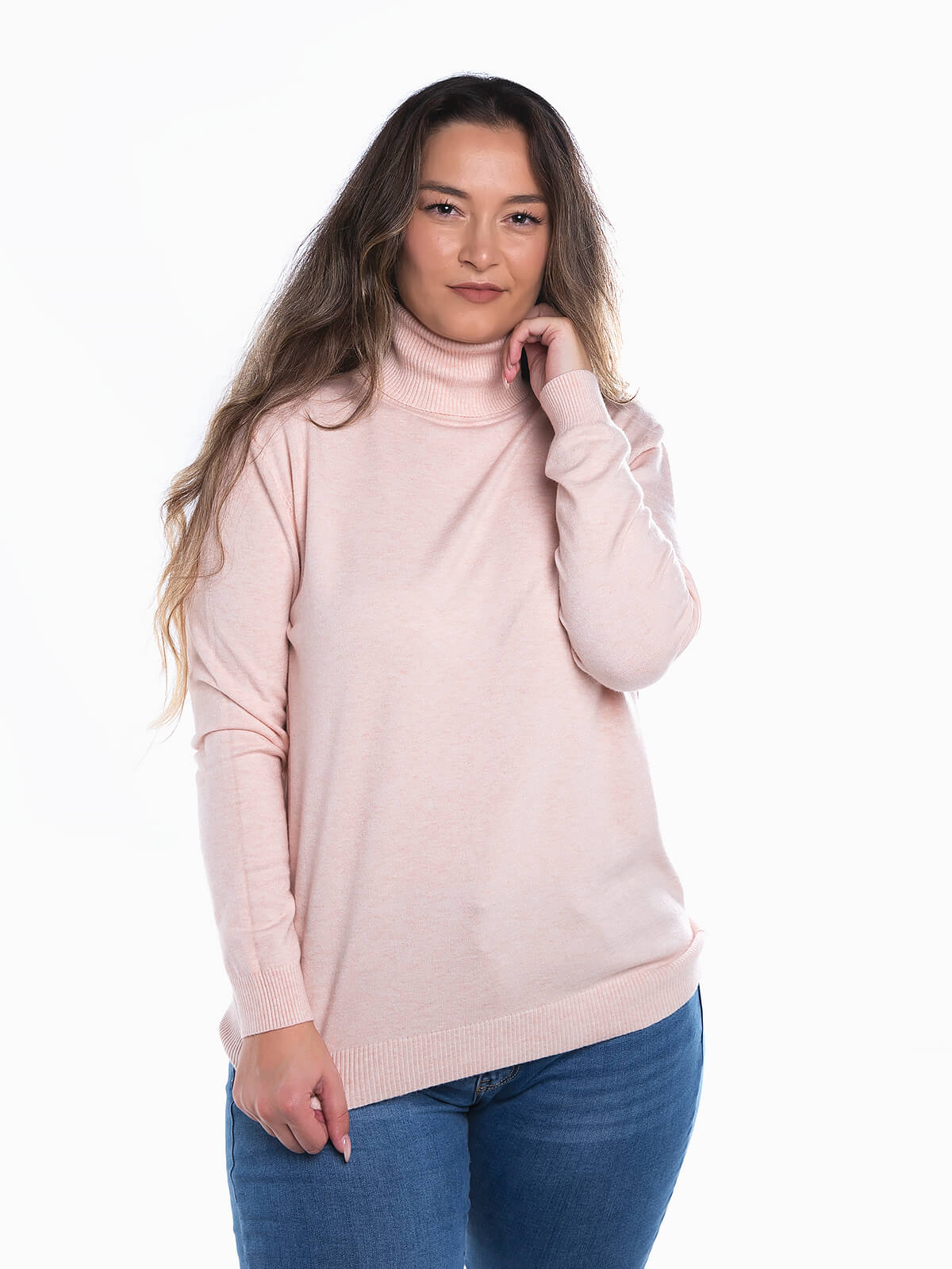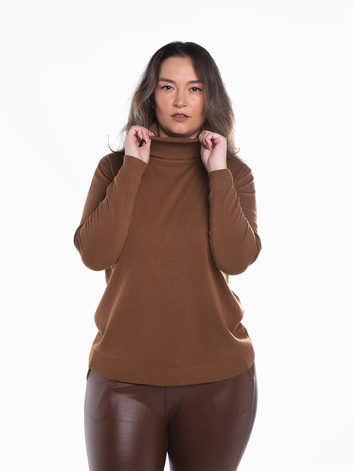 Camisola manga comprida com gola alta para senhora. Camisola de malha com acabamentos canelados.