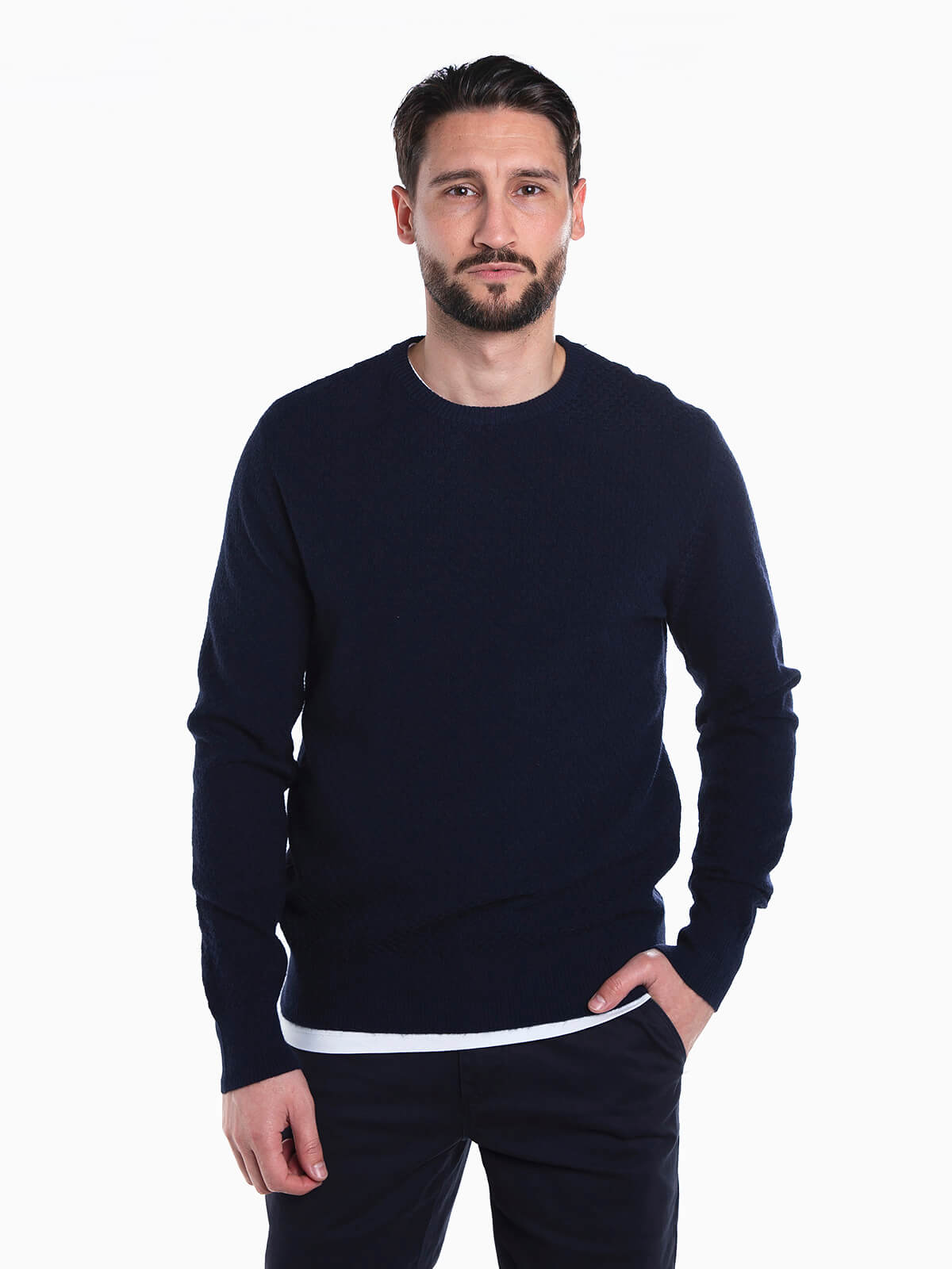 Camisola de manga comprida em malha estruturada para homem. Camisola com gola redonda e acabamentos em nervuras.