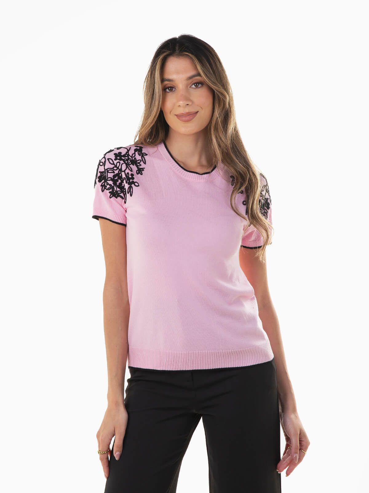 Camisola malha de manga curta com pormenores bordados nos ombros. Camisola para mulher com acabamentos canelados. Decote redondo.