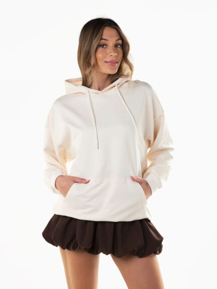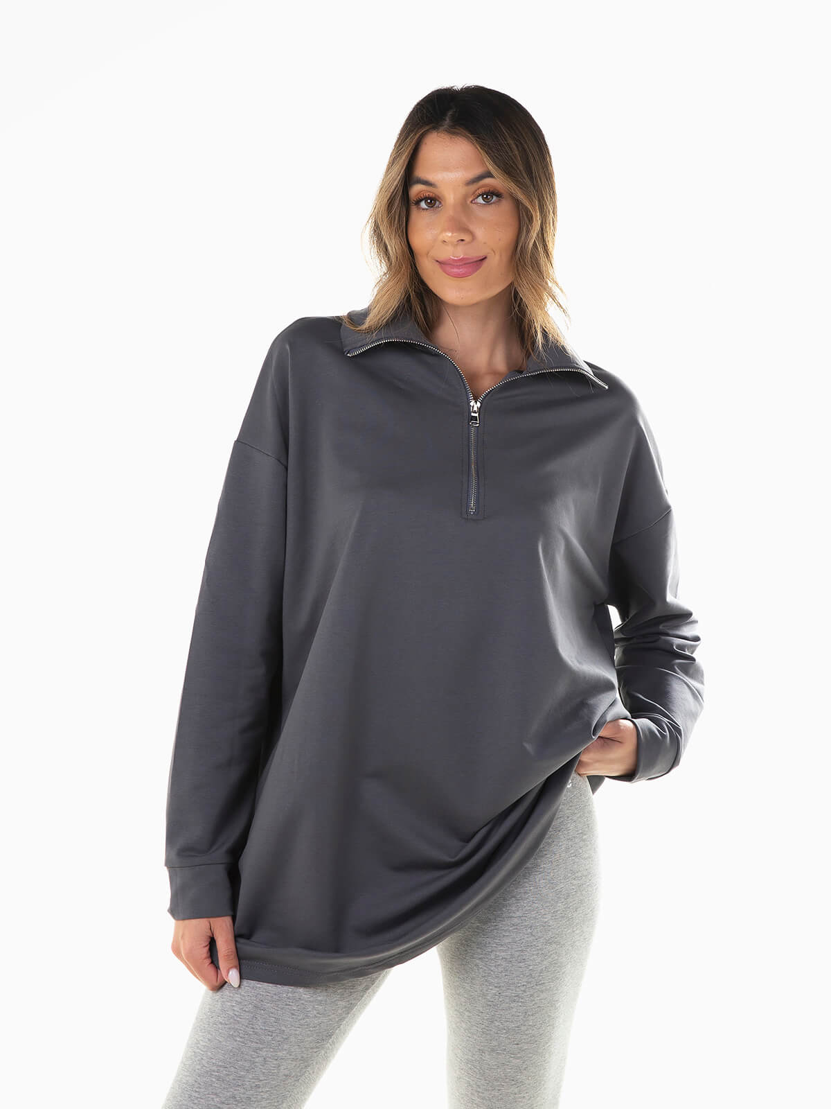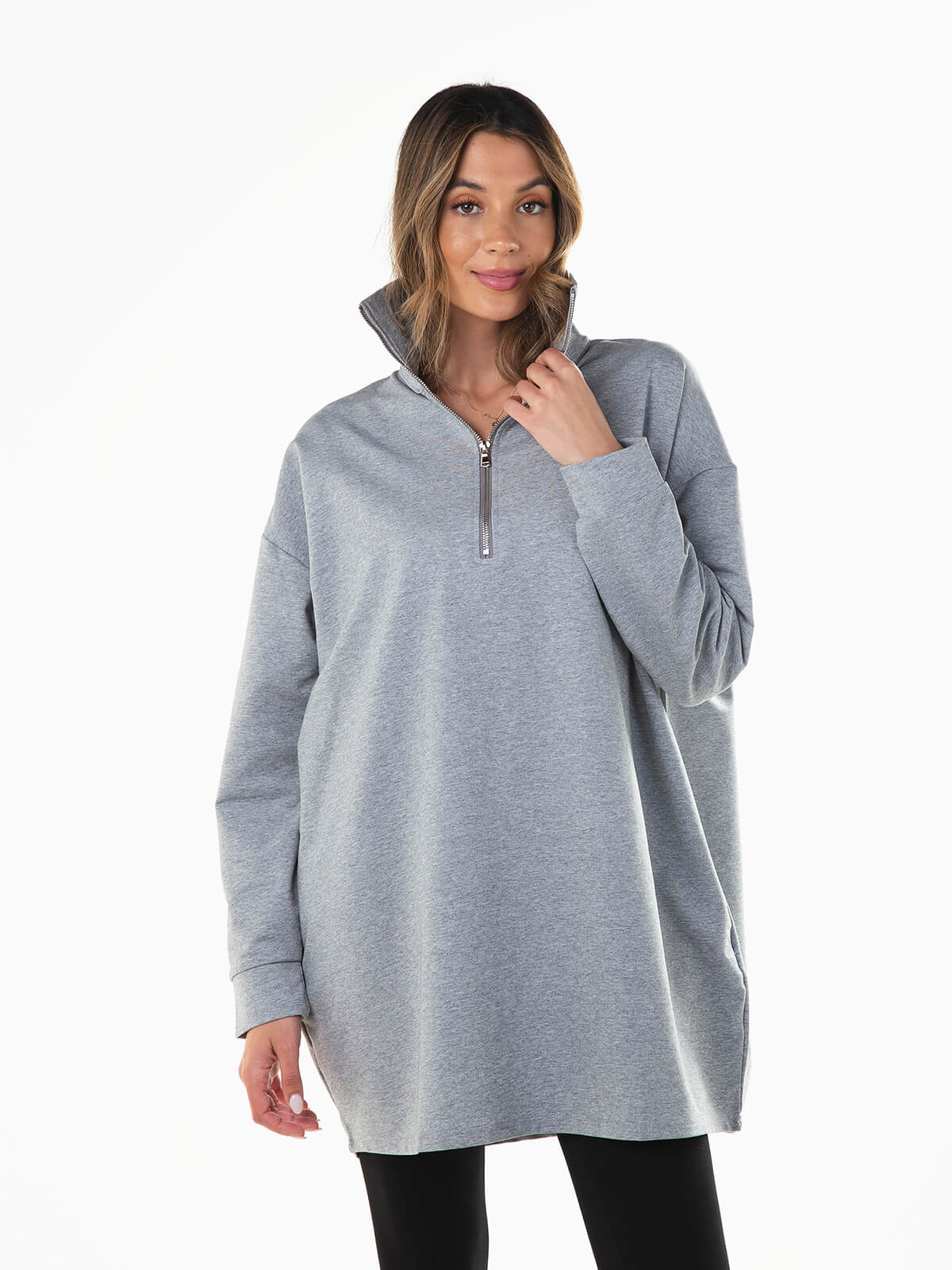 Camisola oversize felpa com gola alta e aperto de fecho zíper. Camisola de manga comprida com 2 bolsos laterais.