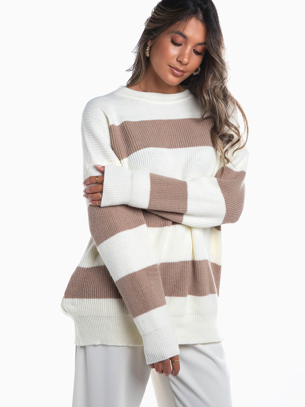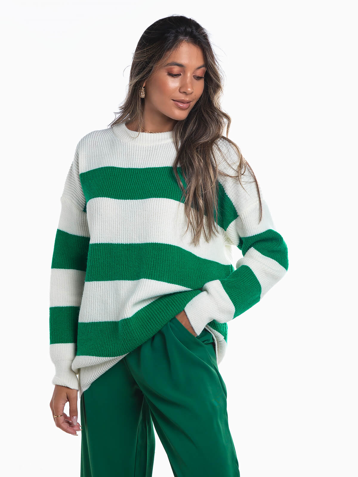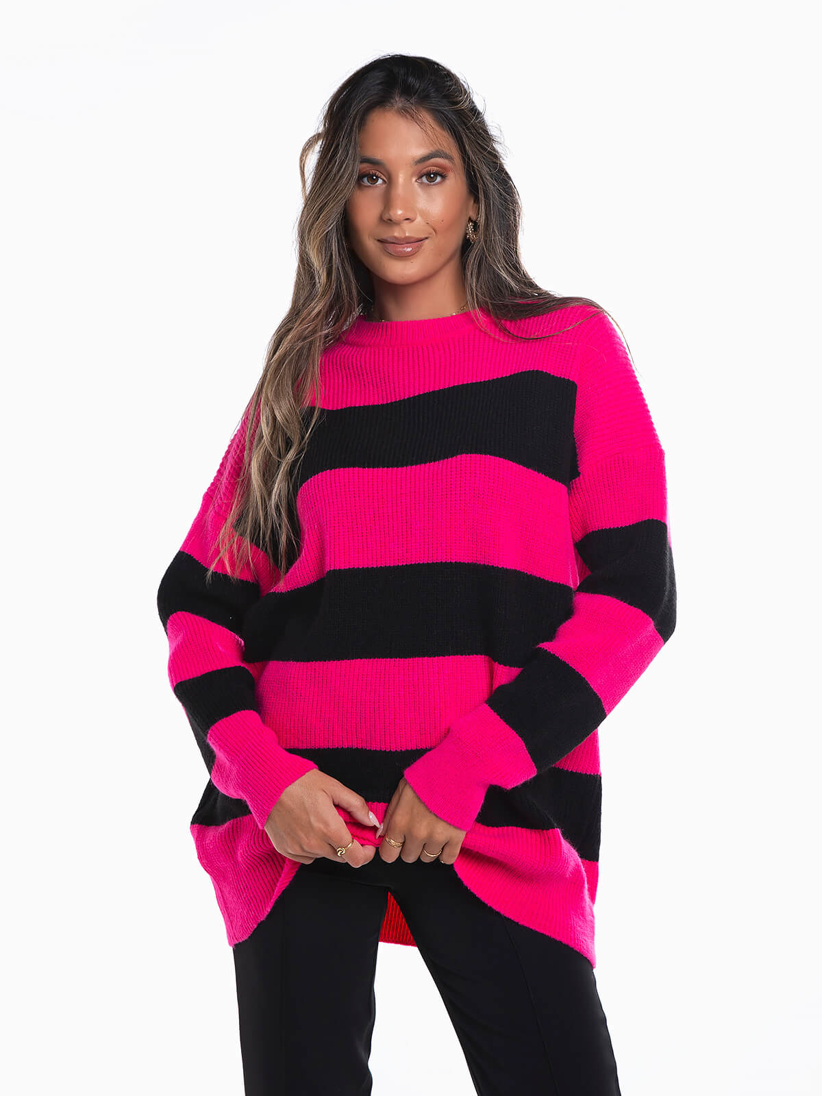 Camisola oversize em malha mistura lã com riscas para senhora. Camisola manga comprida com decote redondo.